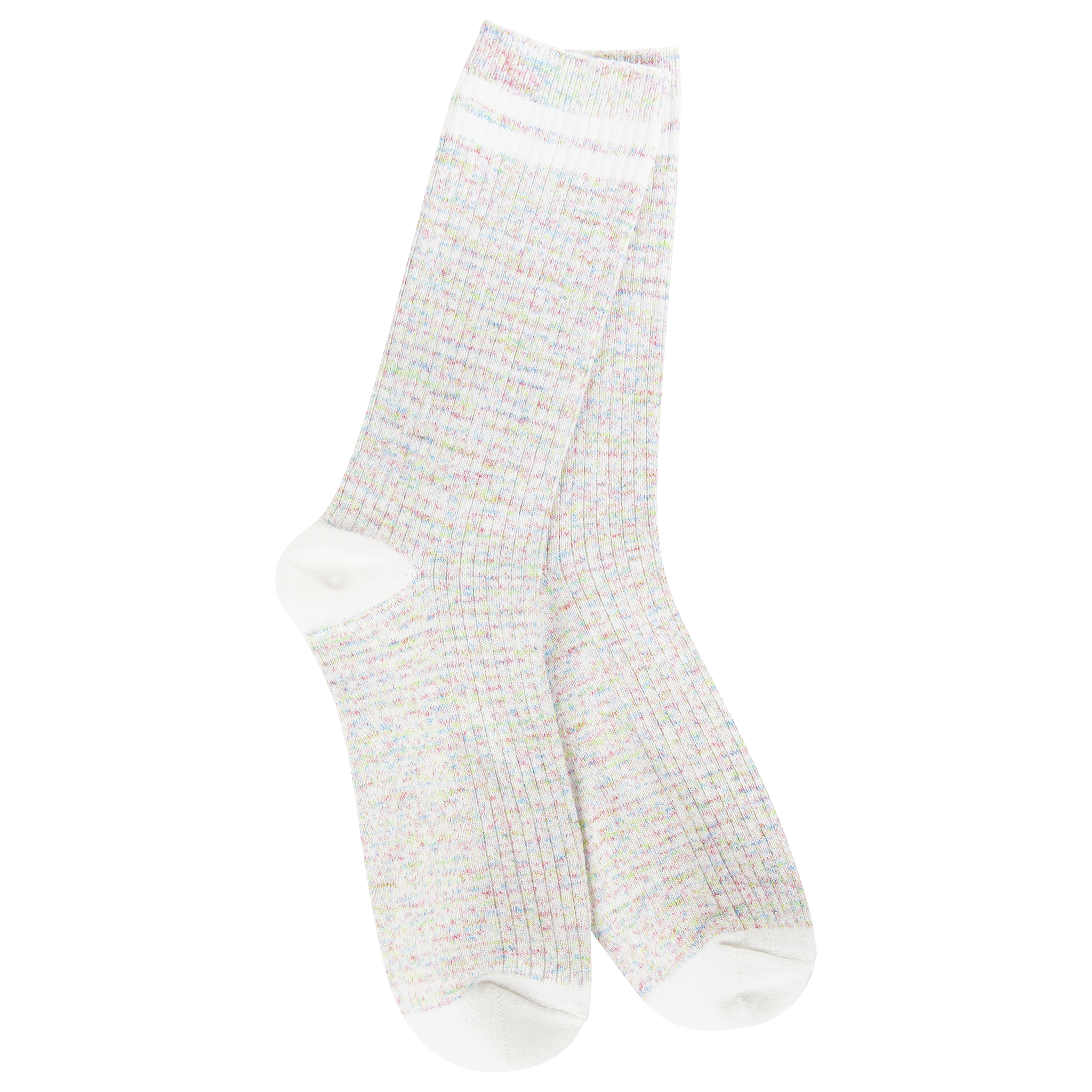 Soft, cozy, and party-ready, these lightweight crew socks feature a crisp white base with colorful confetti details and classic varsity stripes at the top. A fun, feel-good pair that adds a little celebration to your everyday comfort. 🎂🎉