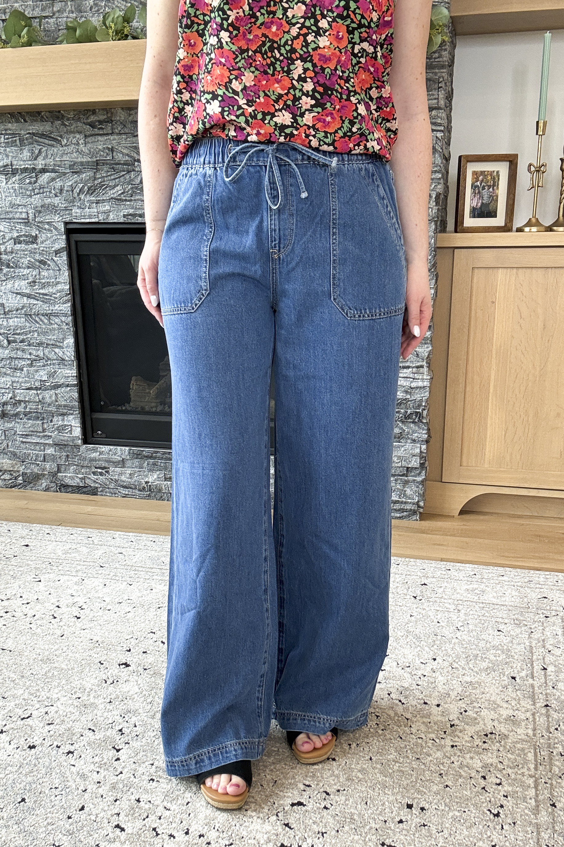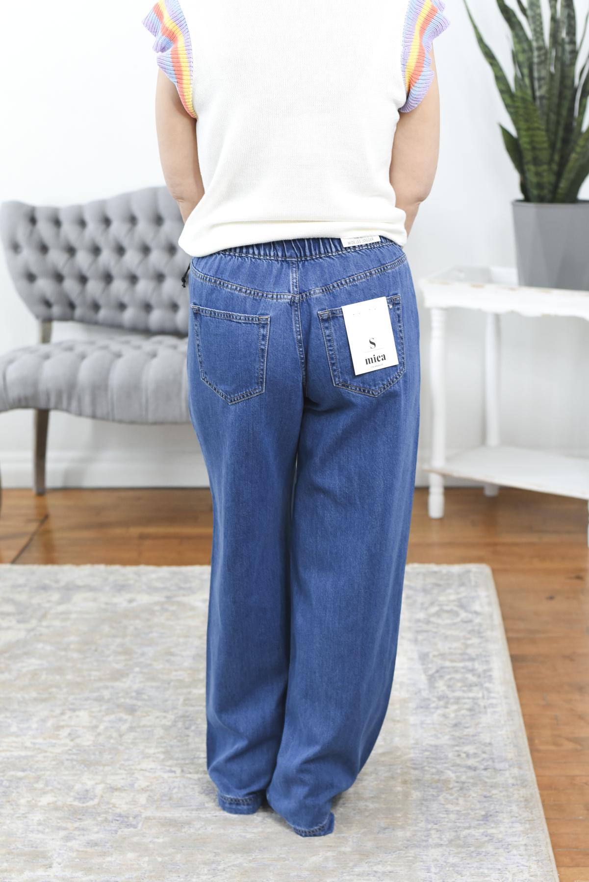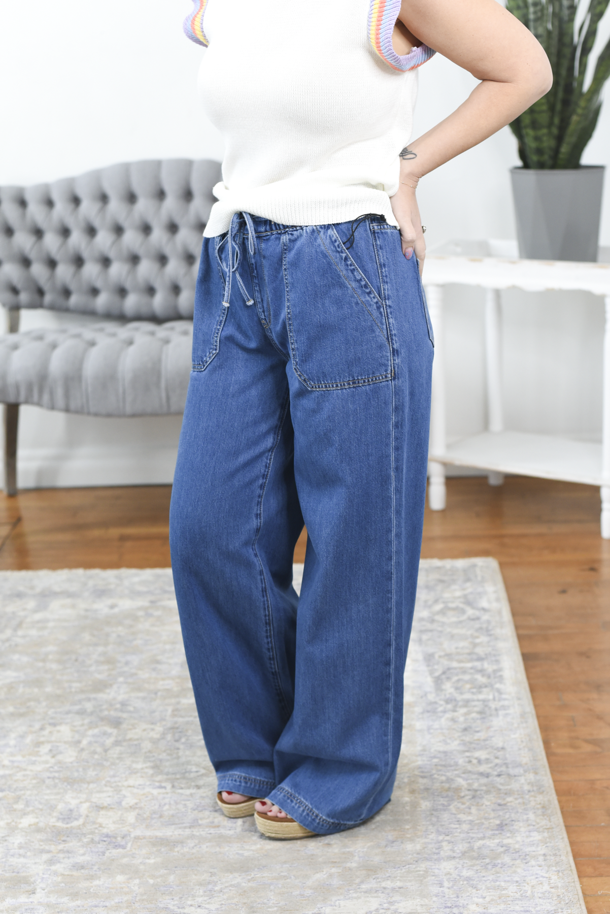 The Bridgete High Rise Wide Leg Mica Jeans are the definition of comfort-meets-style denim. Designed with a flattering high-rise fit, these medium wash jeans feature a stretchy elastic waistband with a functional tie waist for an easy, flexible fit. The lightweight, soft denim and wide leg silhouette keep them breezy and comfortable, while the patch pockets add a stylish, laid-back touch. Effortless, flattering, and ultra comfortable, these are the jeans you’ll want to live in.