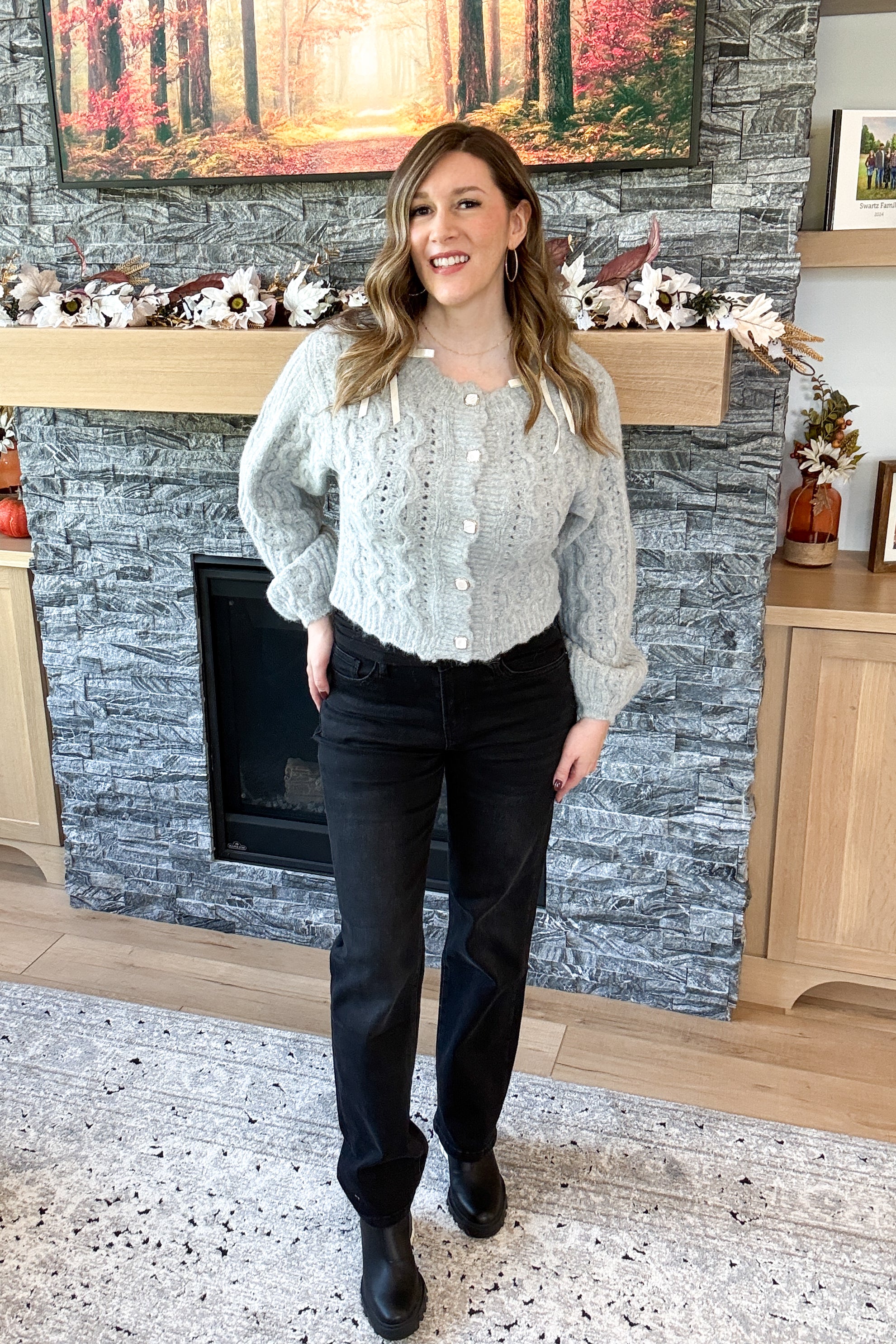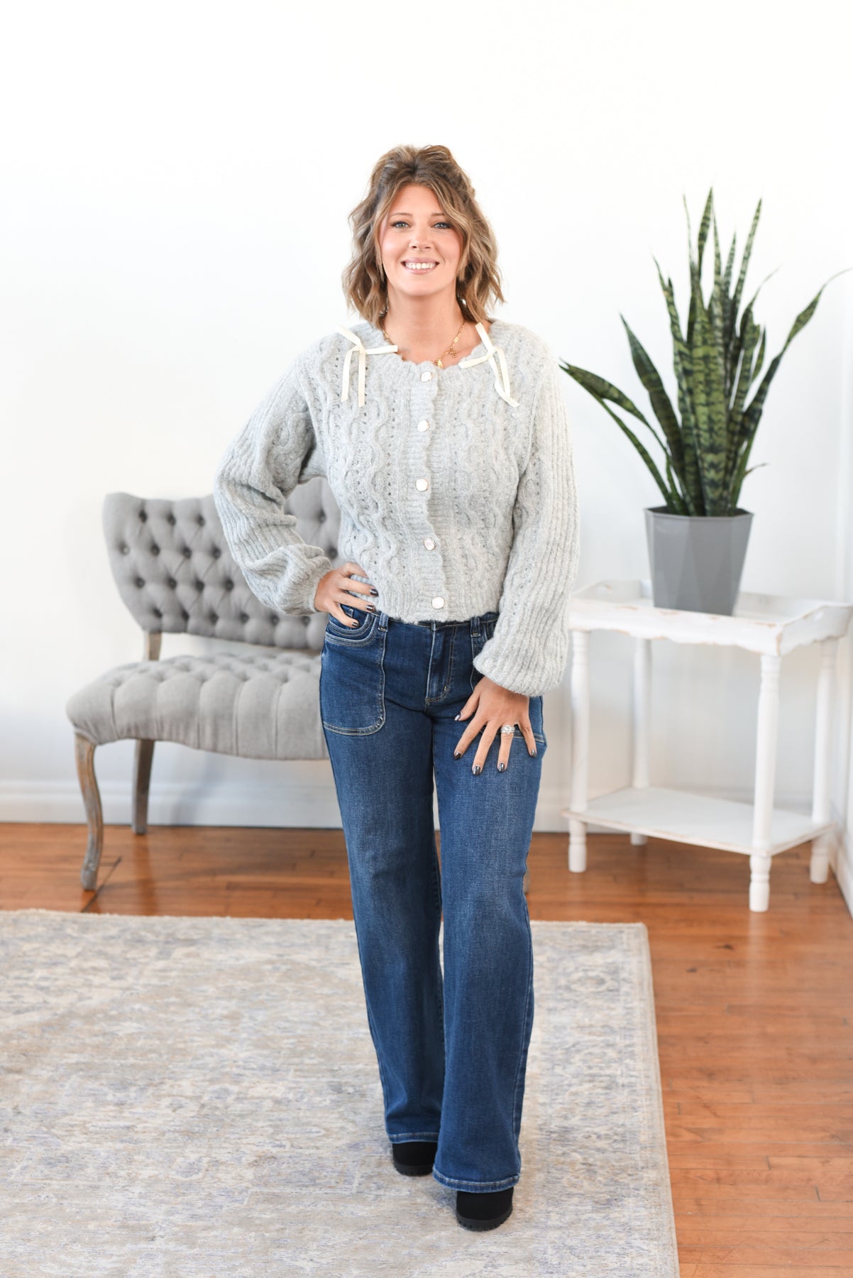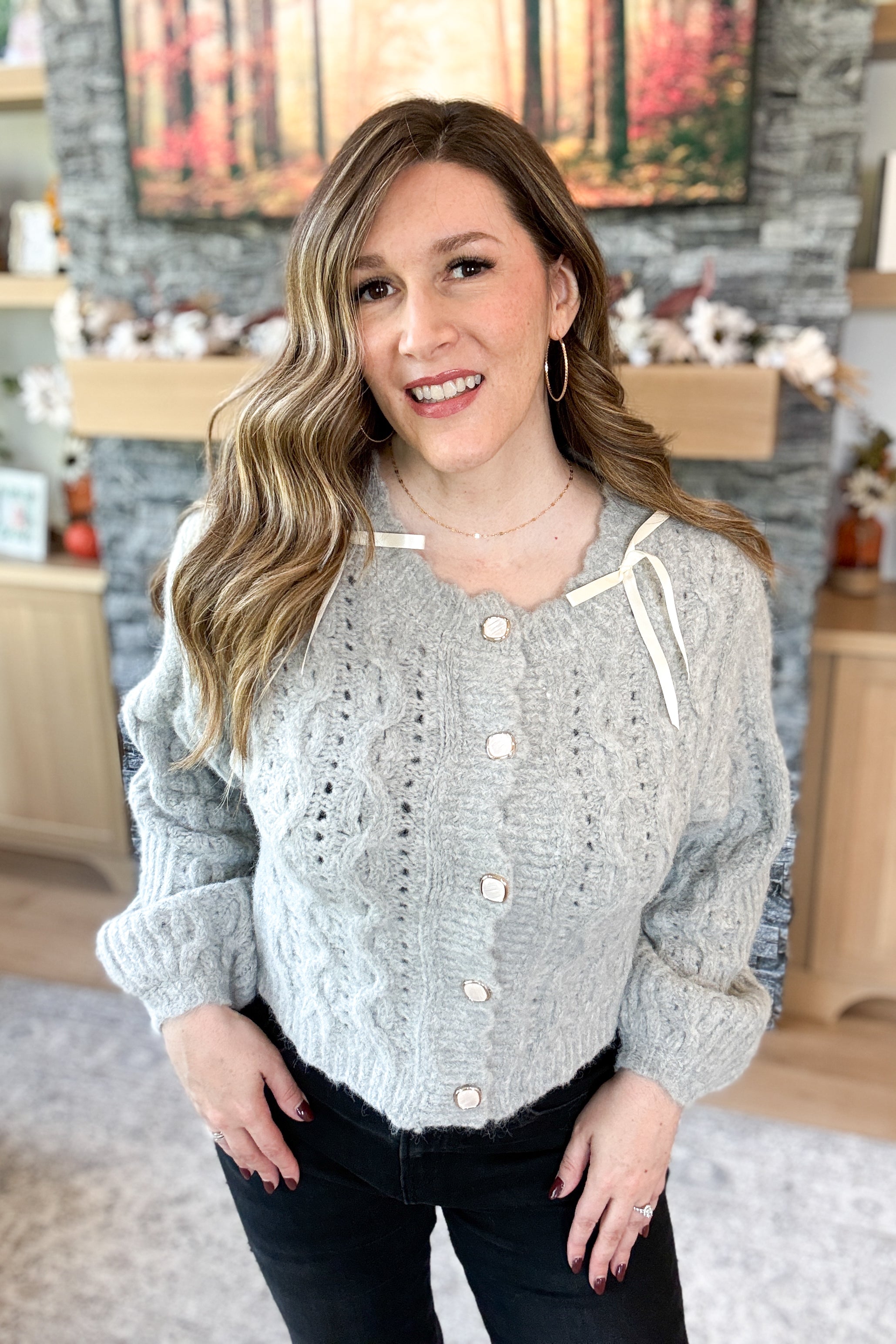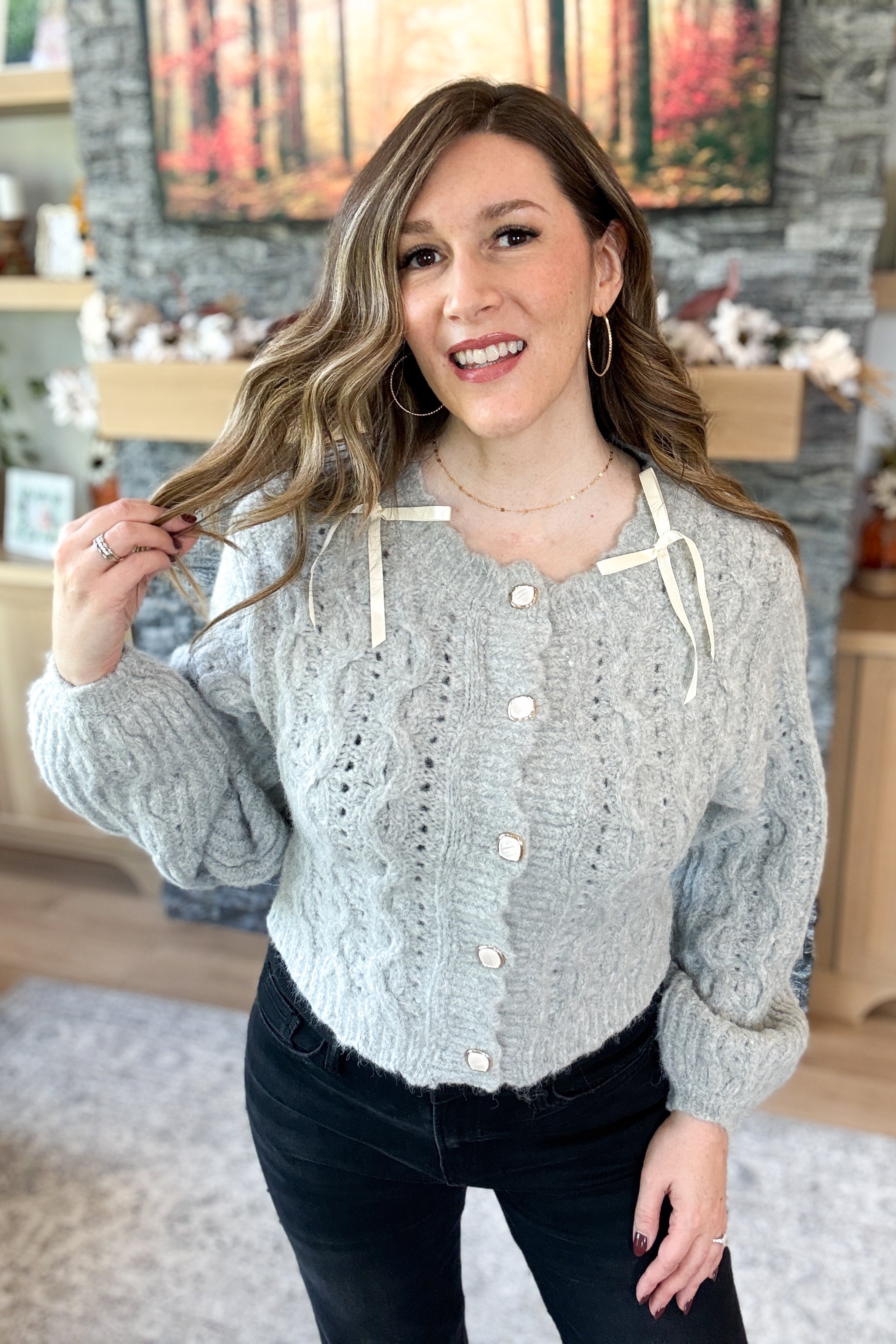 The Amelie Scallop Pattern Ribbon Bow Sweater Cardigan is soft, feminine, and full of charm. Crafted from stretchy sweater knit in light grey, it features delicate scalloped details, mother-of-pearl buttons, and sweet ribbon bows that add a flirty, vintage-inspired touch. Perfect for date nights, brunch, or dressing up your everyday look. Styling tip: Pair the Amelie Cardigan with high-rise denim and ballet flats for an effortlessly romantic vibe.