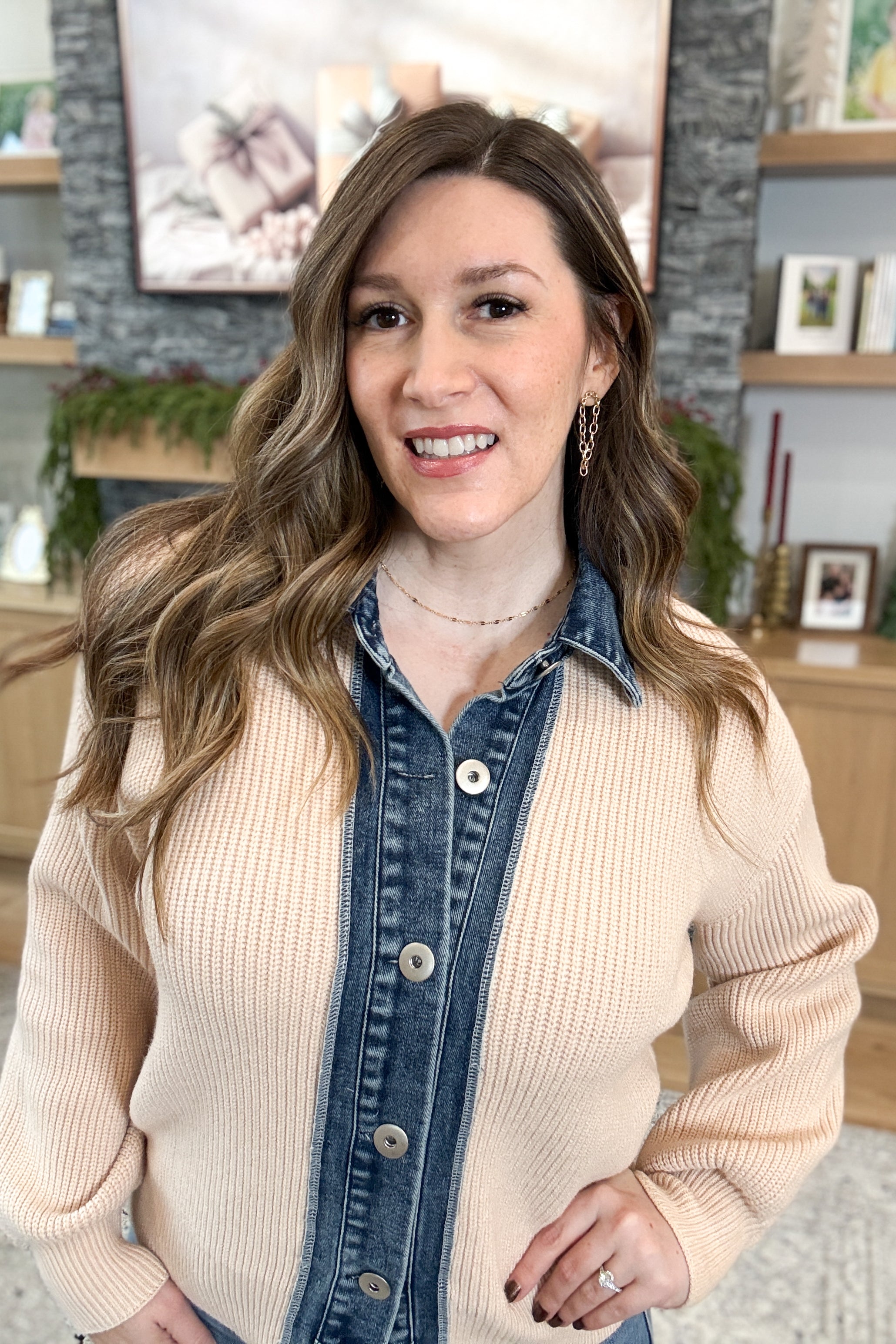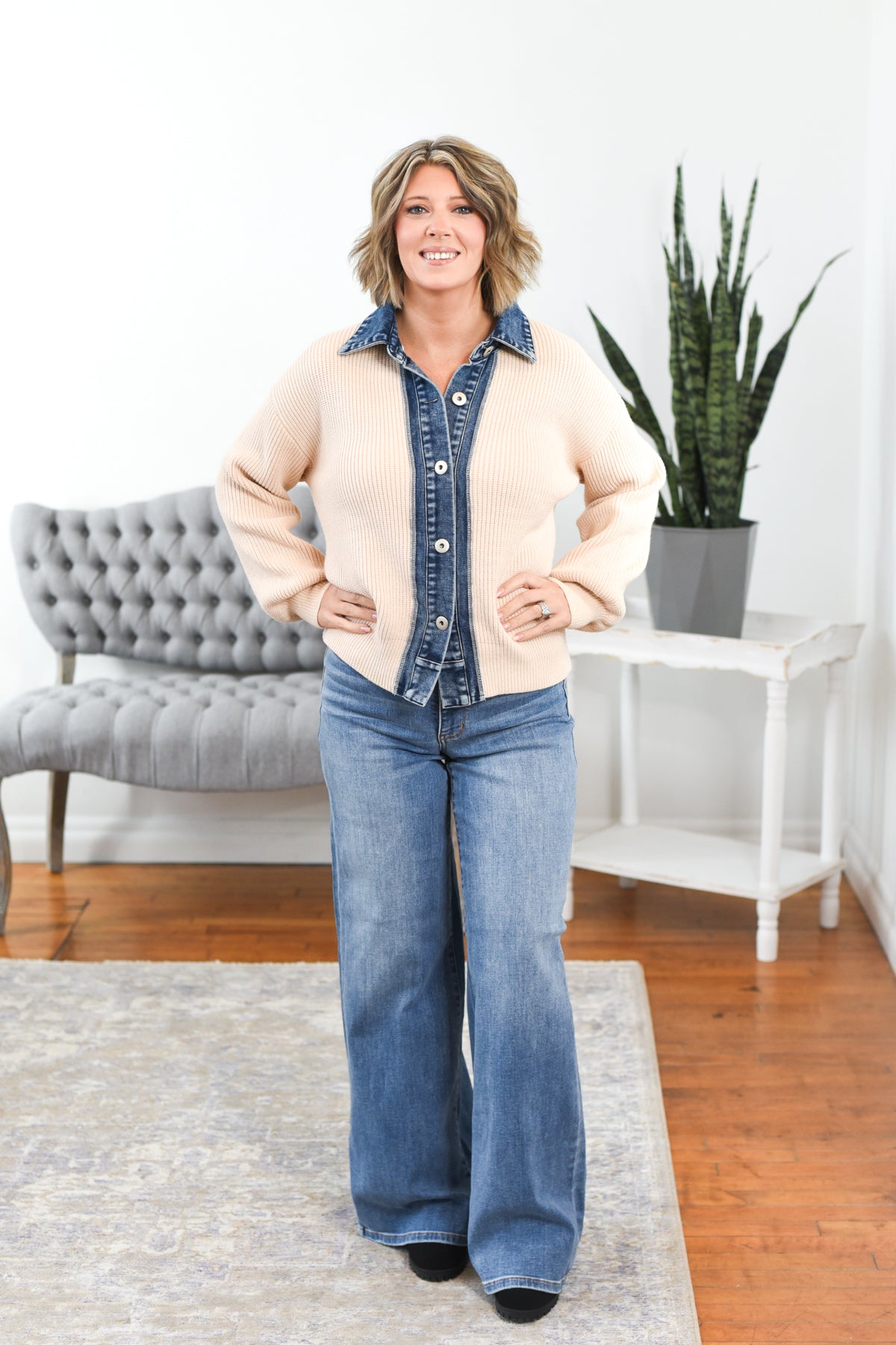 The Dannie Denim Contrast Cardigan is where cozy knitwear meets denim edge. This relaxed-fit button-down features soft, stretchy sweater knit contrasted with smooth denim detailing on the collar and sleeves, plus silver buttons for a touch of shine. With its balloon sleeves and effortless silhouette, it’s the perfect blend of casual and statement-making. Styling tip: Pair the Dannie Cardigan with black denim and boots for an easy, trend-forward look.