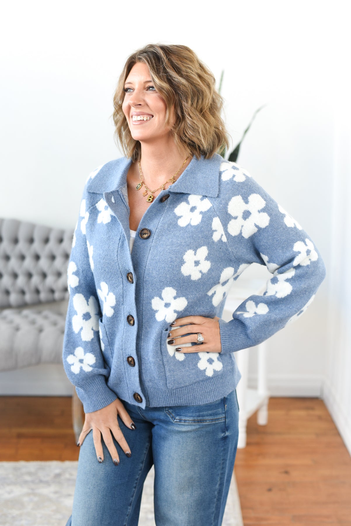 The Diane Daisy Button Down Cardigan is cheerful, soft, and effortlessly wearable year-round. Crafted from ultra-cozy sweater knit fabric in a pretty blue hue with white floral accents, it features a classic collar, front pockets, and a full button-down design. The perfect mix of cute and comfy for any season. Styling tip: Pair the Diane Cardigan with white denim and sneakers for a fresh, everyday look.