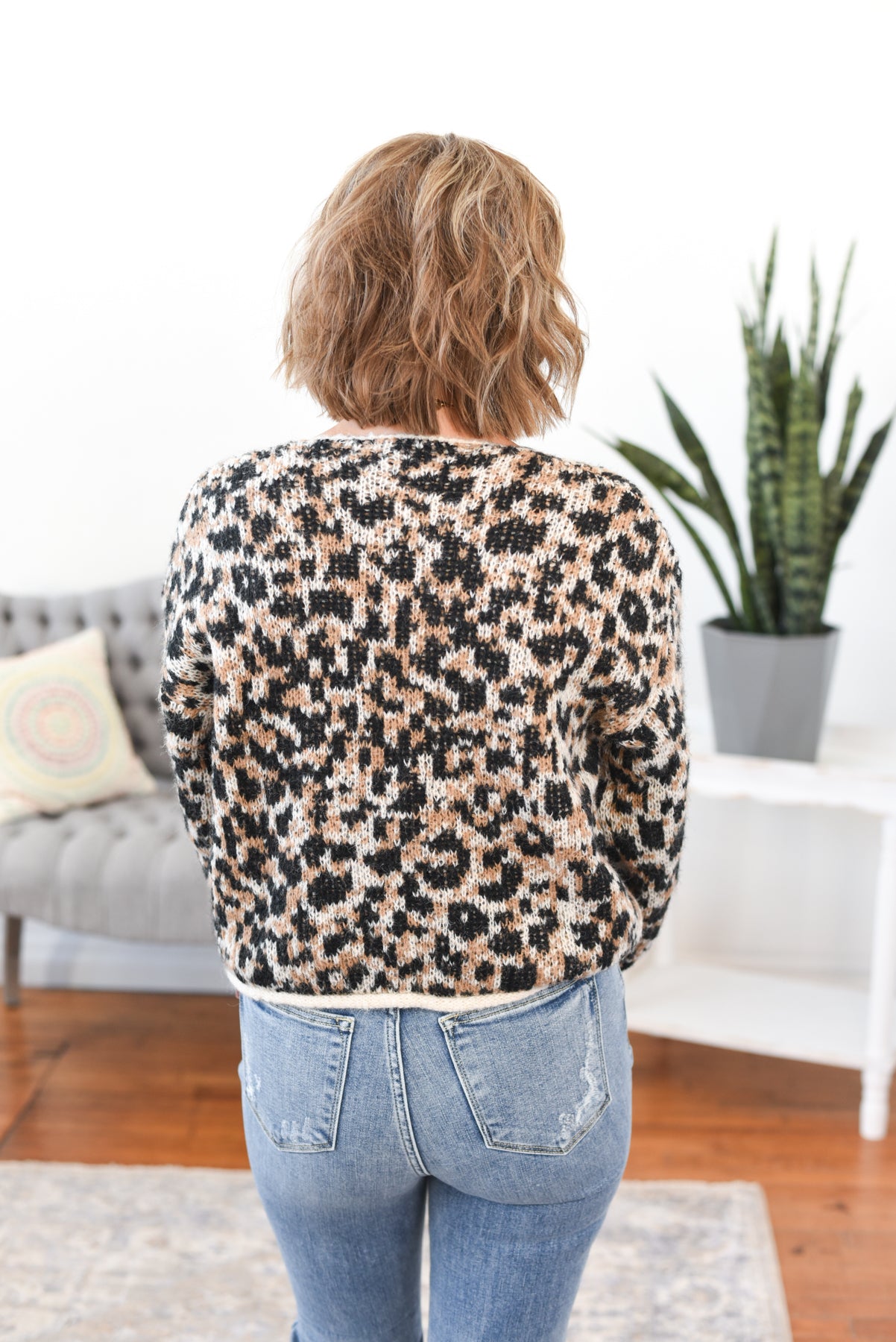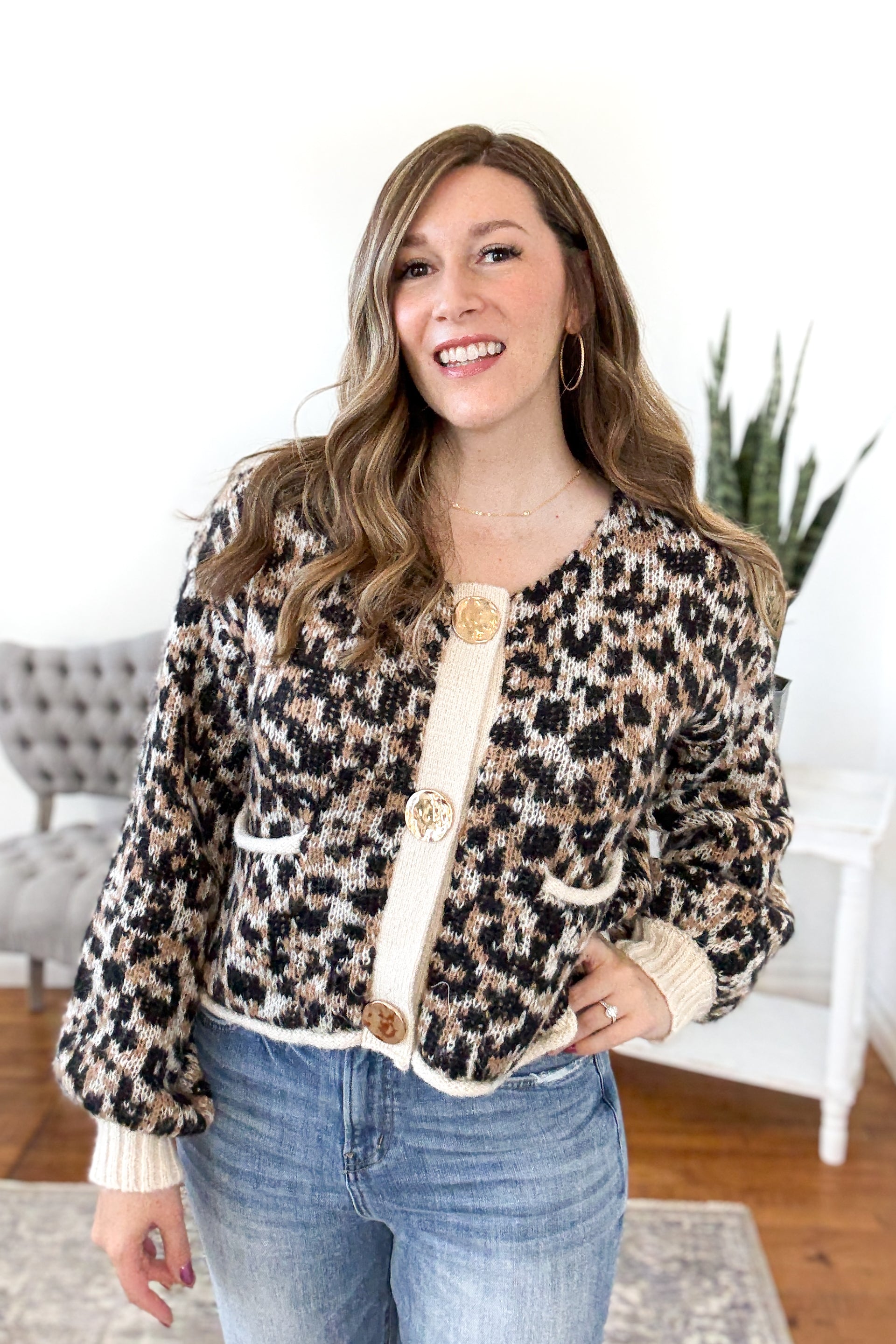 The Florence Animal Print Cardigan is where bold meets cozy in the best way. Made from a soft sweater knit fabric, this waist-length cardigan features a striking animal print balanced with solid color trim for a touch of structure. The standout gold hammered button detail adds a luxe, eye-catching finish that instantly elevates your look. It's the perfect layer for adding personality to your fall lineup. Styling tip: Pair with high rise jeans and a tucked-in cami for a look that’s effortlessly chic with just the right amount of wild.