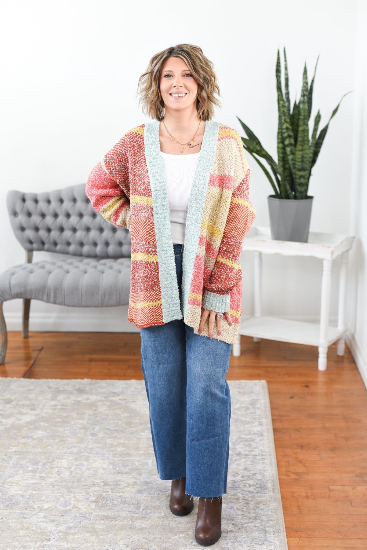 The Valerie Abstract Striped Cardigan is soft, bold, and made to brighten your day. Crafted from buttery-soft, stretchy sweater knit, it features vibrant spring colors and an eye-catching abstract stripe design that instantly elevates any outfit. Cheerful, cozy, and perfect for transitional weather. Styling tip: Layer the Valerie over a white tee with denim and sneakers for an effortless pop-of-color spring look.