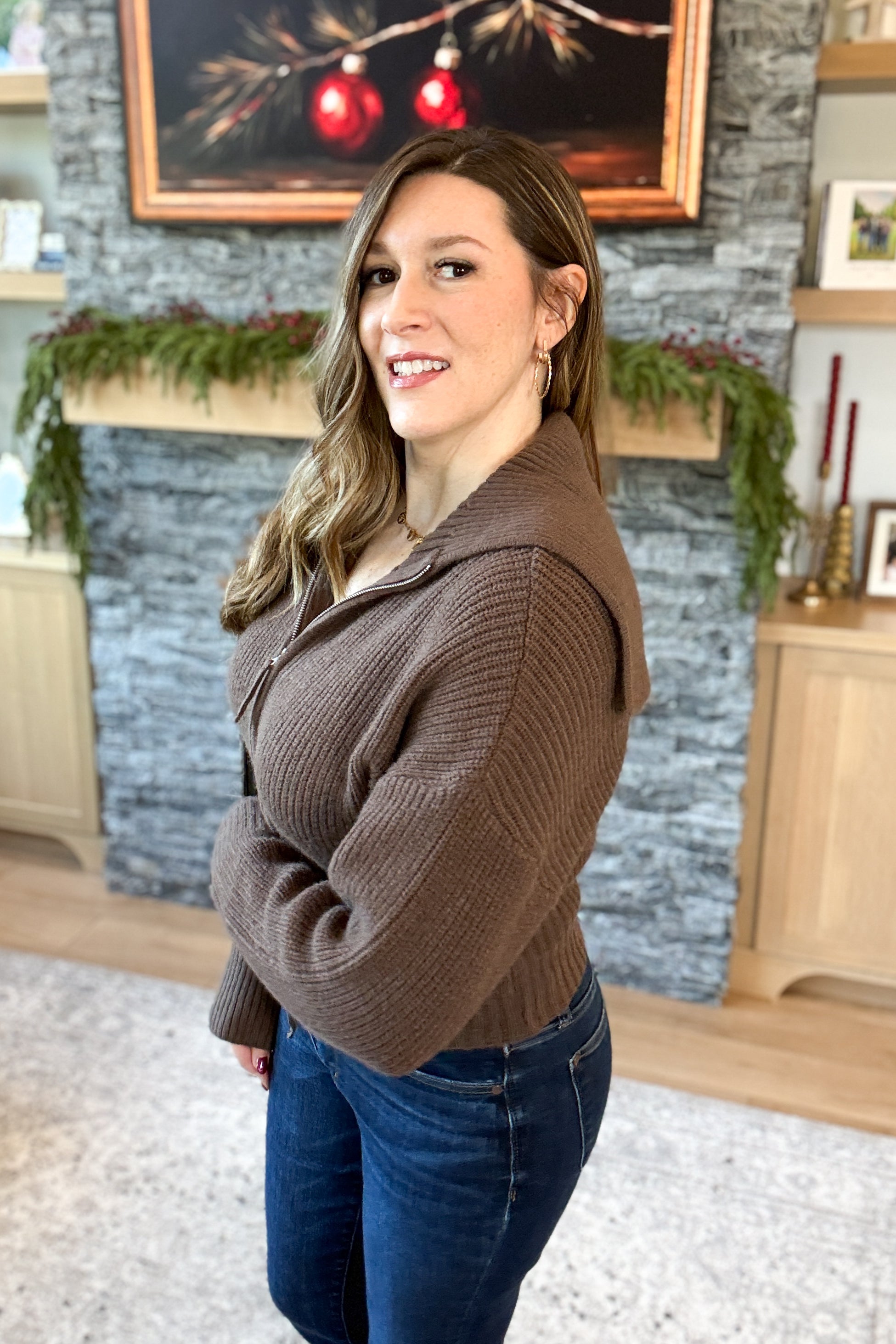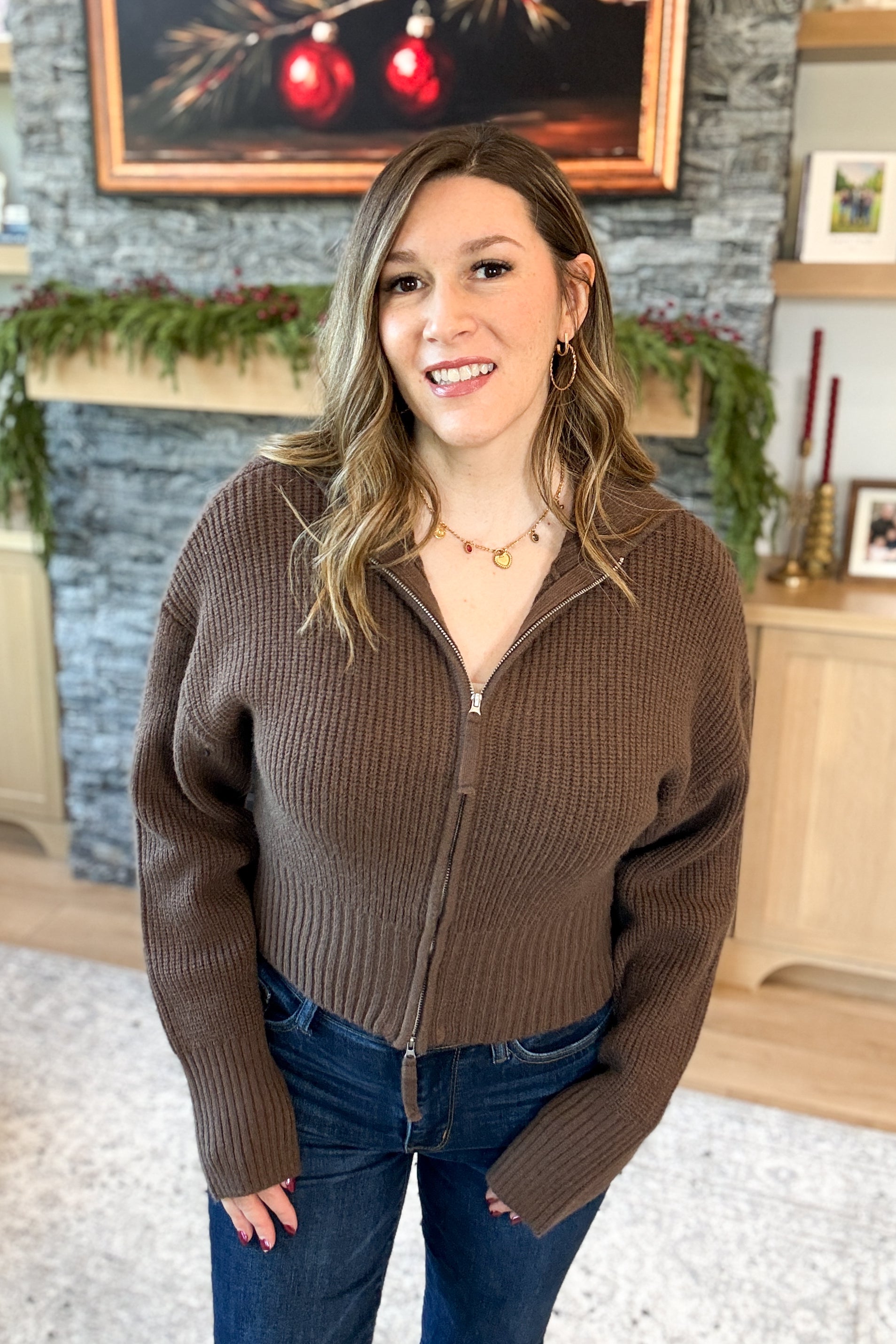 The Maisey Double Zip Front Cardigan is where modern design meets timeless style. Crafted from soft sweater knit fabric, it features an exaggerated collar and a sleek double zipper that can zip from both the top and bottom for a custom fit. Slightly cropped with a flattering, fitted silhouette, it’s the perfect layer to elevate dresses, skirts, or high-waisted denim. Styling tip: Pair the Maisey Cardigan with a midi skirt and boots for a polished, fashion-forward look.