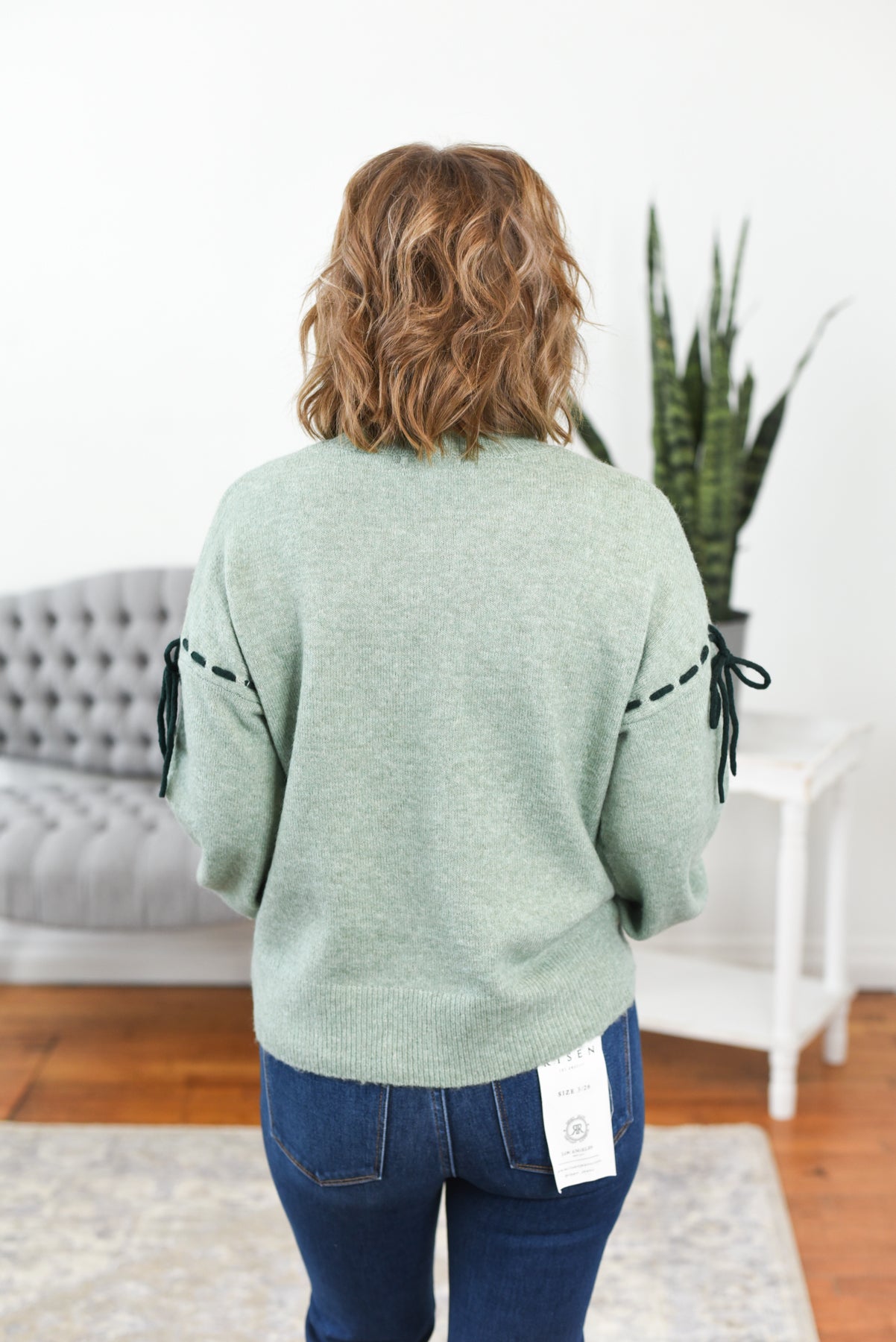 The Aspen Stitched Bow Sleeve Sweater is the sweetest way to stay cozy this season. Made from ultra-soft, stretchy knit in light green with dark green stitched bow accents, it’s festive without feeling over-the-top. With its comfy fit and charming details, it’s perfect for holiday gatherings or cozy winter days. Styling tip: Pair the Aspen Sweater with dark denim and gold accessories for a polished, cheerful look.