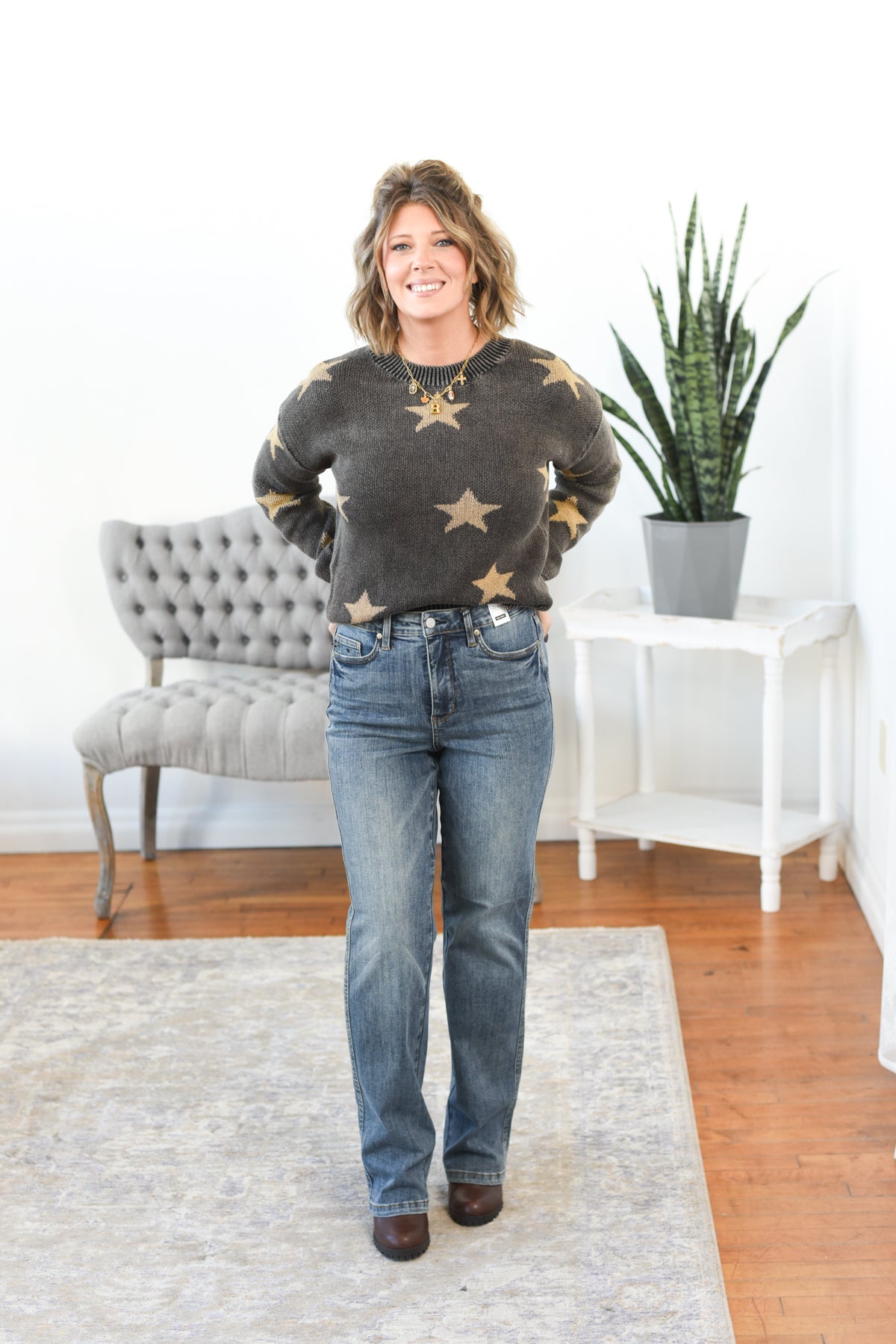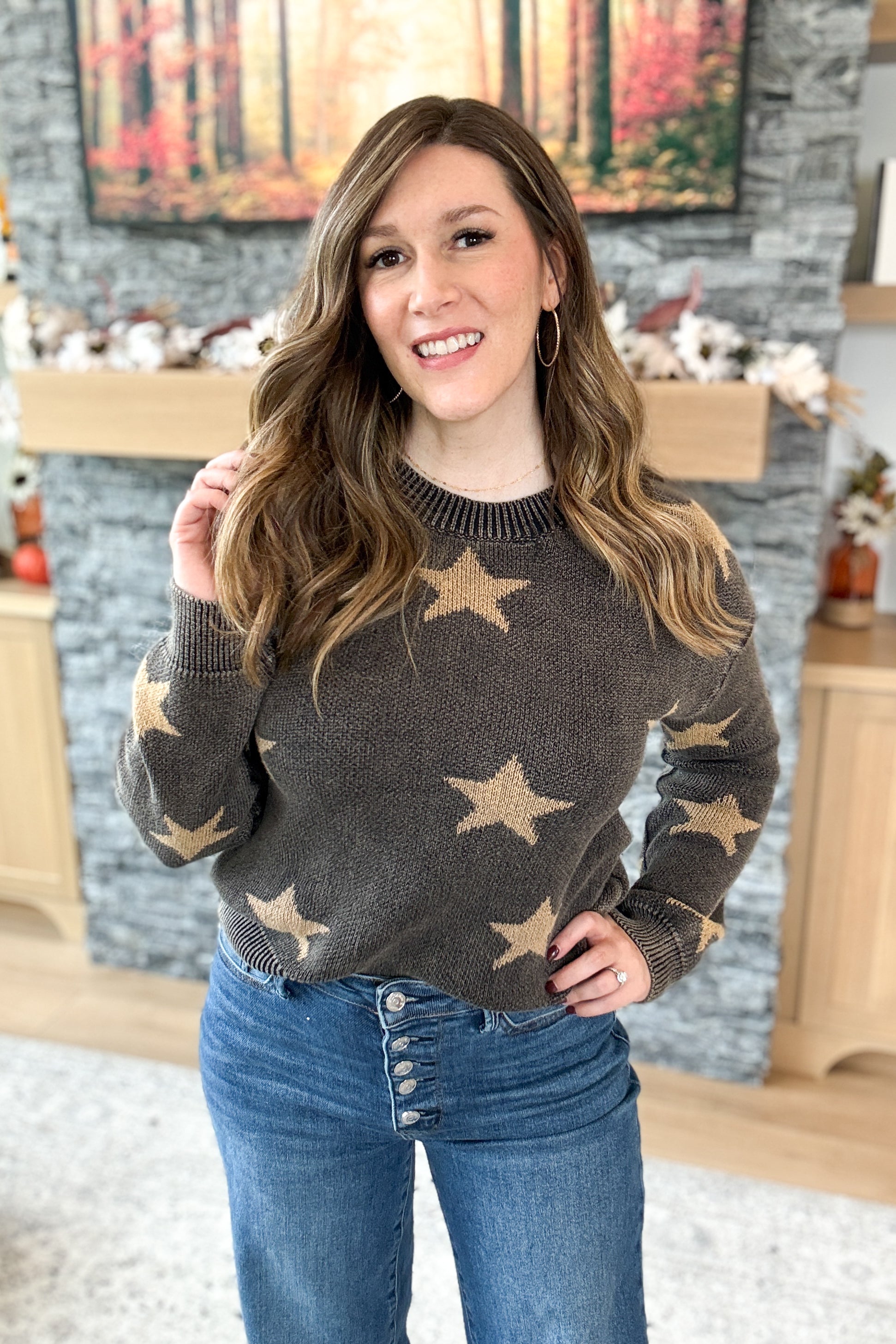 The Celeste Star Sweater brings a little edge to your cozy lineup. Featuring a mineral-washed charcoal background with taupe stars, this soft and stretchy sweater knit has that perfectly lived-in feel. The classic crewneck fit makes it easy to style for workdays, weekends, or star-gazing nights. Styling tip: Pair the Celeste Sweater with wide-leg denim and booties for an effortlessly cool fall look.