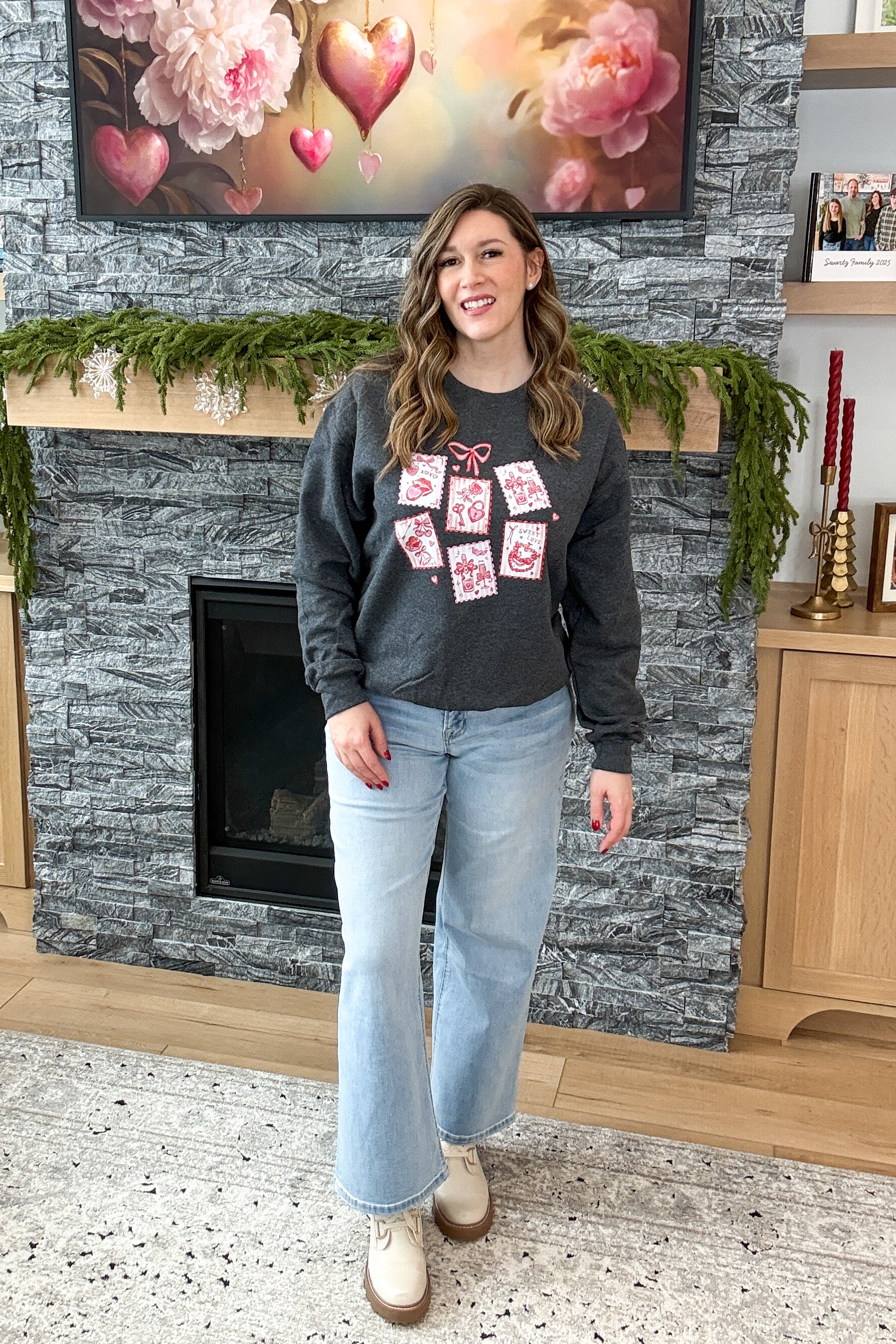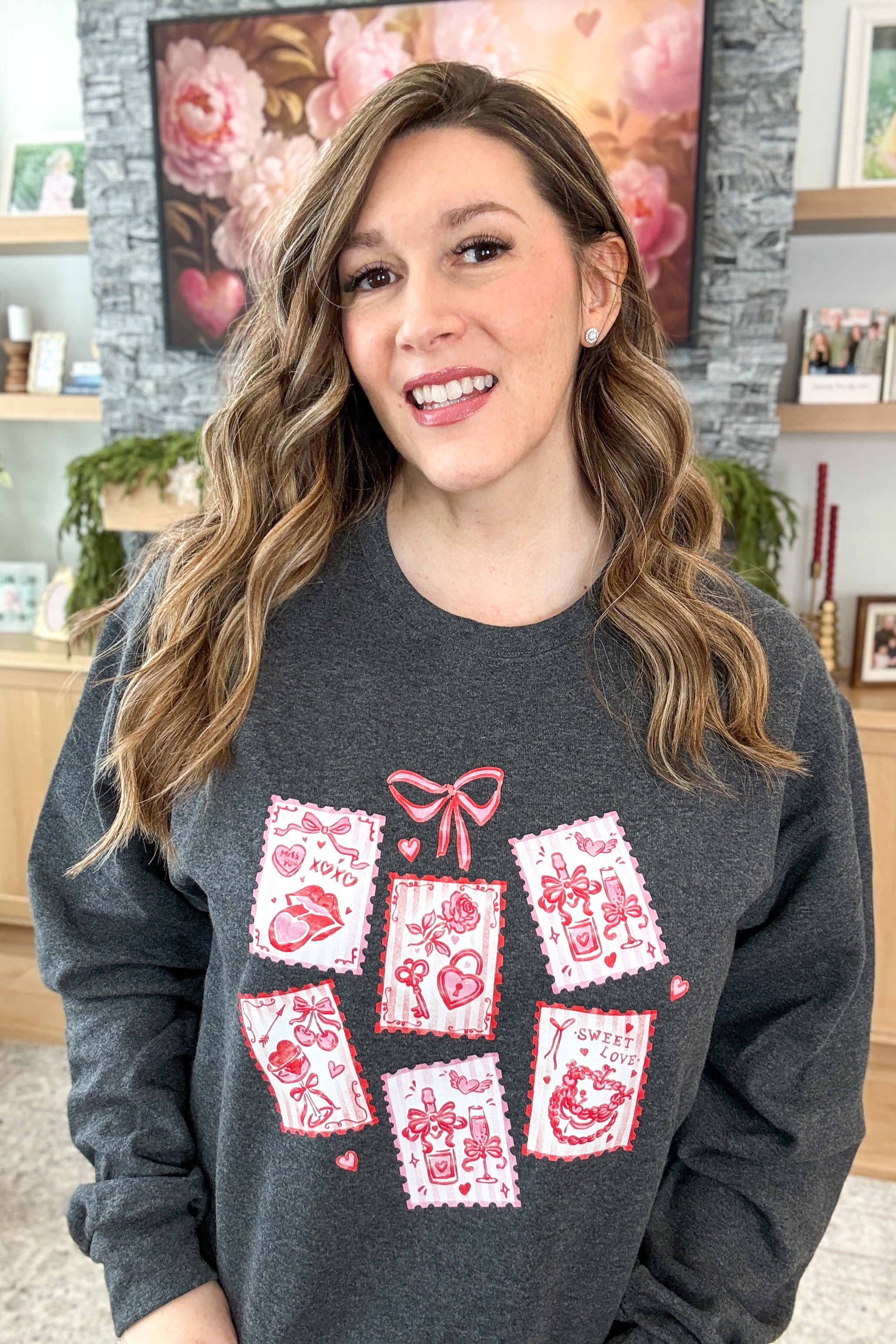 The Valentine Stamps Pullover Sweatshirt is cozy, charming, and full of love-letter vibes. Designed on a soft charcoal grey sweatshirt, it features pink, girly stamp-style graphics inspired by handwritten notes and Valentine postcards. Perfect for celebrating love season—or spreading a little extra sweetness year-round. Styling tip: Pair the Valentine Stamps Sweatshirt with light wash denim and sneakers for an easy, love-filled everyday look.
