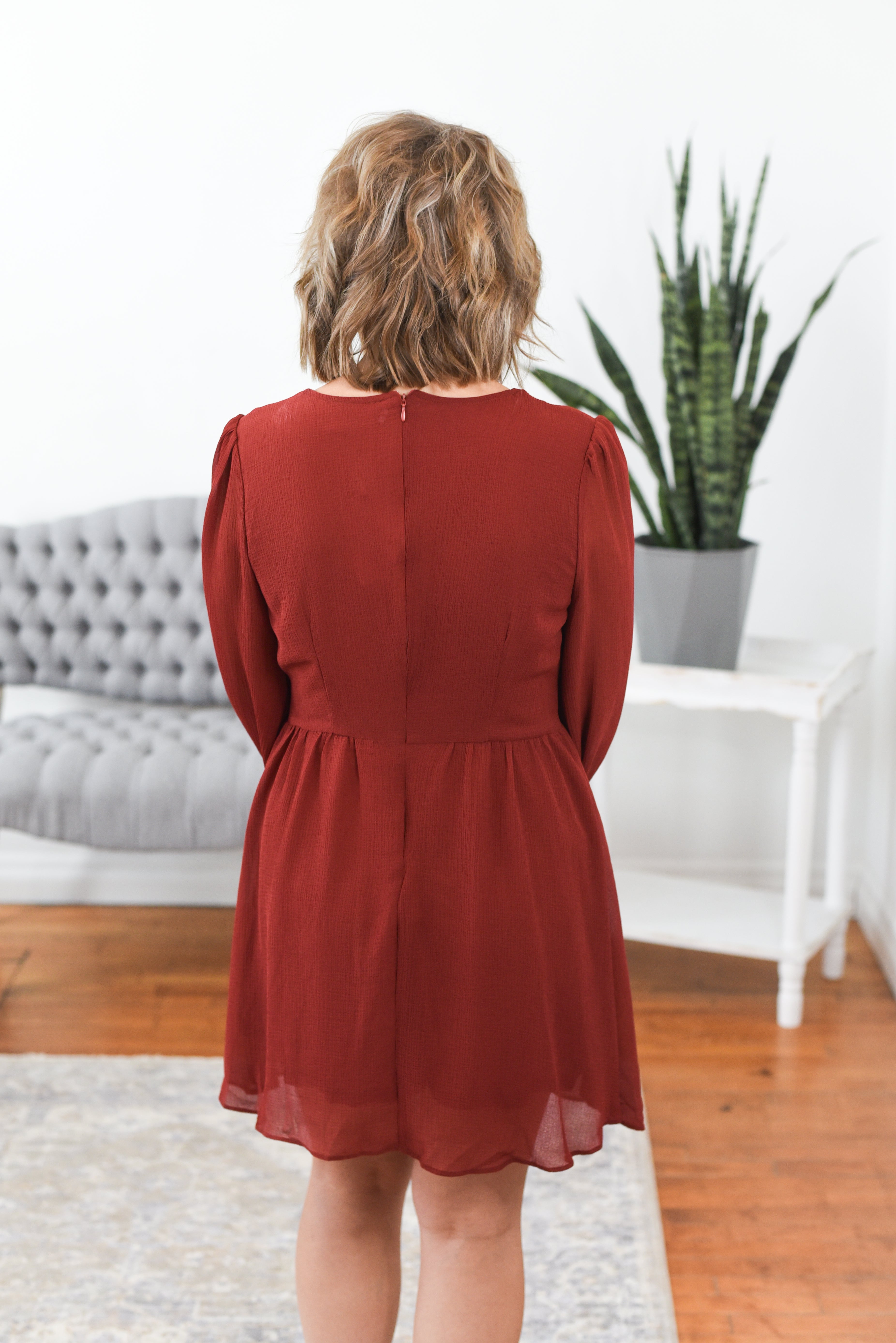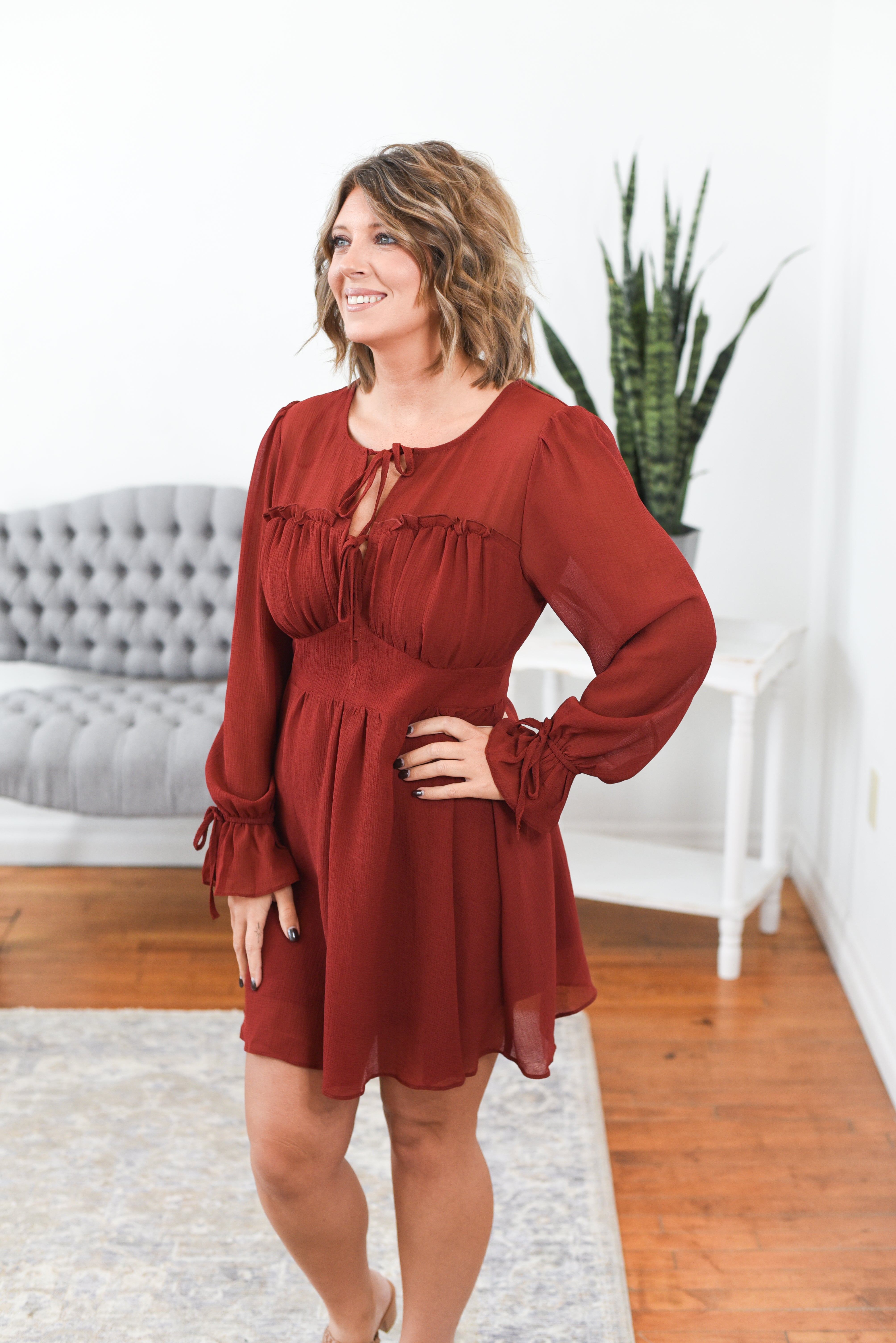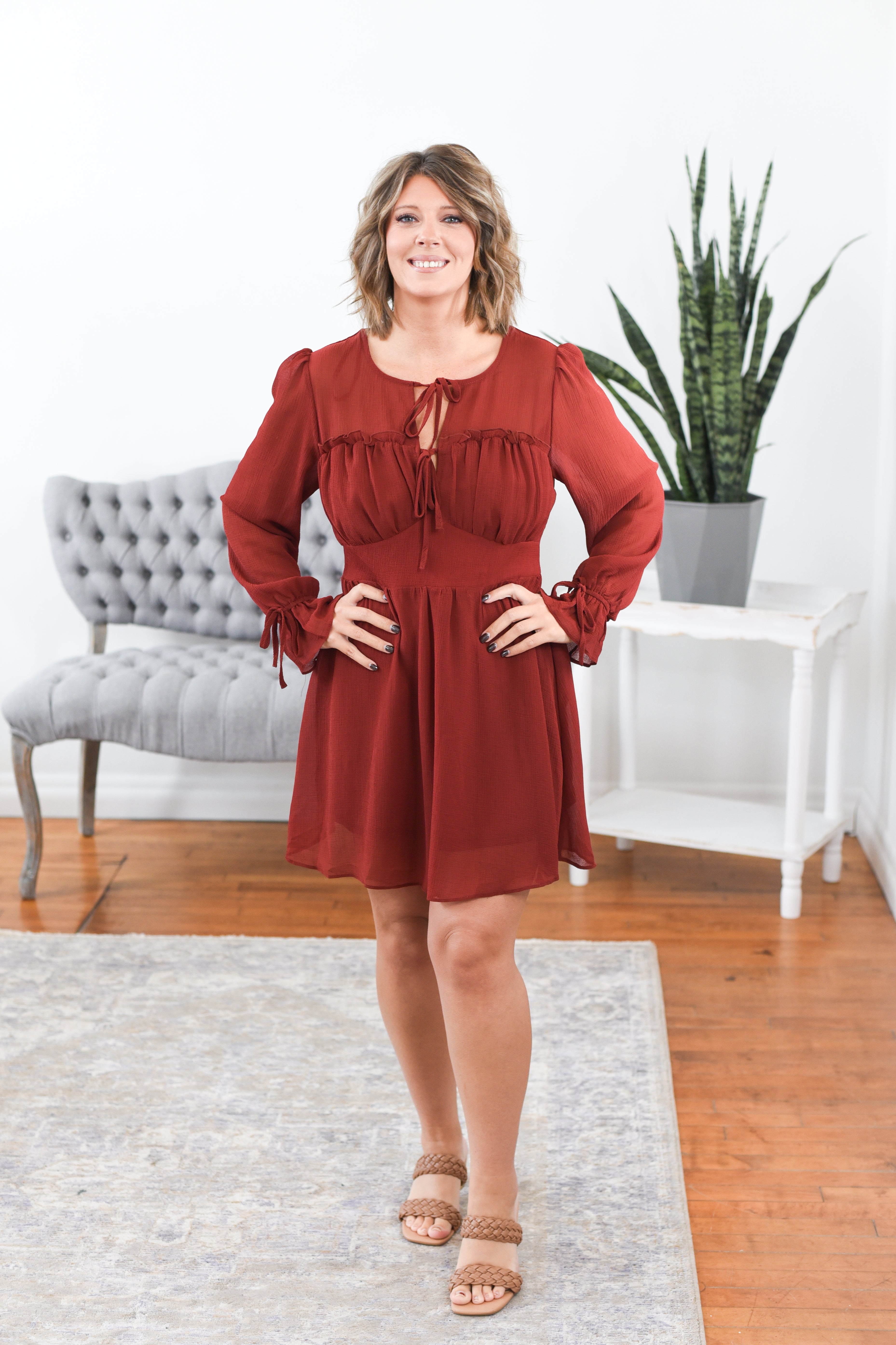 The Corah Tiered Sweetheart Neckline Dress is made for fall weddings, holiday parties, and everything in between. In a rich brick hue, this beauty features a flattering sweetheart neckline, double front tie detail, and soft chiffon sleeves with a flowy tiered overlay. Feminine, flattering, and full of seasonal charm—it’s the perfect mix of dressy and effortless. Styling tip: Pair the Corah Dress with heeled boots and gold jewelry for a warm, romantic look.