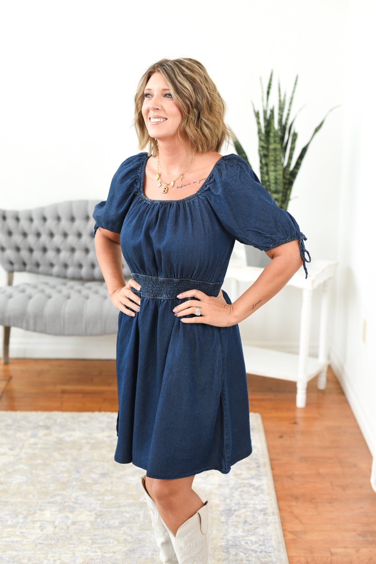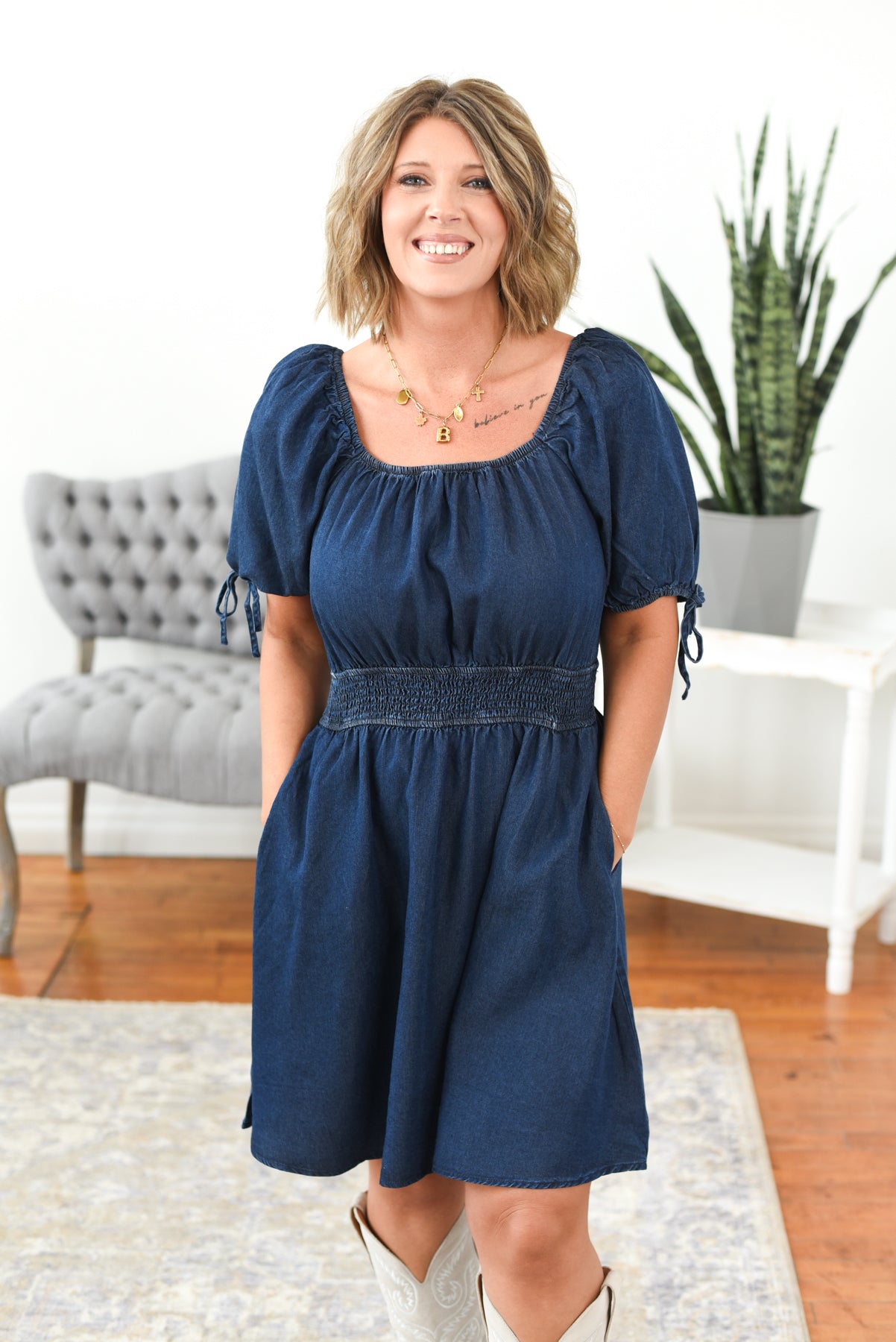 The Delilah Smocked Waist Denim Mini Dress is a playful denim piece with a flattering fit. Crafted from lightweight, soft tencel denim, it feels comfortable and breathable while offering a chic dark wash finish. The smocked waist defines your shape, while tie sleeves and a square stretchy neckline add a feminine touch you can style on or off the shoulder. Its mini length makes it perfect for warm days, casual outings, or layered with a jacket when the weather cools. Styling tip: Pair the Delilah Mini Dress with sandals and a wide-brim hat for weekend adventures, or dress it up with heeled booties and a statement bag for a night out.