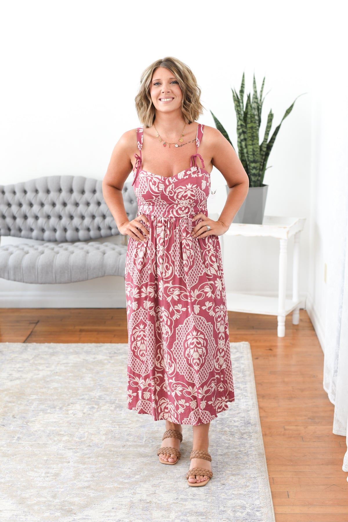 The Ellie Sweetheart Bow Detail Midi Dress is all about feminine charm with a fall-ready twist. Featuring front tie details on unique adjustable metal straps, a flattering sweetheart neckline, and a smocked back for the perfect fit, it’s as comfortable as it is beautiful. The gorgeous print comes in two rich fall color options, making it a standout for seasonal events or everyday elegance. Styling tip: Pair with heeled booties and a cropped jacket for a romantic fall look.