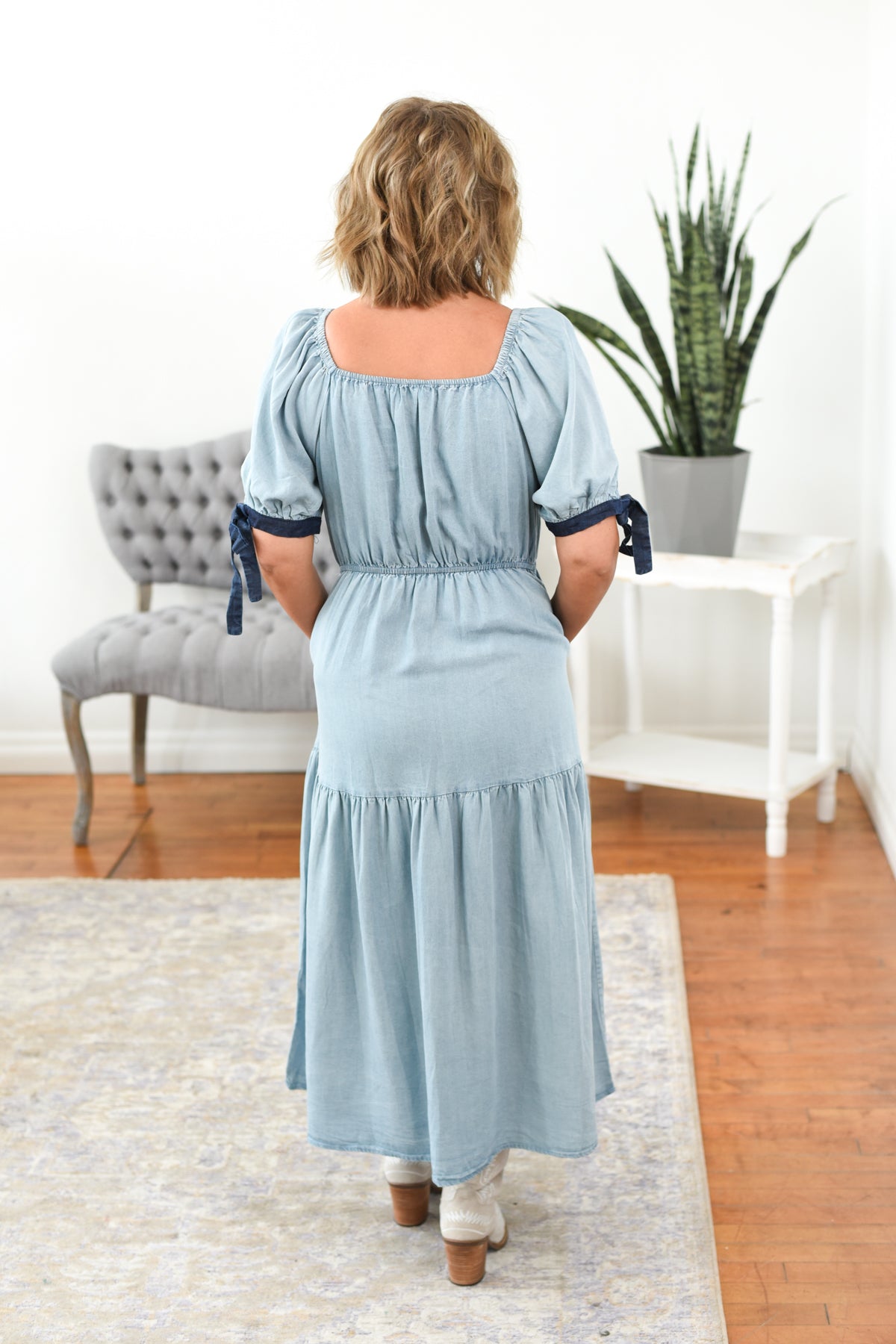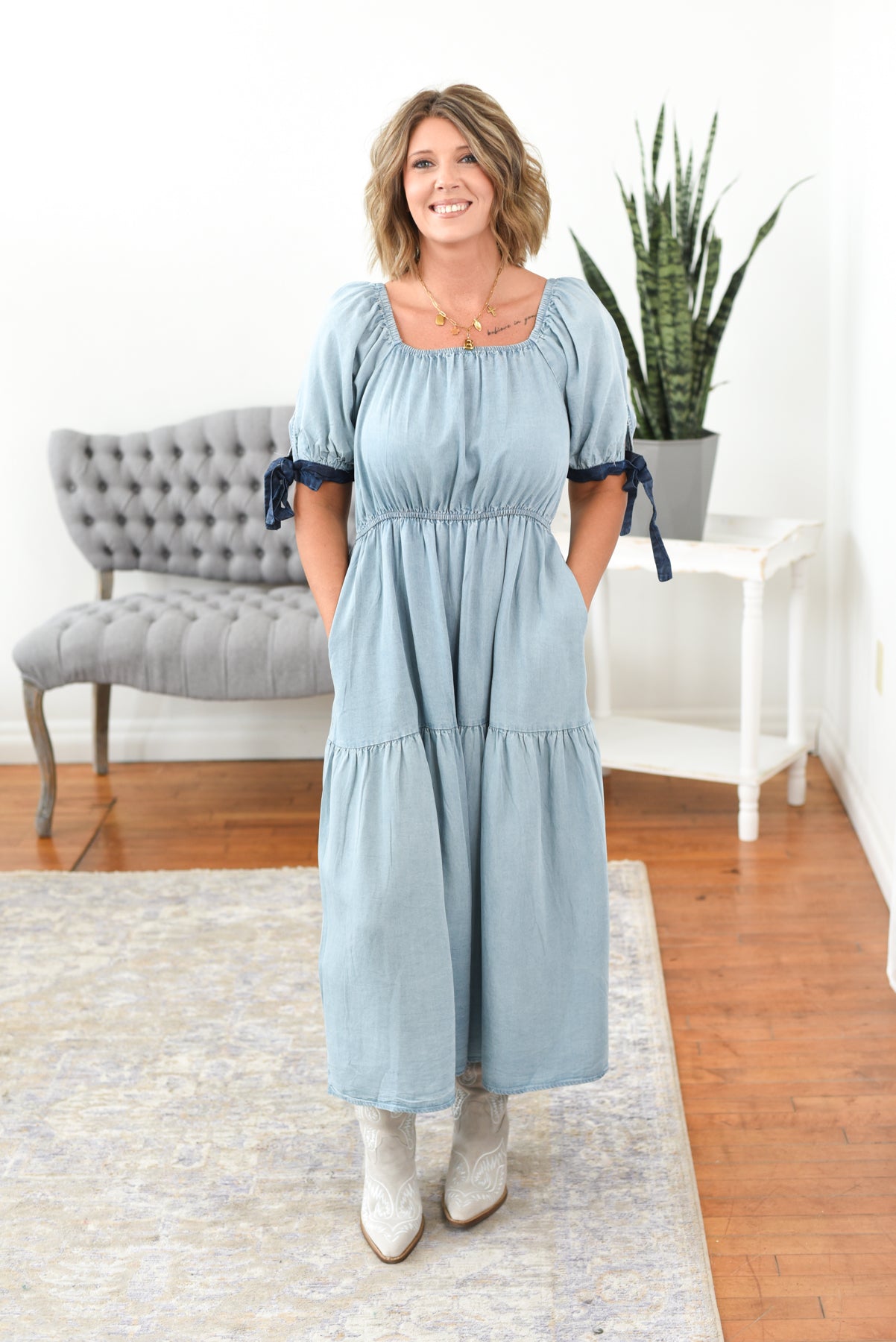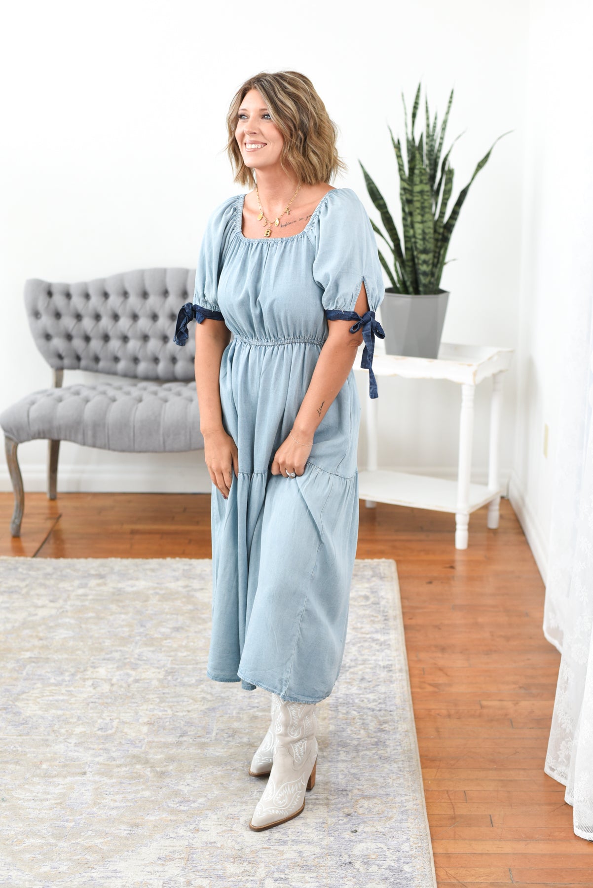 The Vera Contrast Sleeve Denim Midi Dress is a fresh take on timeless denim style. Made from lightweight tencel denim, this dress feels soft and breathable while giving you that effortlessly polished look. The stretchy waist flatters your shape, while the tiered design adds flowy movement with every step. Contrast tie sleeves and a square elastic neckline bring a touch of charm and versatility—wear it on or off the shoulder to switch up your style. Comfortable yet chic, this denim midi is perfect for everything from weekend brunch to casual evenings out. Styling tip: Pair the Vera Dress with wedges and layered jewelry for a dressed-up vibe, or keep it casual with sneakers and a crossbody bag.