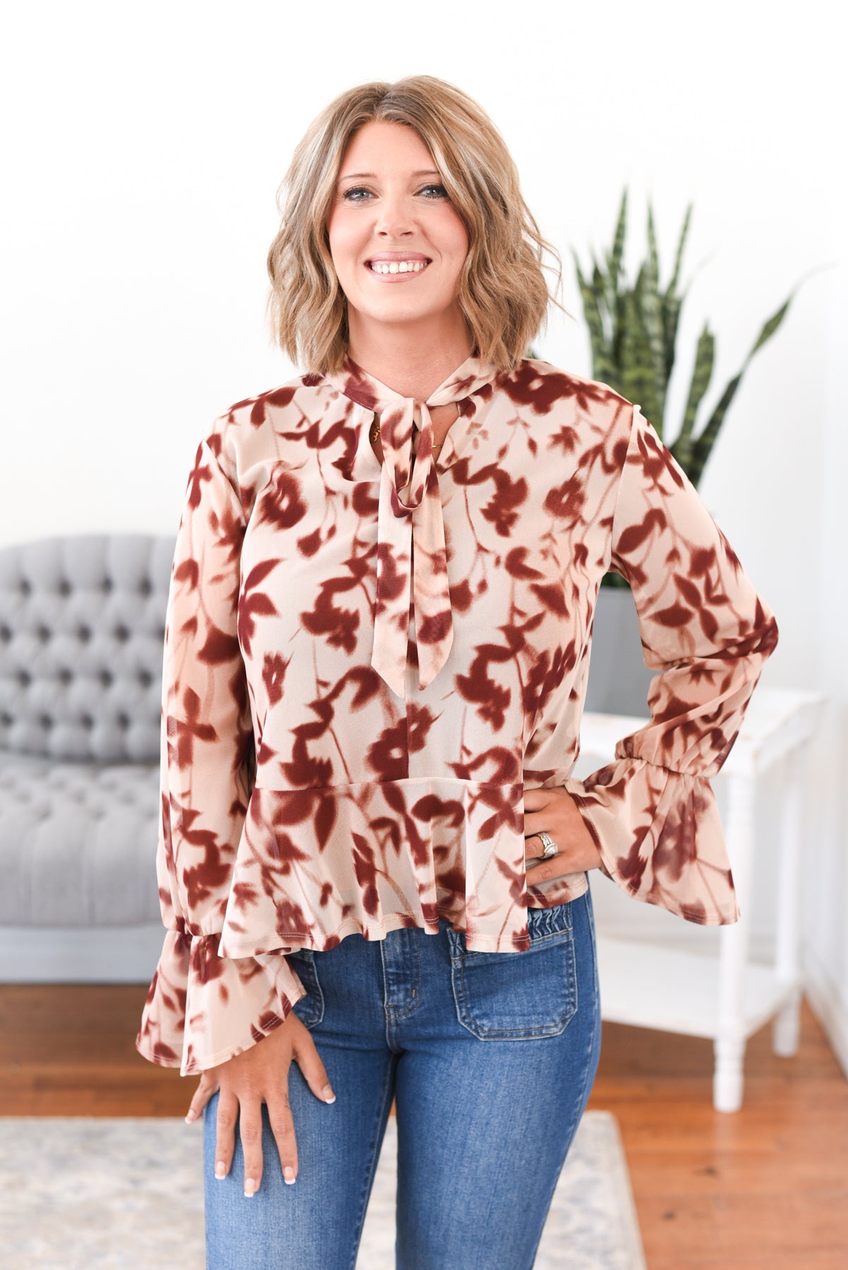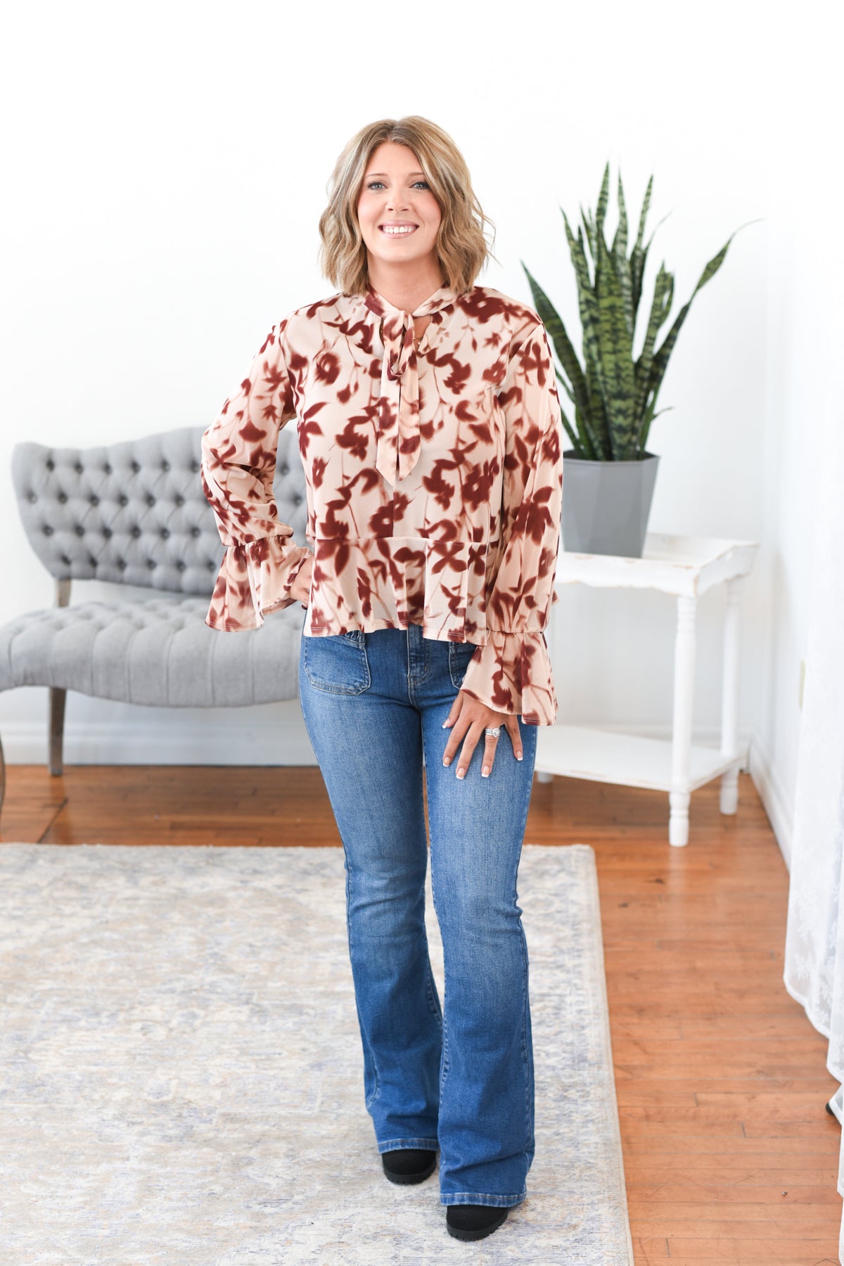 The Autumn Rose Boho Floral Ruffle Hem Top brings effortless romance to your wardrobe. Featuring flowy bell sleeves, a delicate neck tie detail, and a flattering ruffle hem, this lined blouse is designed for a breezy, feminine fit. Its floral pattern channels a free-spirited vibe while offering an elevated finish that works for both casual days and special outings. Styling tip: Pair with skinny jeans and ankle boots for a chic everyday look, or tuck into a midi skirt with heels for a dressy boho moment.