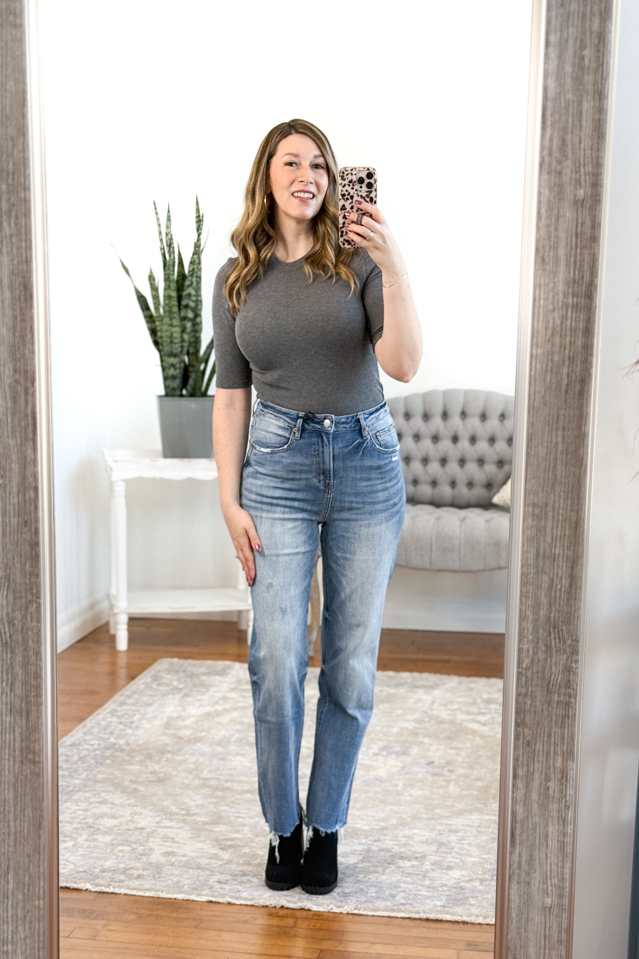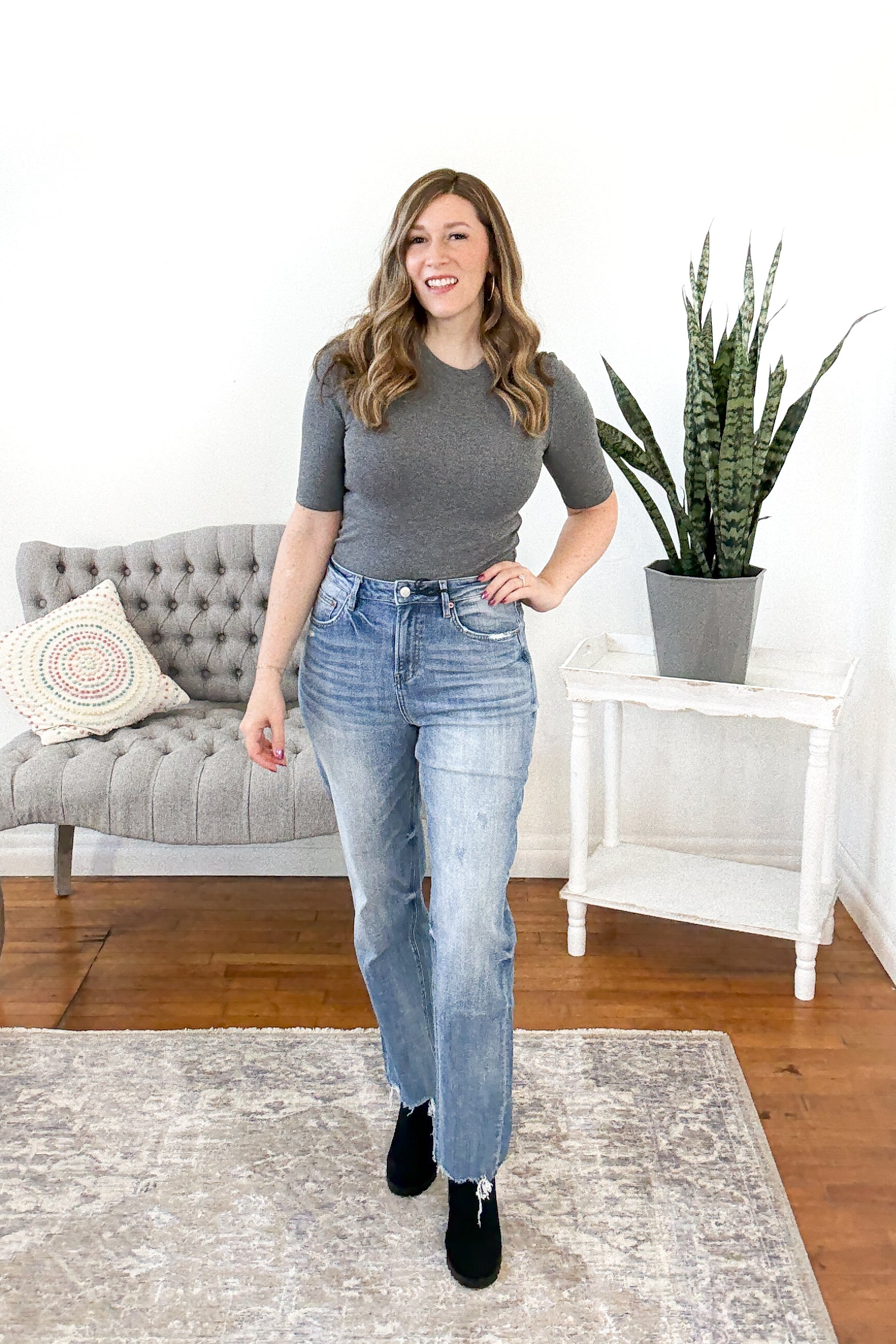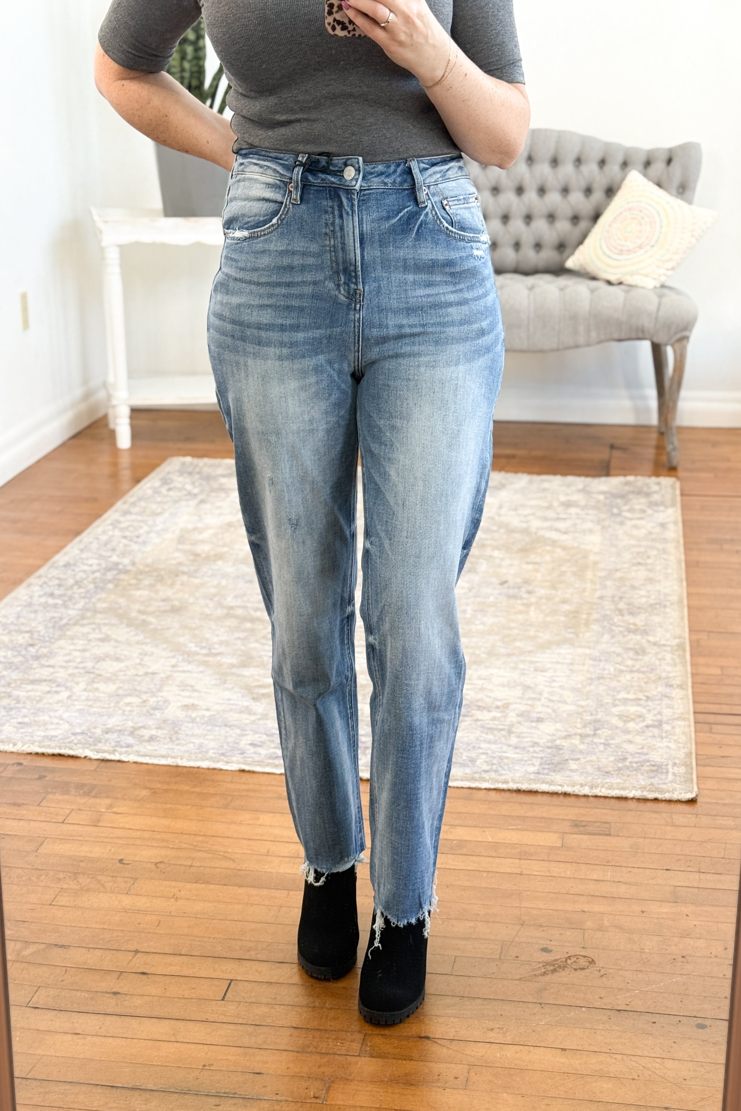The Alix High Rise Loose Fit Straight Leg Mica Jeans are your new everyday go-to with a vintage twist. Featuring an ultra high rise and a relaxed straight leg silhouette, these medium wash jeans offer that perfectly broken-in, lived-in feel from the very first wear. The raw hemline adds just the right amount of edge, while the stretchy, soft denim keeps comfort front and center. Effortlessly cool and endlessly wearable, they’re made for whatever your day has in store. Styling tip: Pair with a tucked-in graphic tee and sneakers for a casual-cool look, or dress them up with a bodysuit and heeled booties for weekend plans.