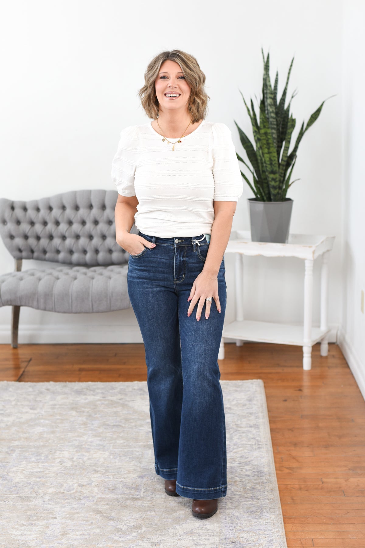 The Anja Textured Knit Top is chic, modest, and effortlessly refined. Crafted from soft, stretchy lightweight sweater knit, it features elegant balloon sleeves, a short sleeve silhouette, and beautiful texture that elevates any outfit. Perfect for workdays, bridal or baby showers, church, and other special occasions. Styling tip: Pair the Anja Top with tailored trousers or a midi skirt for a polished, feminine look.