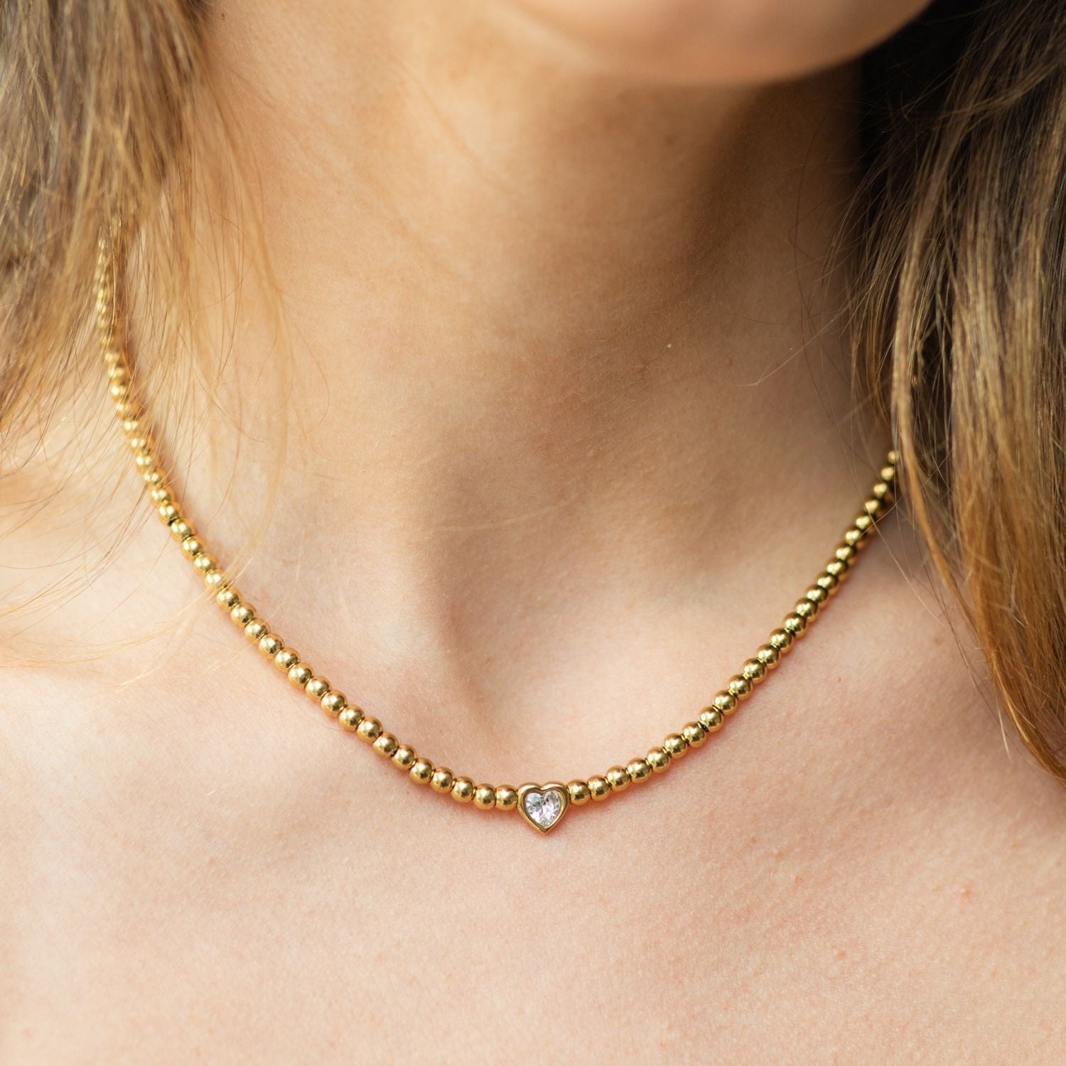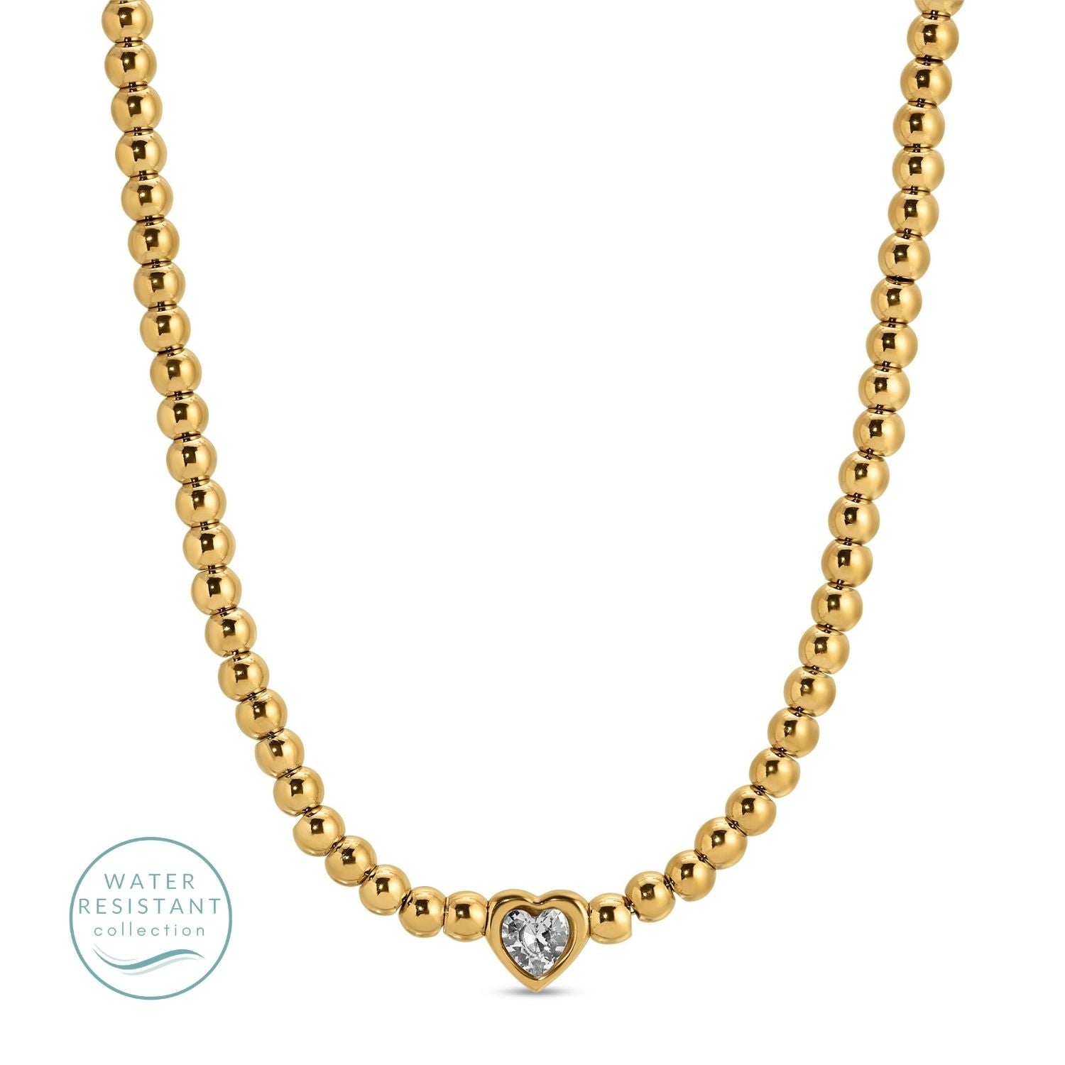 Discover the perfect blend of timeless romance and modern resilience with our "Beaded Heart Faux Diamond Necklace!" This exquisite collar necklace is designed to capture hearts and withstand the elements, making it an essential addition to your everyday sparkle. The necklace features a beautiful array of delicate gold-plated beads that form a chic collar, designed to sit elegantly on your neckline.