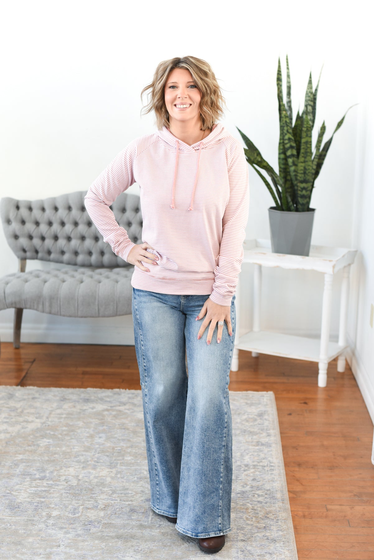 The Carlson Striped Hoodie is the perfect lightweight layer. Made from ultra-light knit fabric, it features a relaxed hoodie style with a flattering tulip hemline that feels breezy and effortless. Ideal for spring mornings, summer nights, and casual everyday wear. Styling tip: Pair the Carlson Hoodie with denim shorts or white jeans and sneakers for an easy warm-weather look.