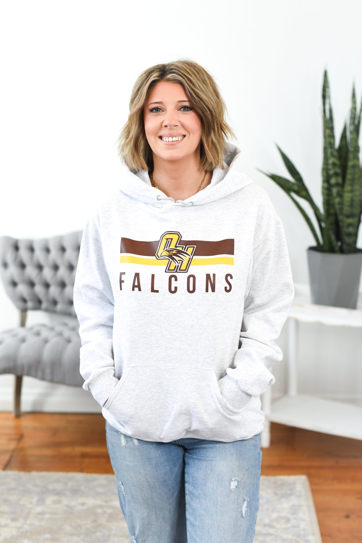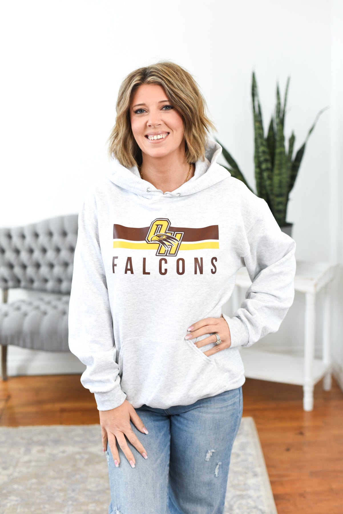 The Falcons In Line Hoodie Sweatshirt brings a fresh, graphic take on classic school spirit. Featuring a sleek linear design and the bold Ogemaw Heights Falcons mascot logo, this pullover is made for fans who like their pride with a side of style. Cozy, casual, and easy to wear, it’s the perfect piece for game day, school events, or just repping your hometown team with flair. Styling tip: Style with joggers and sneakers for a sporty vibe, or pair with denim and a puffer vest for a crisp, spirited look.
