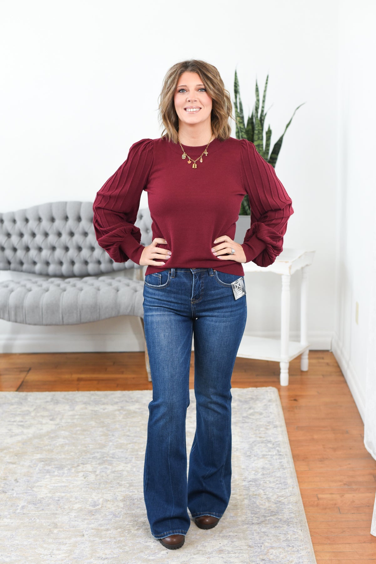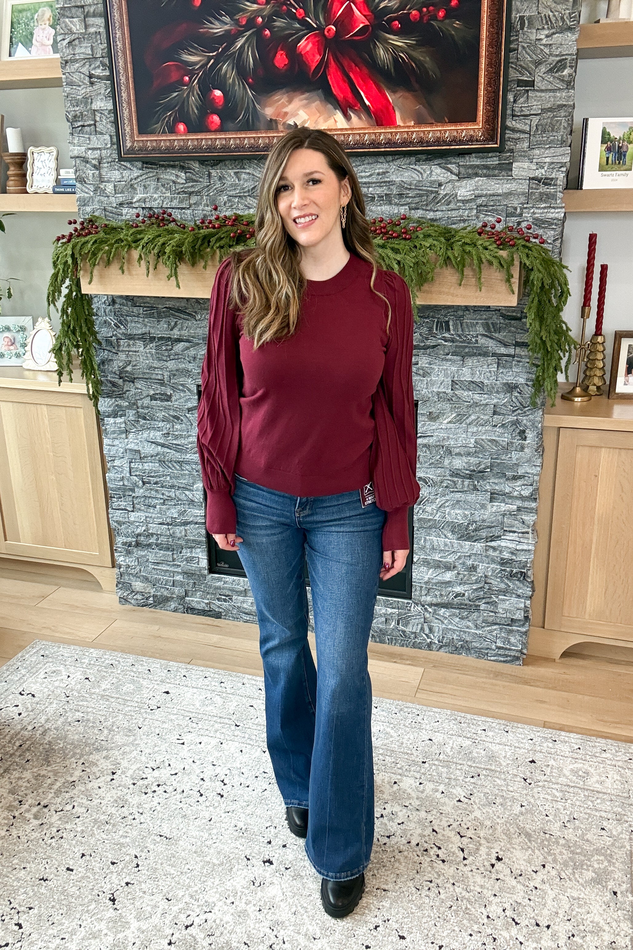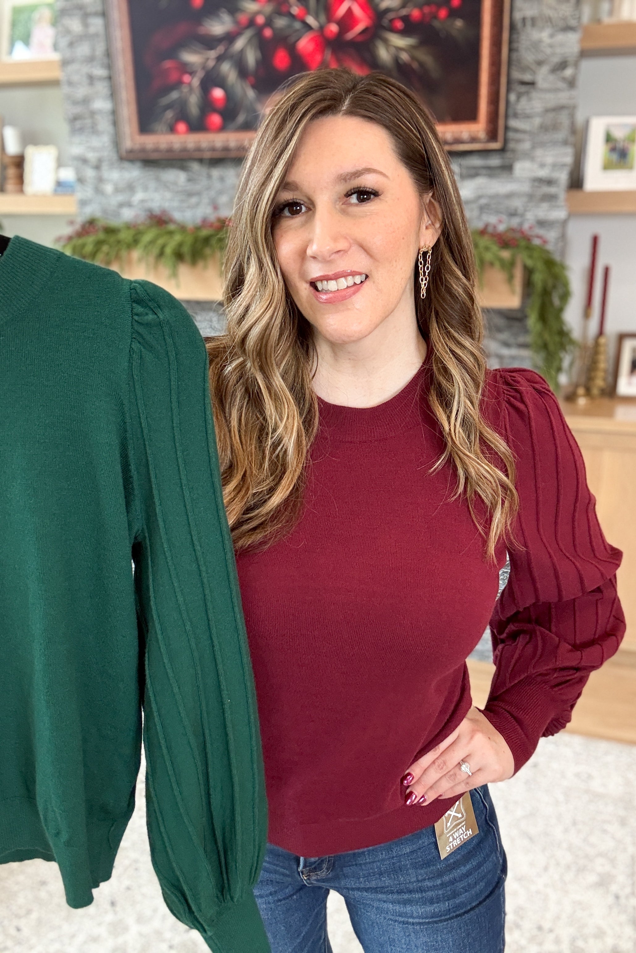 The Gracie Balloon Sleeve Top is a perfect mix of classic and modern. Crafted from soft, stretchy lightweight sweater knit, it features textured stripe balloon sleeves, a fitted bodice, and a timeless crew neckline. Ultra-classy and effortlessly flattering, it’s ideal for workdays, dinners, or polished everyday style. Styling tip: Pair the Gracie Top with tailored trousers and heels for a refined look, or jeans and booties for chic casual flair.