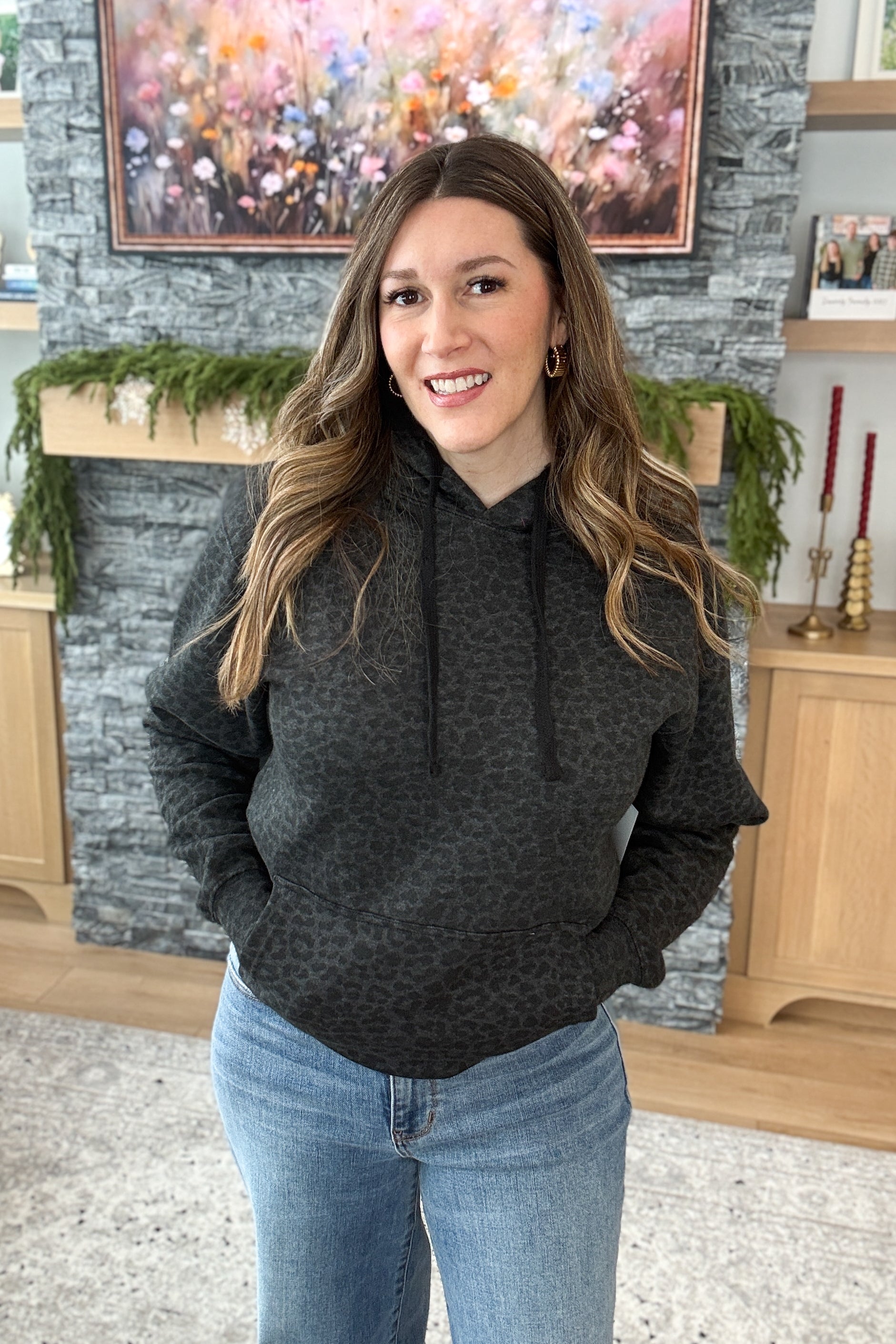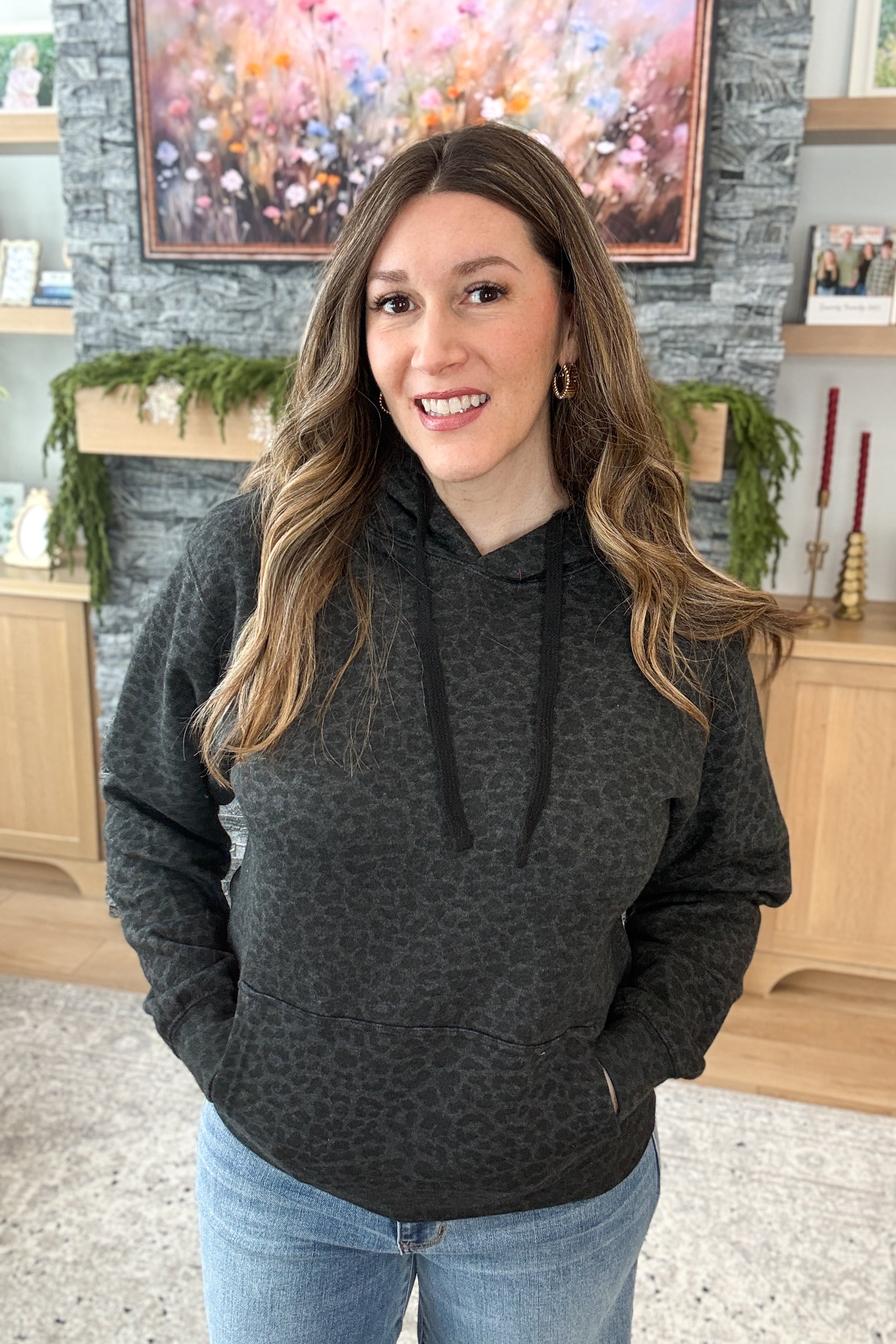 The Leo Weekend Hoodie is your go-to for cozy comfort with a hint of edge. Designed in a dark charcoal-black hue with subtle animal print, this fleece-lined hoodie features a soft, stretchy feel and a classic kangaroo pocket for everyday ease. Elevated yet ultra-comfortable, it’s perfect for laid-back weekends and casual nights out. Styling tip: Pair the Leo Hoodie with black denim or leggings and sleek sneakers for an effortlessly cool weekend look.