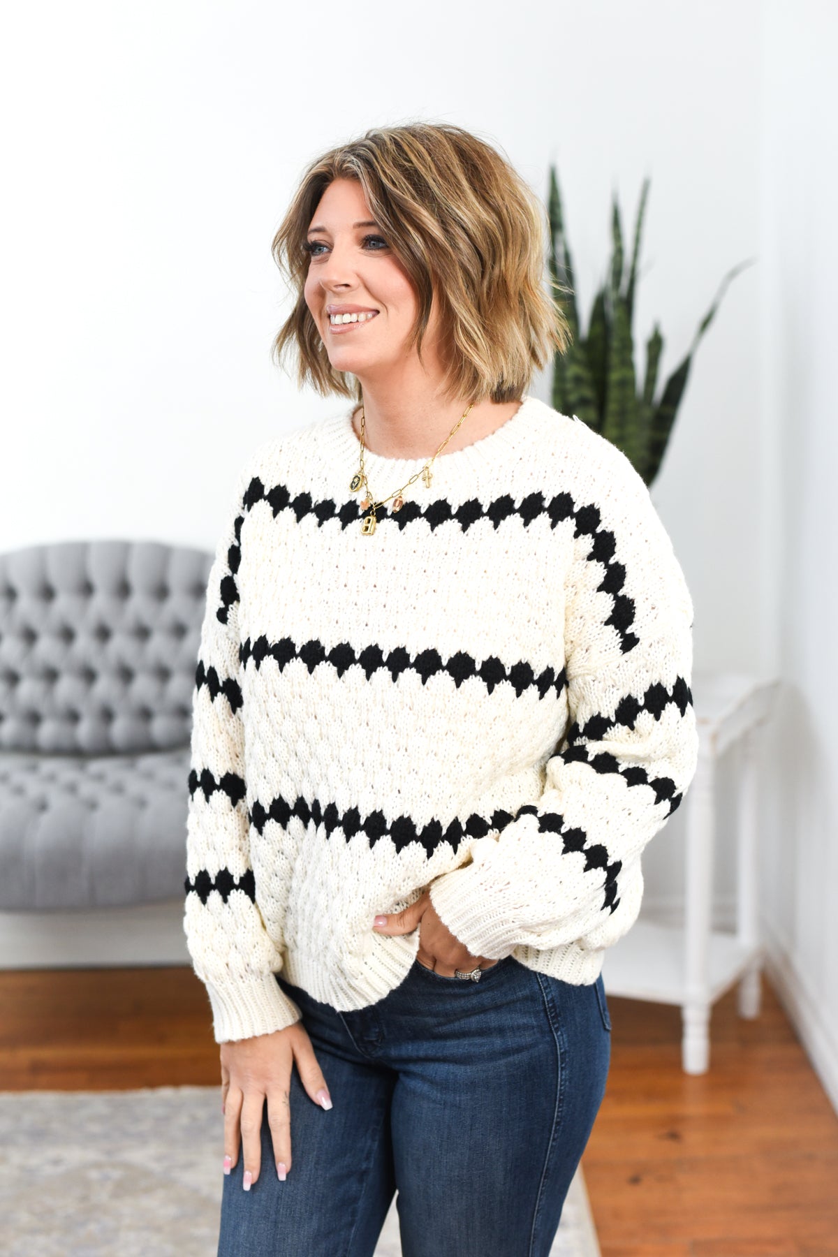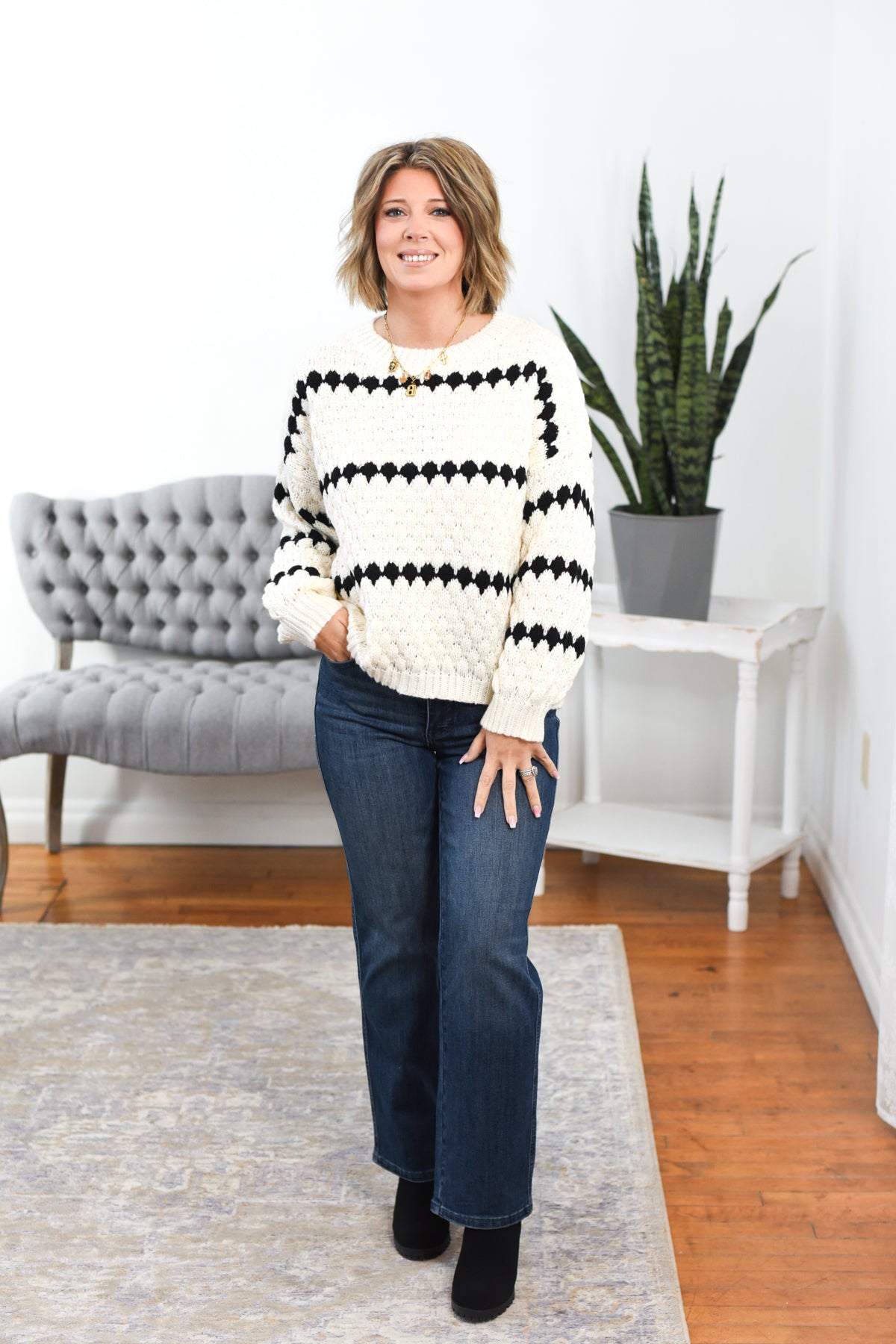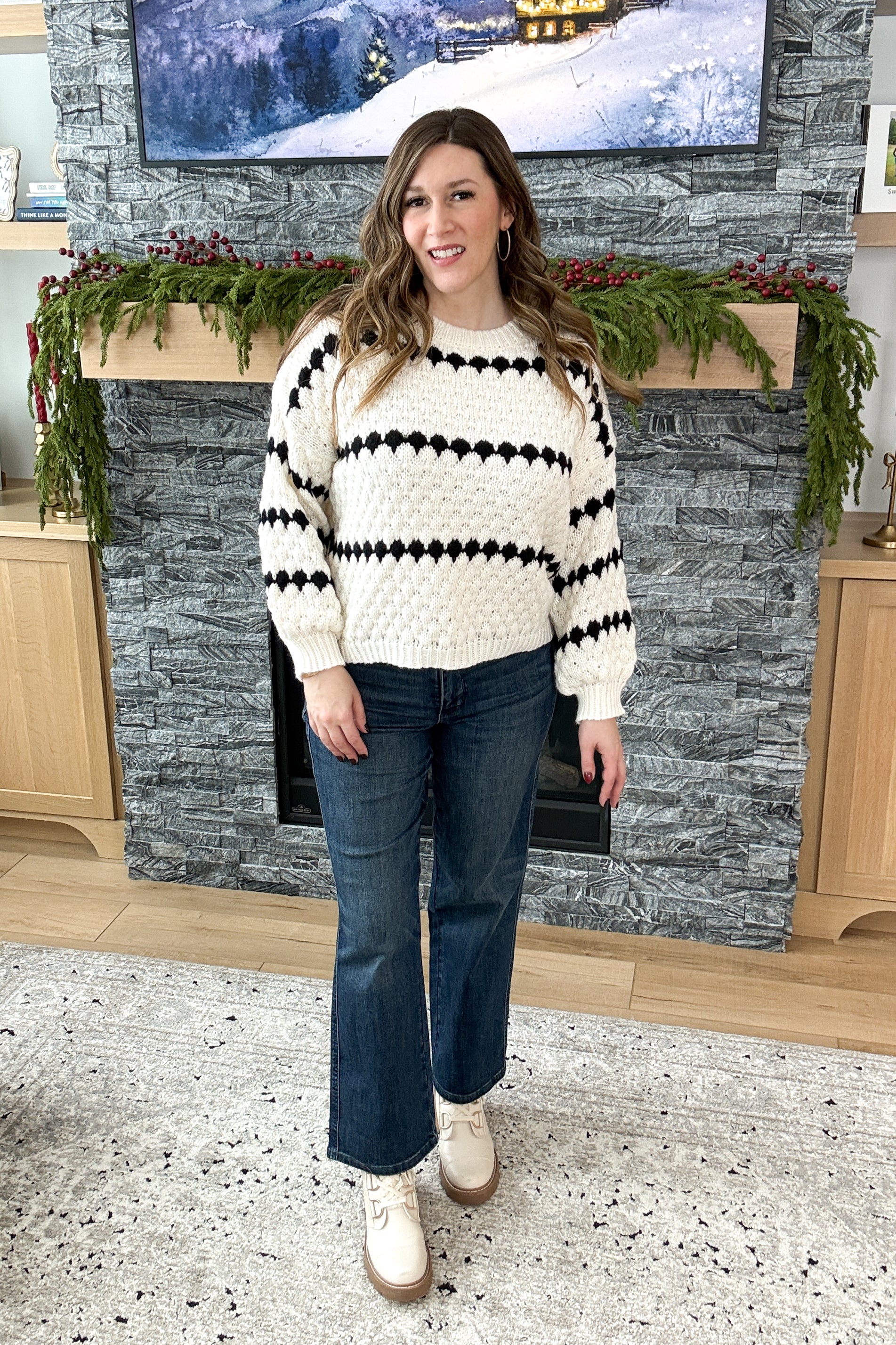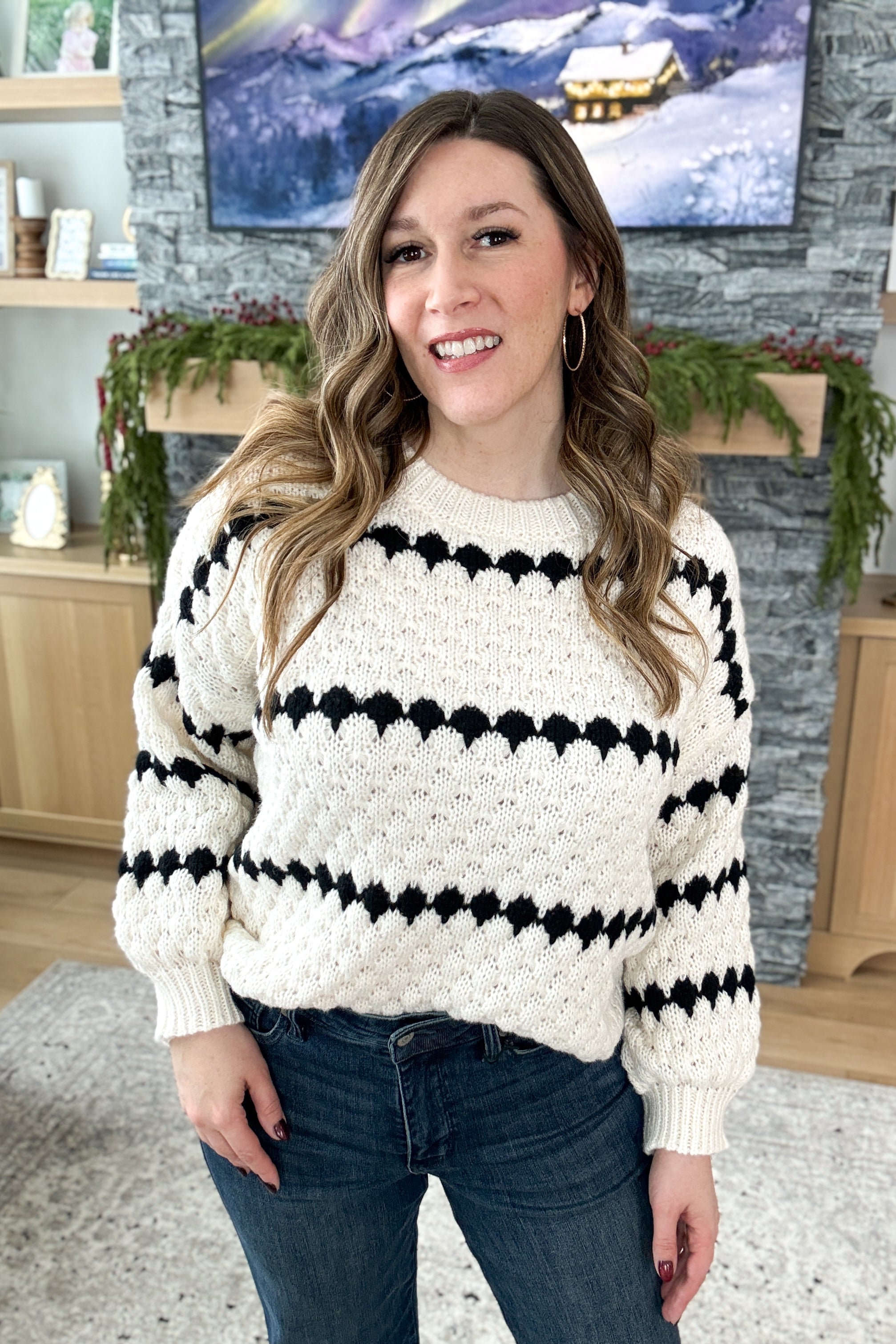 The Lilah Striped Sweater is a timeless favorite with a cozy twist. In ivory with bold black stripes, this chunky knit features bubble sleeves, a relaxed oversized fit, and a classic crew neckline for that effortless, throw-on-and-go style. Soft, warm, and perfect for chilly days. Styling tip: Pair the Lilah Sweater with black denim and booties for a chic, everyday winter look.