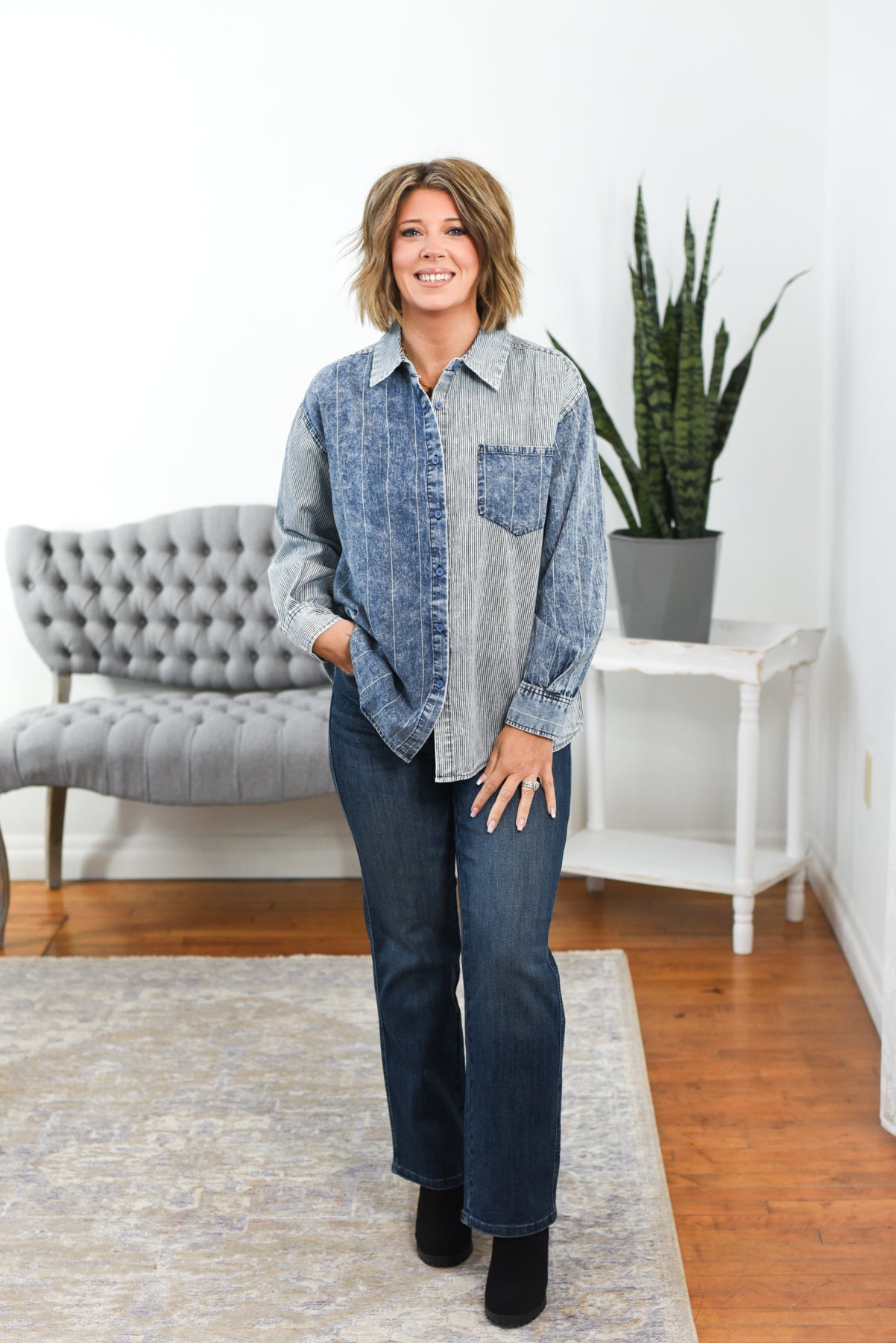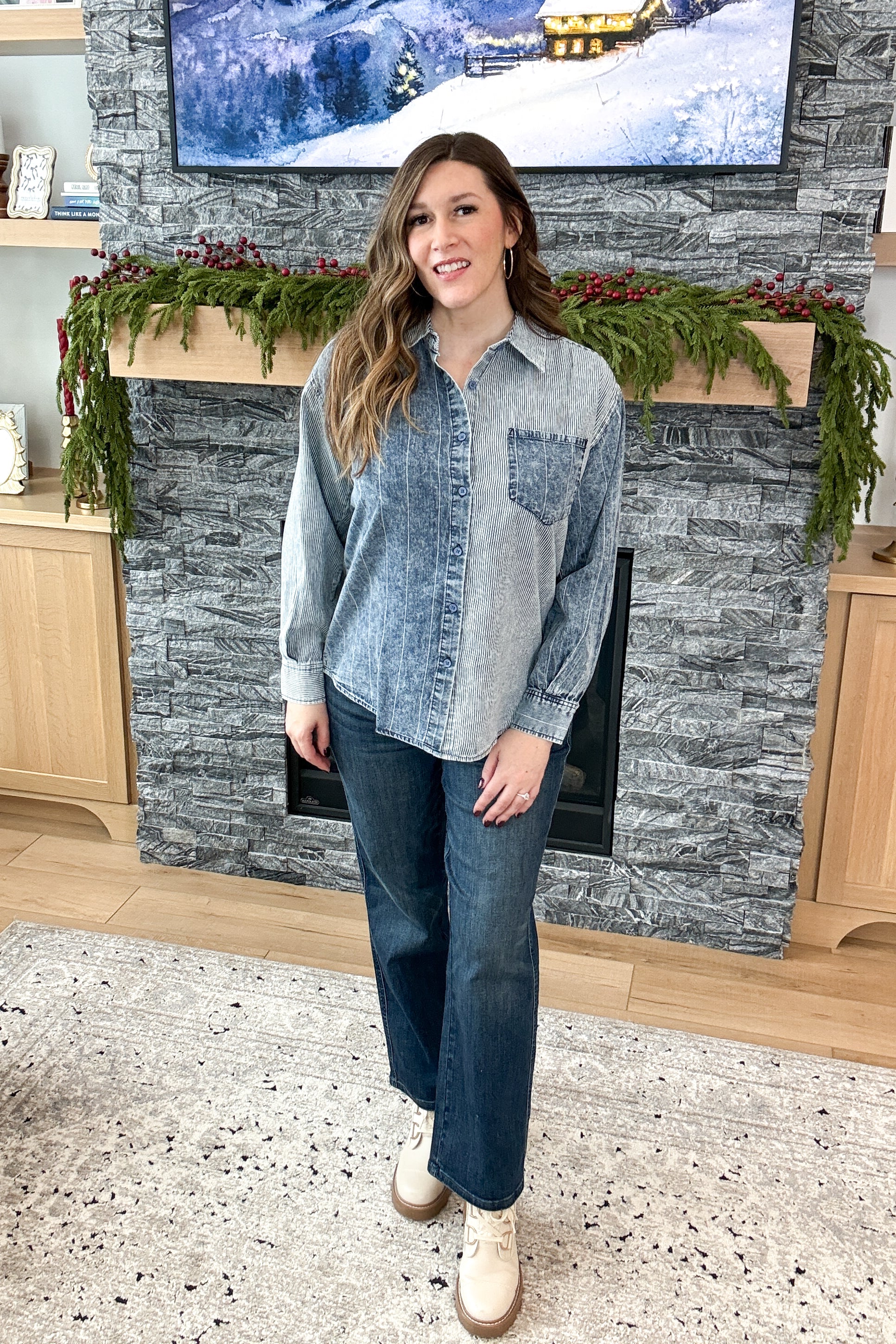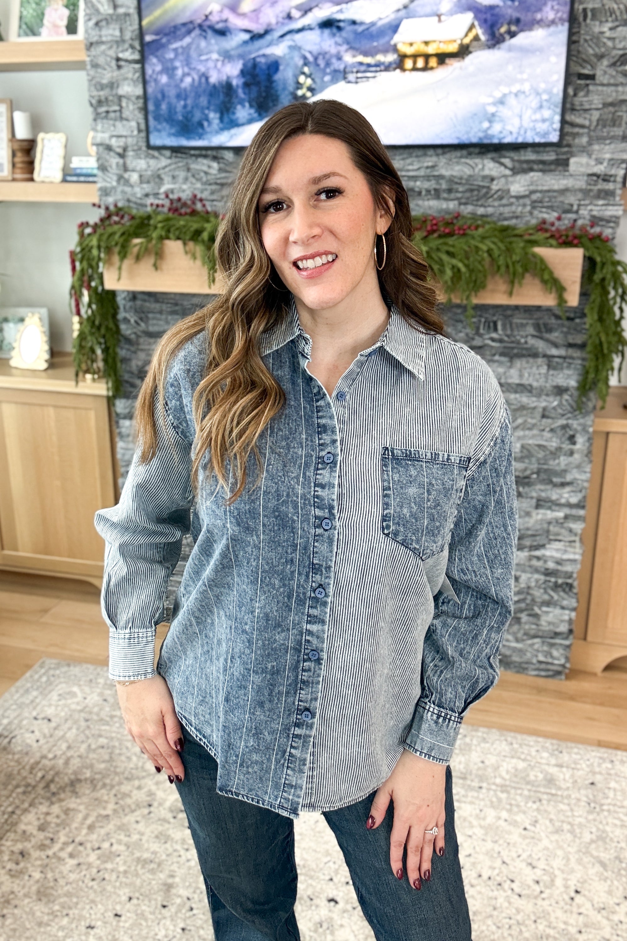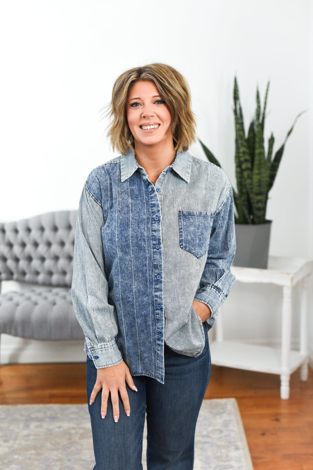 The Malika Mixed Striped Denim Oversized Shirt is a fresh, classy twist on a wardrobe staple. Made from soft, lightweight, pliable denim, it features a mixed striped design, classic collar, front breast pocket, and an easy oversized fit that moves from work to weekend without missing a beat. Cute, polished, and endlessly versatile. Styling tip: Pair the Malika Shirt with trousers for the office or front-tuck it into wide leg jeans for an elevated casual look.