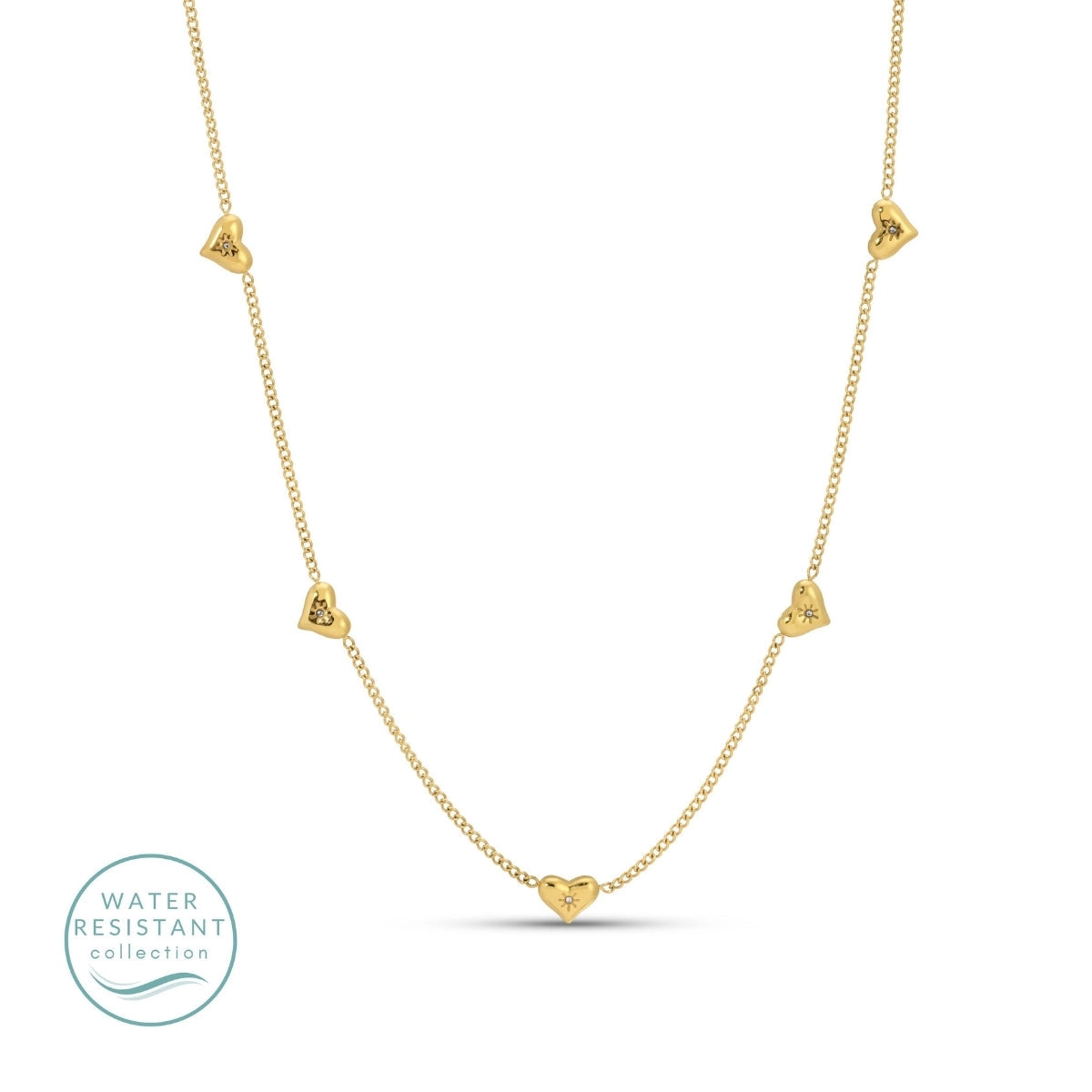 omantic with a modern edge, the Multi-Heart Collar Necklace is designed to add subtle charm and shine to your everyday look. Crafted from stainless steel and finished in radiant 18K gold plating, this delicate chain necklace features evenly spaced heart charm with cubic zirconia accents for a soft, feminine touch. Built for real life, this necklace is water resistant, making it perfect for daily wear while helping to resist tarnish and fading.