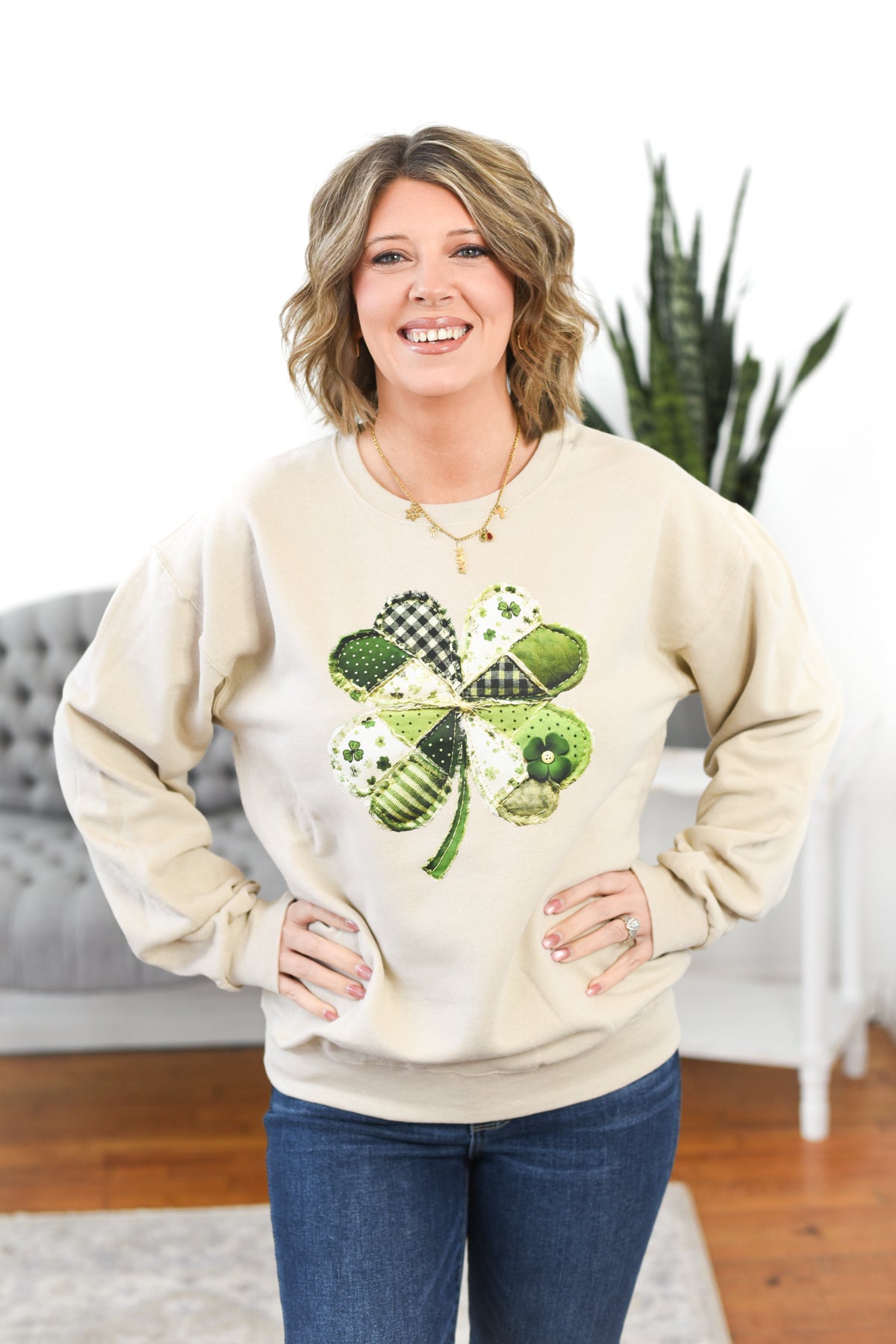 The Patchwork Four Leaf Clover Pullover Sweatshirt is cozy comfort with a little extra luck. Designed on a soft sand-colored fleece-lined sweatshirt, it features a charming patchwork, quilted-look four-leaf clover that feels both vintage-inspired and fresh. Ultra comfortable and perfect for St. Patrick’s Day or everyday wear. Styling tip: Pair this sweatshirt with light wash denim and sneakers for an easy, lucky-day look. 🍀
