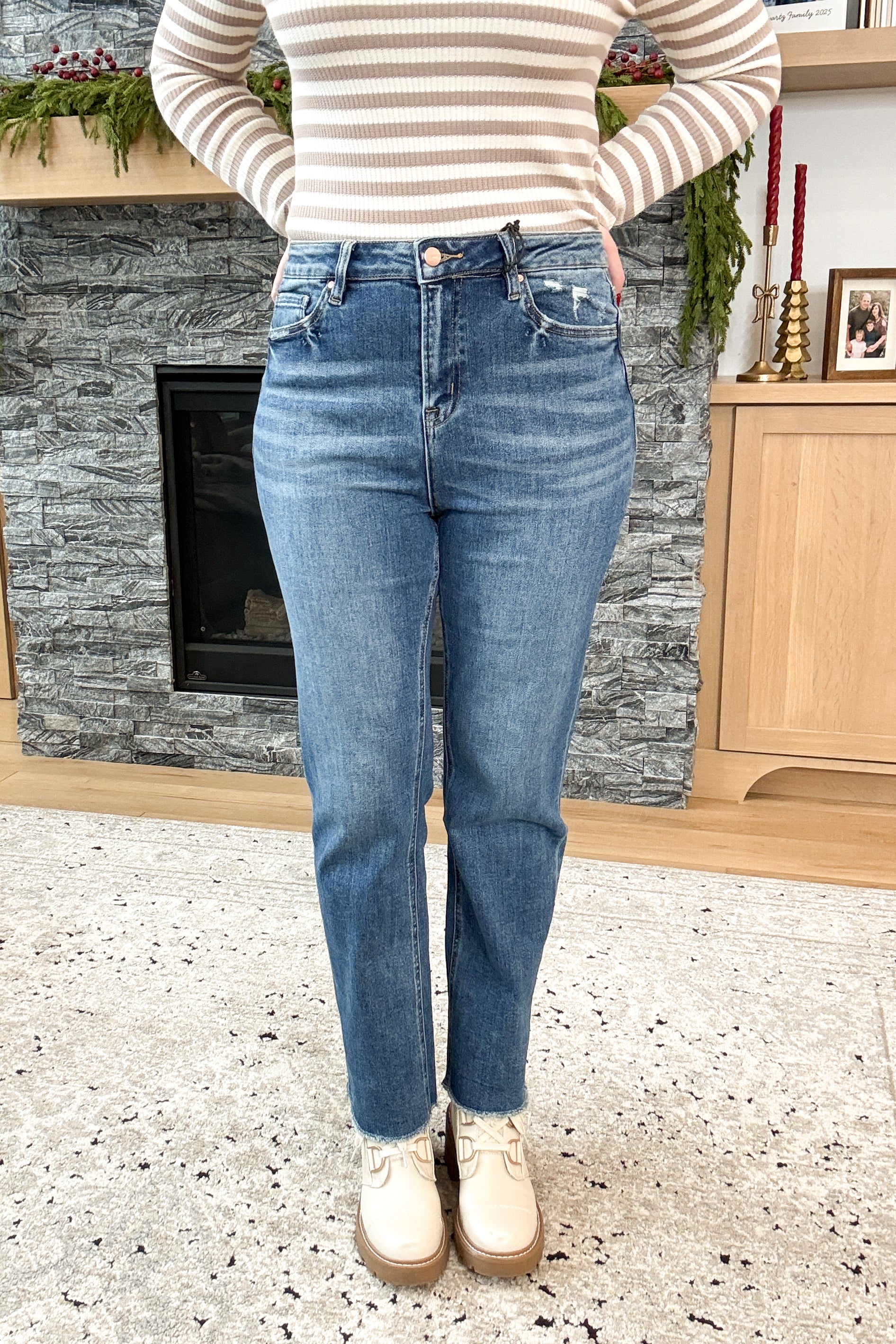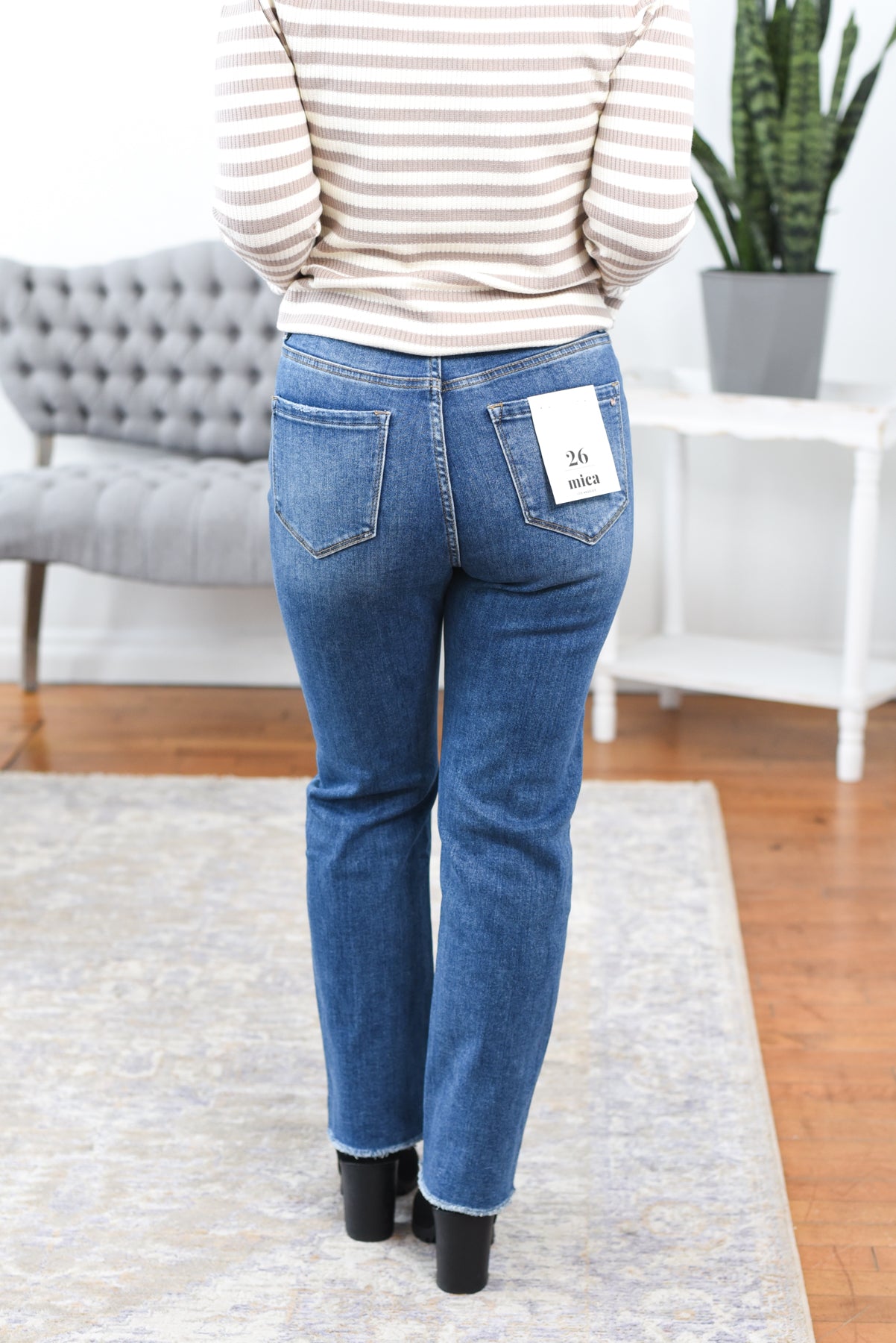 The Rachelle High Rise Straight Leg Ankle Mica Jeans are an effortless staple with just the right amount of detail. Made from Mica’s soft, stretchy denim with a comfortable lived-in feel, they feature a flattering high rise, medium wash, and ankle-length cut finished with a frayed edge hem and subtle contrast detailing. Easy, versatile, and perfect for everyday wear. Styling tip: Pair the Rachelle Jeans with a tucked-in sweater and ankle boots for a clean, casual-chic look.