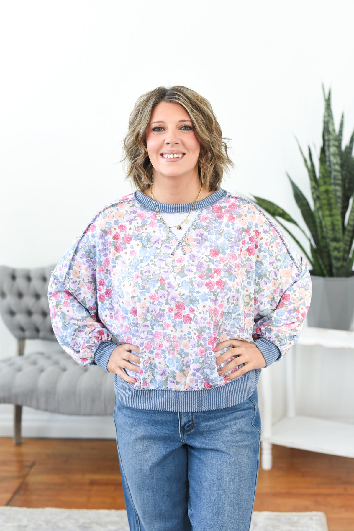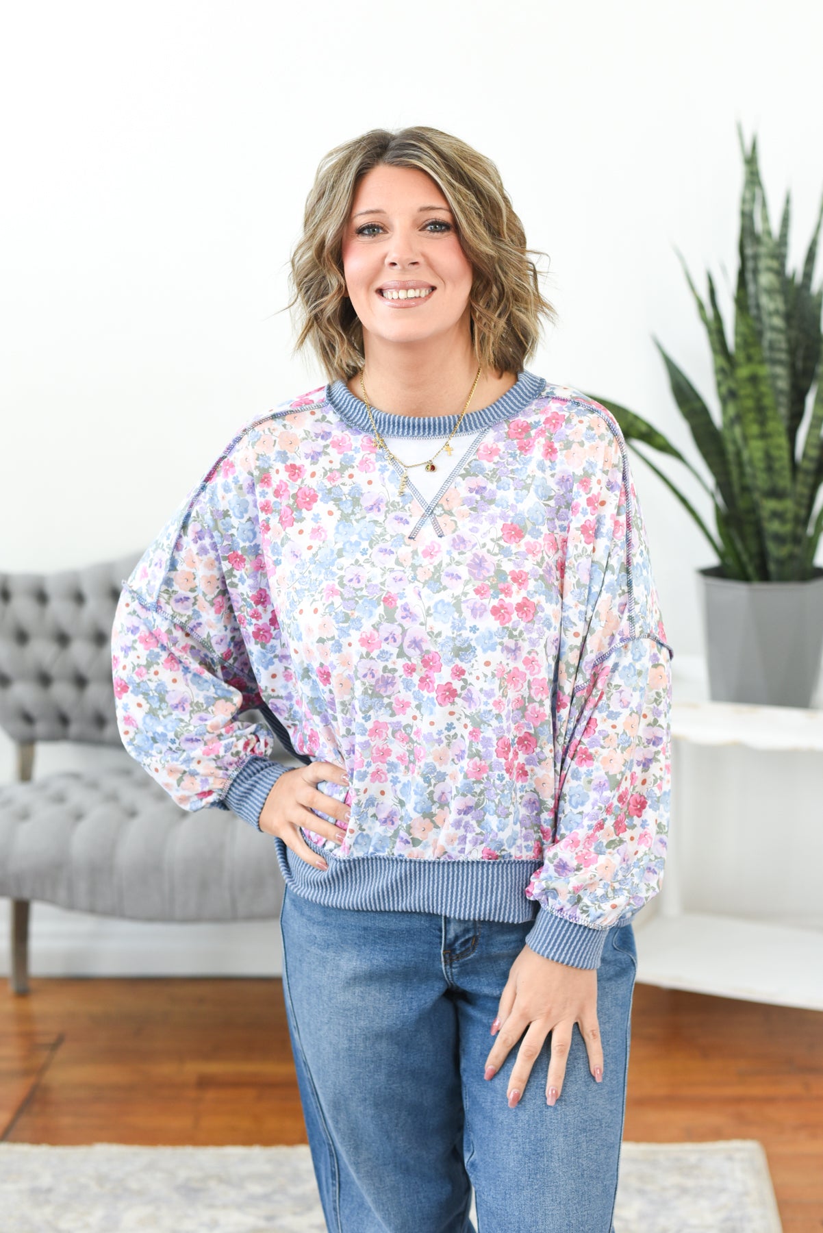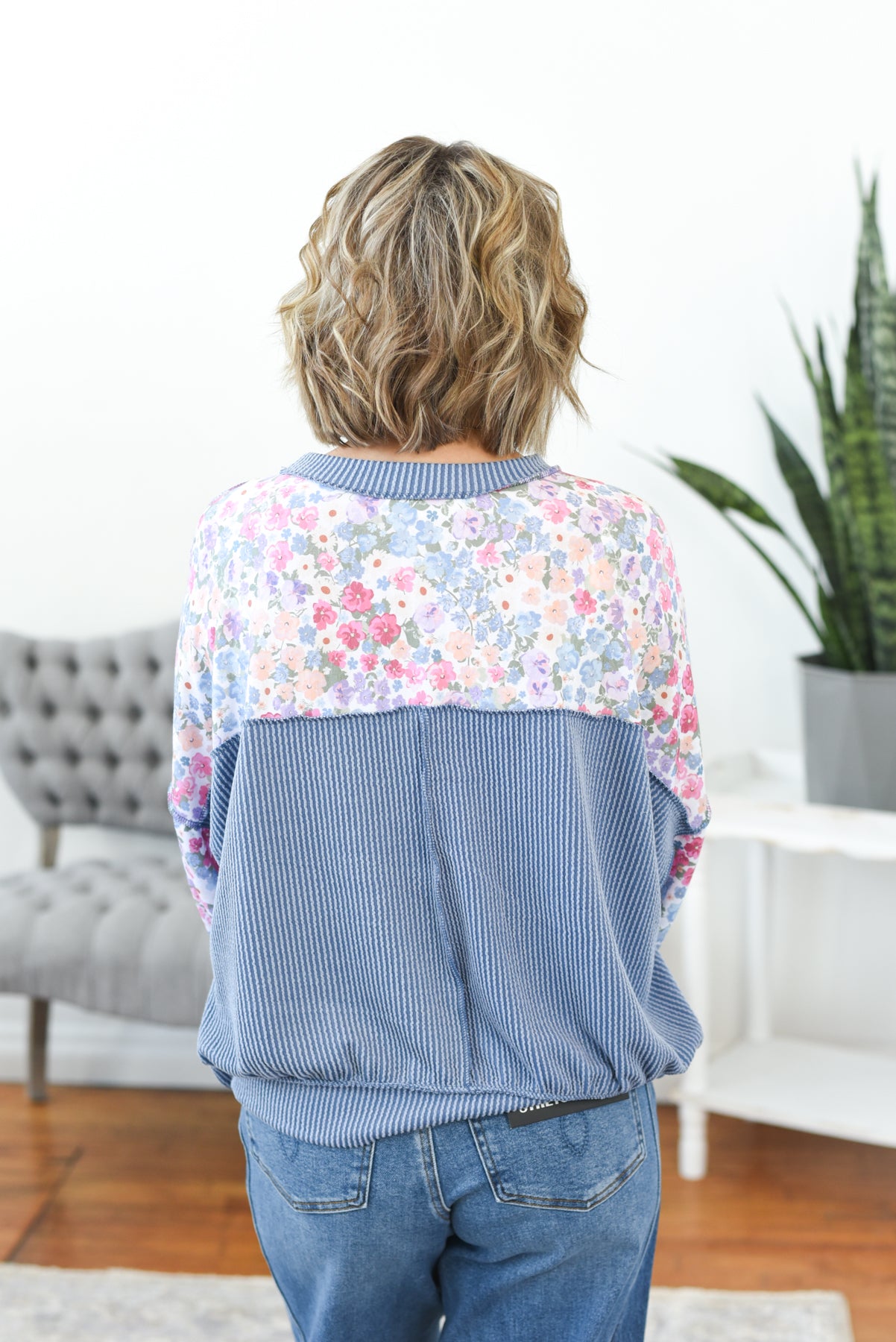 The Shannon Mixed Media Top is effortlessly cool with a free-spirited feel. Designed in a soft, stretchy fabric, it blends a pretty floral print with chunky ribbed knit for a textured, boho look. With its oversized boxy fit and drop shoulders, it’s comfortable, laid-back, and full of personality. Styling tip: Pair the Shannon Top with relaxed denim and sneakers for an easy, boho-inspired everyday outfit.