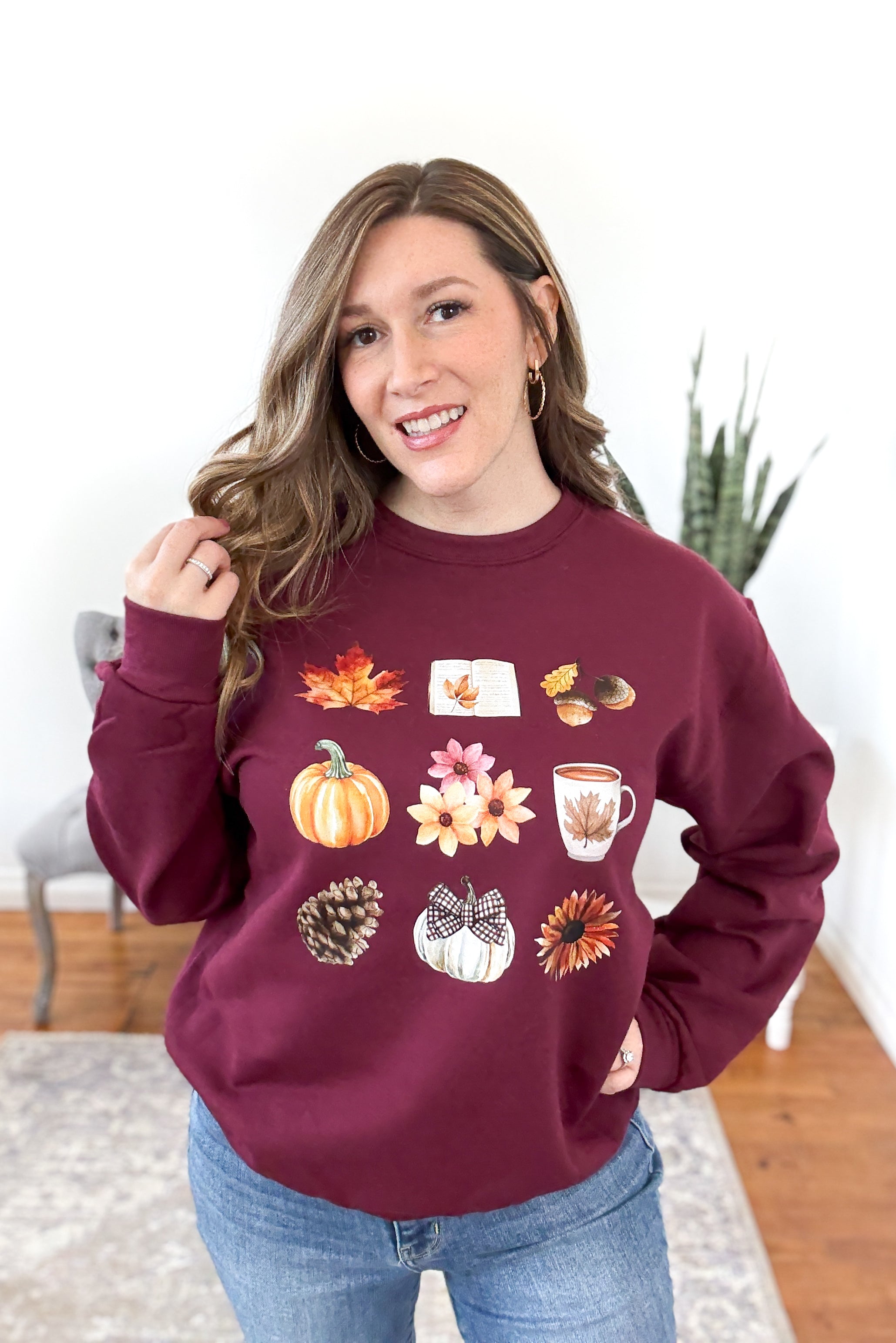 The Cozy Autumn Days Collage Pullover Sweatshirt wraps you in all the best parts of fall—no leaf raking required. Set on a rich maroon backdrop, this soft pullover features an adorable collage of autumn icons like pumpkins, coffee cups, acorns, leaves, and more. It's the kind of sweatshirt that makes you want to light a candle, sip something warm, and embrace all things cozy. Styling tip: Pair with your favorite jeans and booties for a perfect fall weekend look, or layer over leggings with fuzzy socks for ultimate stay-home vibes.