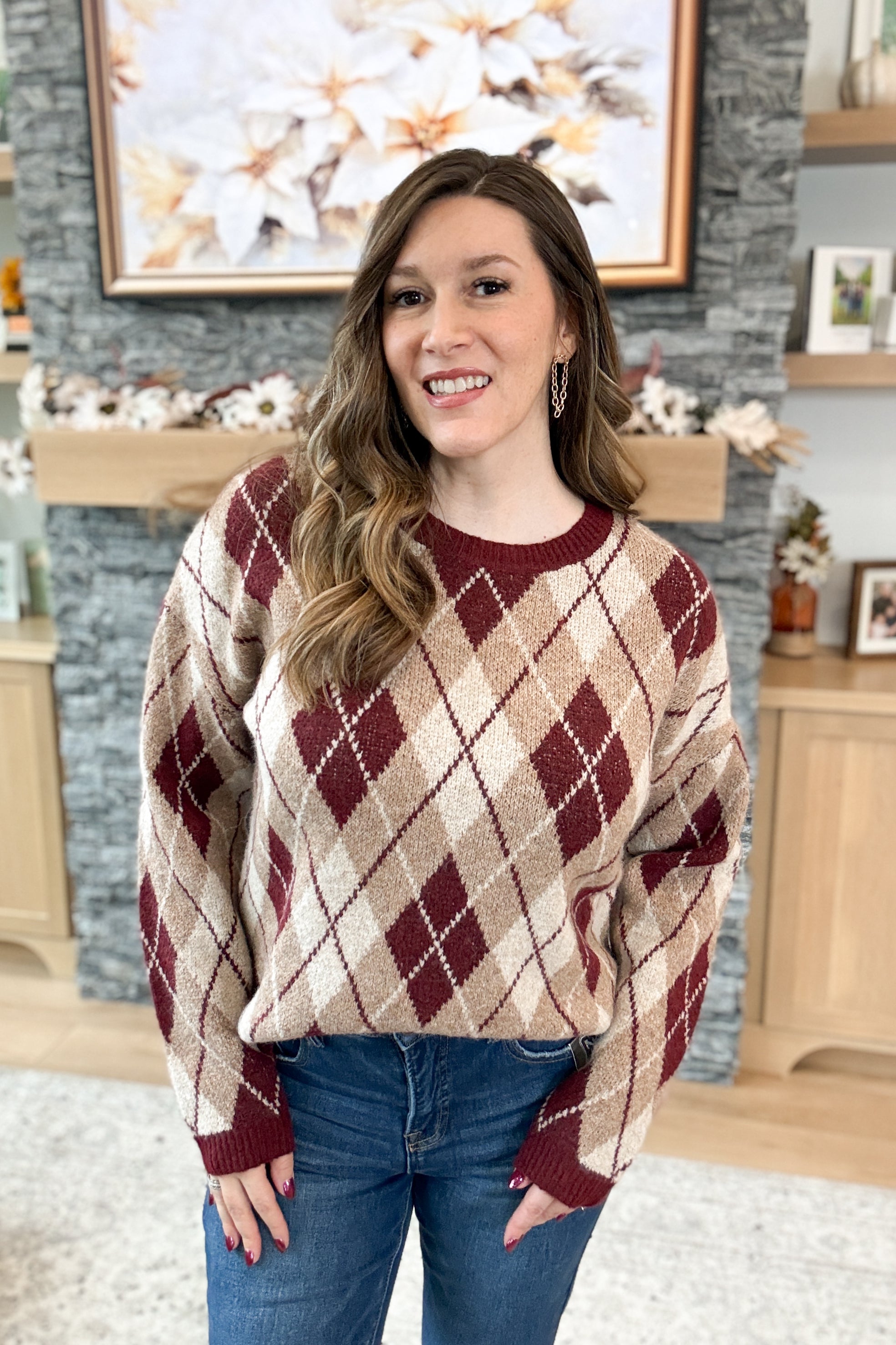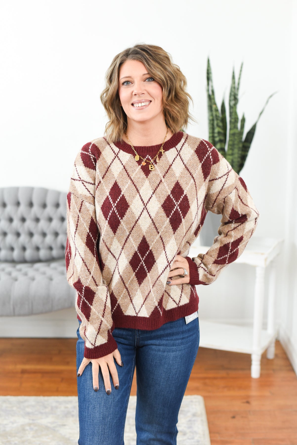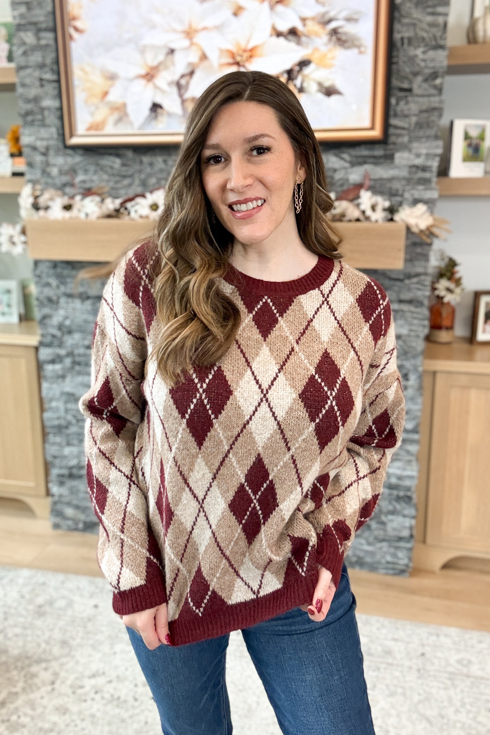 The Sorcha Argyle Sweater is a timeless favorite with a relaxed twist. Crafted from soft, stretchy sweater knit, it features a slightly oversized fit with side slits and a classic crew neckline. The argyle pattern adds just the right touch of vintage charm—perfect for cozy days or polished winter looks. Styling tip: Pair the Sorcha Sweater with straight-leg jeans and loafers for a chic, effortless vibe.