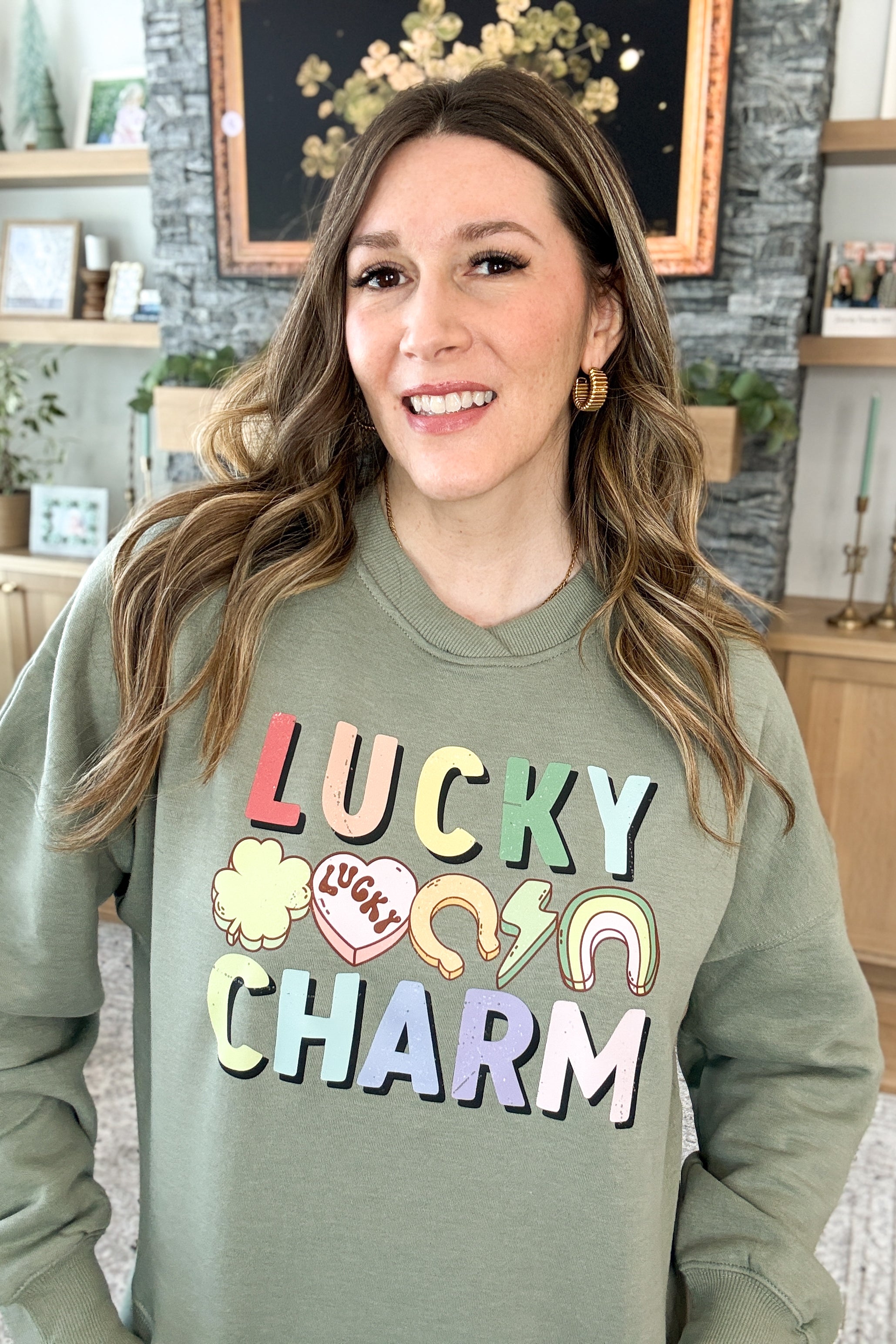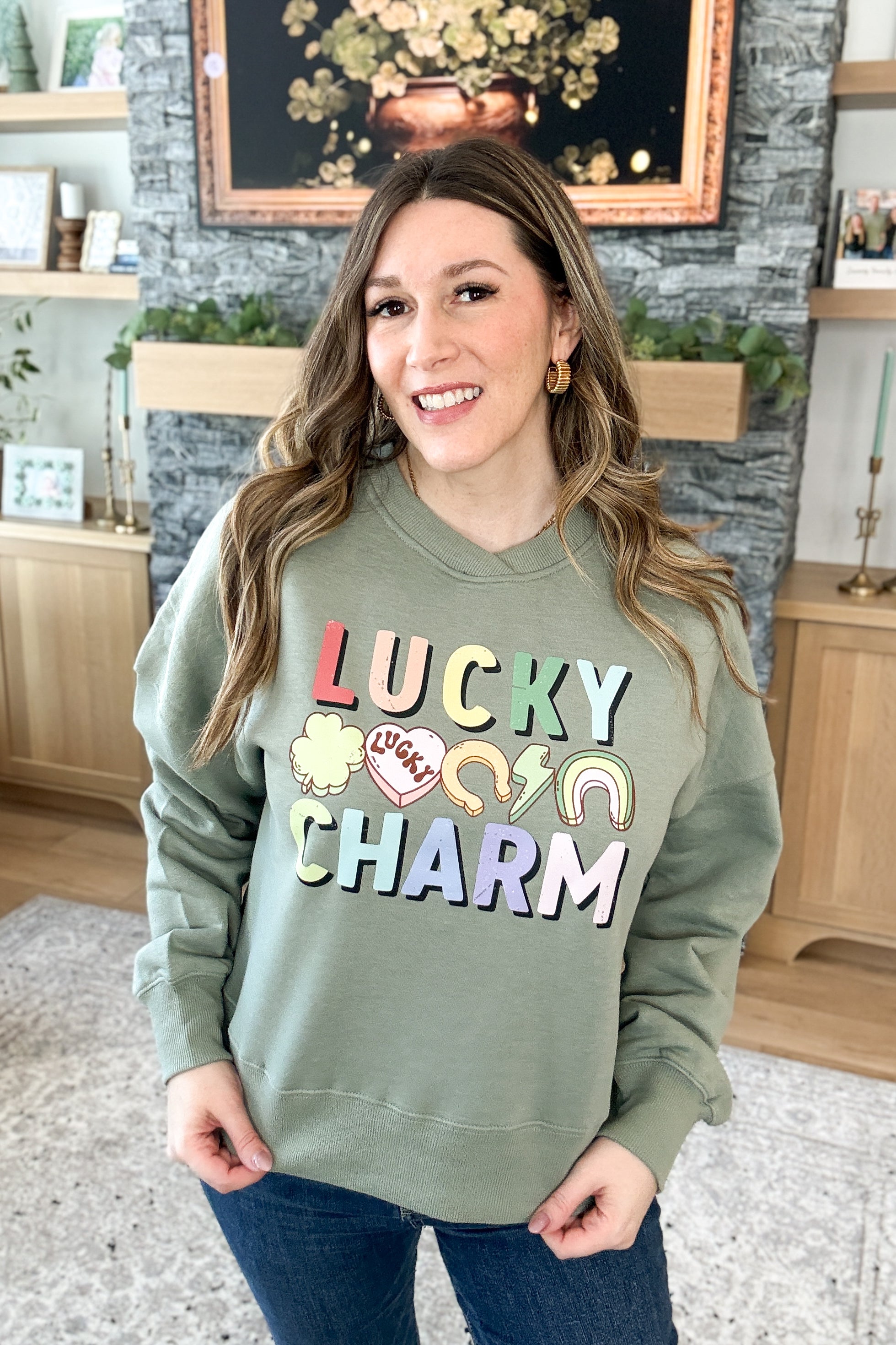 The Lucky Charms Pullover Sweatshirt brings festive fun with an elevated twist. Designed in a soft sage green with a colorful lucky charms graphic, it features a chic criss-cross crew neckline and a boxy, slightly oversized fit that feels both cozy and styled (yes, it's fleece lined!). Perfect for St. Patrick’s Day and cute enough to wear well beyond. Styling tip: Pair the Lucky Charms Sweatshirt with light wash denim and sneakers for an easy, lucky-day look. 🍀