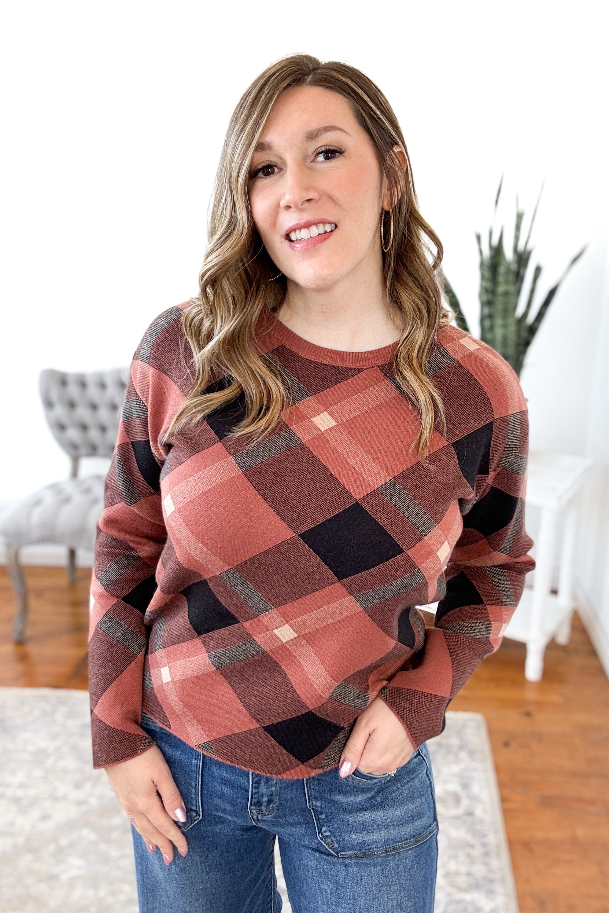 The Autum Checked Jacquard Sweater Knit Top is fall fashion wrapped in cozy sophistication. Featuring a timeless checkered print in rich autumn tones, this soft and stretchy jacquard knit top offers a classic crewneck silhouette with just the right touch of polish. It’s the kind of piece that feels seasonal without being over-the-top—perfect for workdays, weekends, and everything in between. Styling tip: Tuck into dark denim with loafers for a preppy fall vibe, or layer under a blazer with wide-leg trousers for a chic, office-ready look.