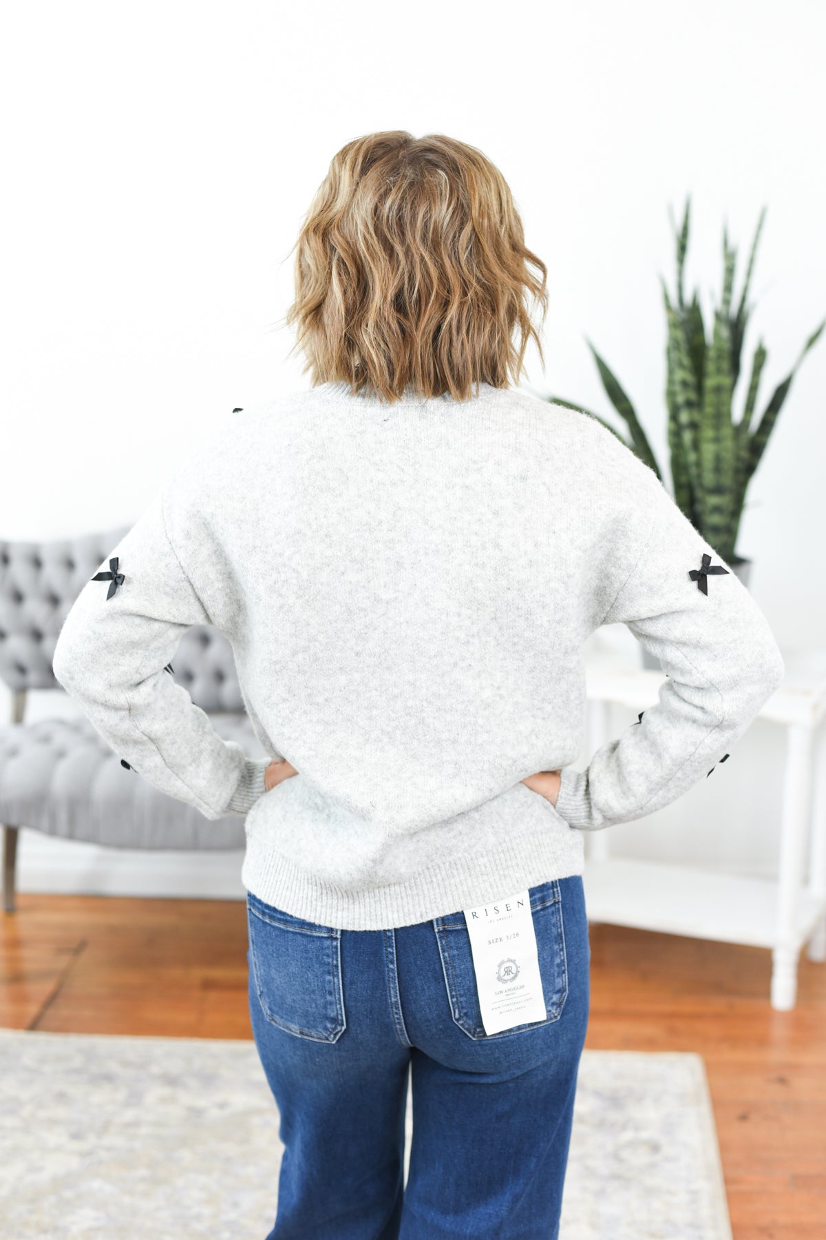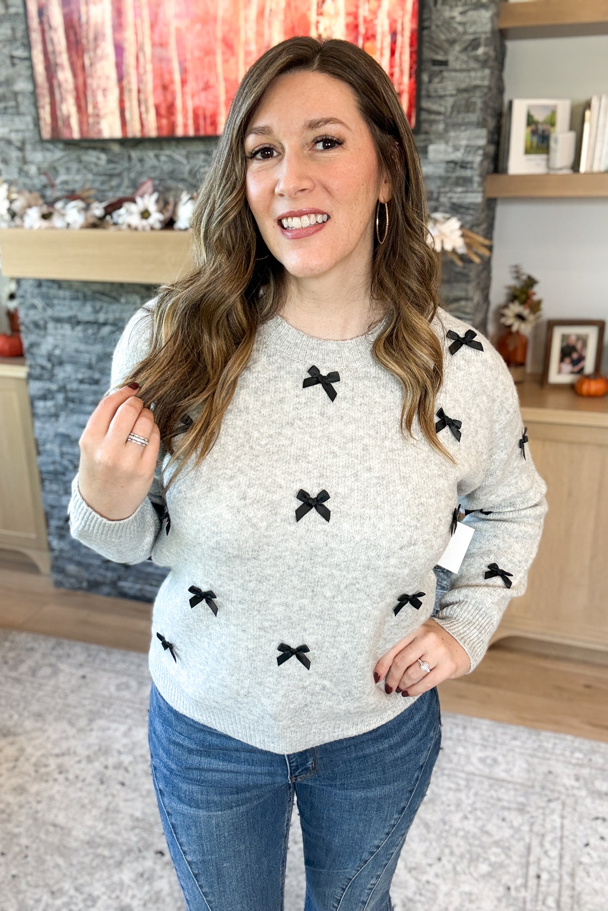 The Clara Bow Accented Sweater is equal parts sweet and sophisticated. Made from ultra-soft, stretchy sweater knit in a soft grey hue, it features delicate black bow details that add a playful, feminine touch. Perfect for holiday gatherings, office days, or dinner out—this sweater brings just the right amount of charm to any look. Styling tip: Pair the Clara Sweater with black trousers and heels for an elevated outfit, or dress it down with jeans and ballet flats for effortless chic.