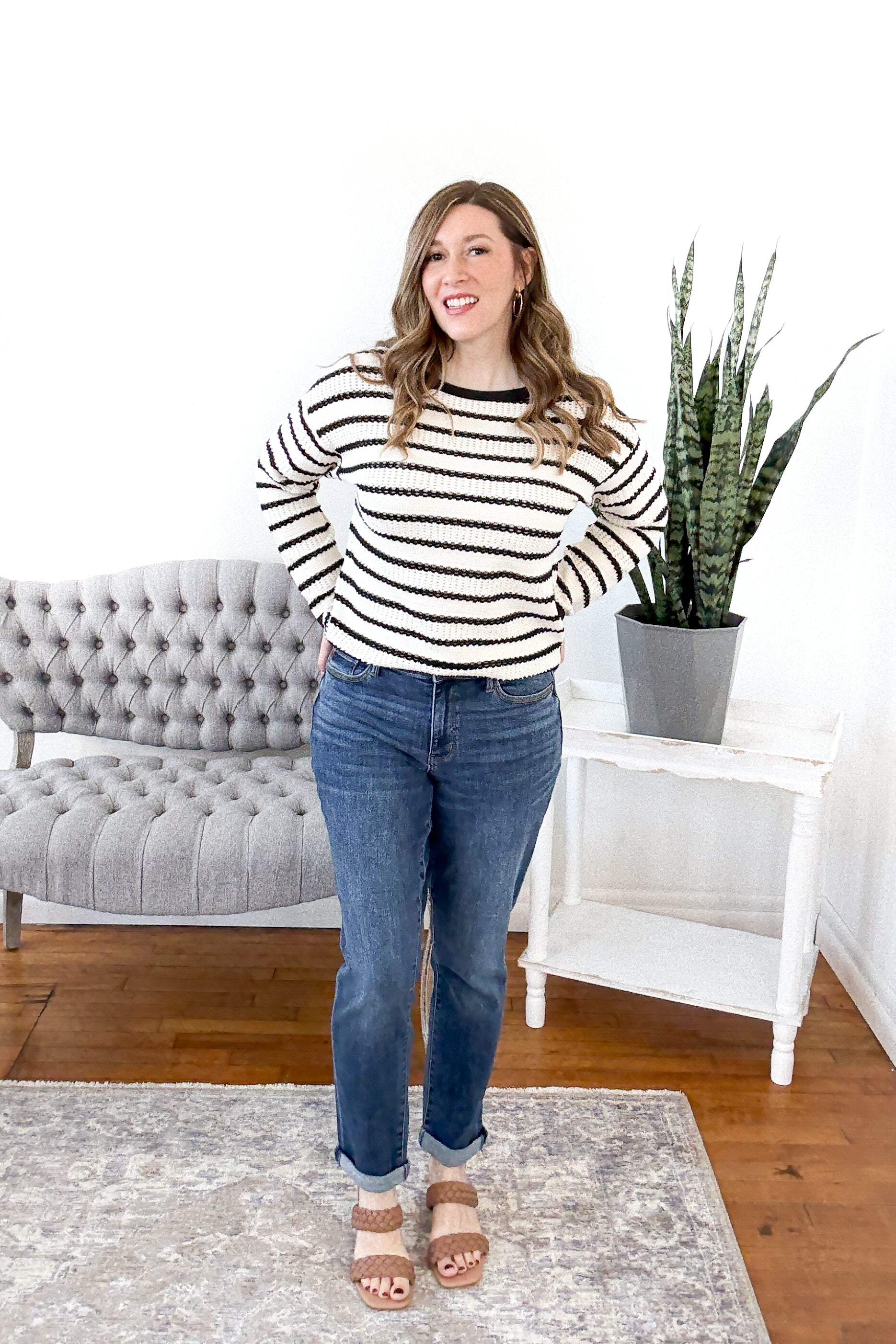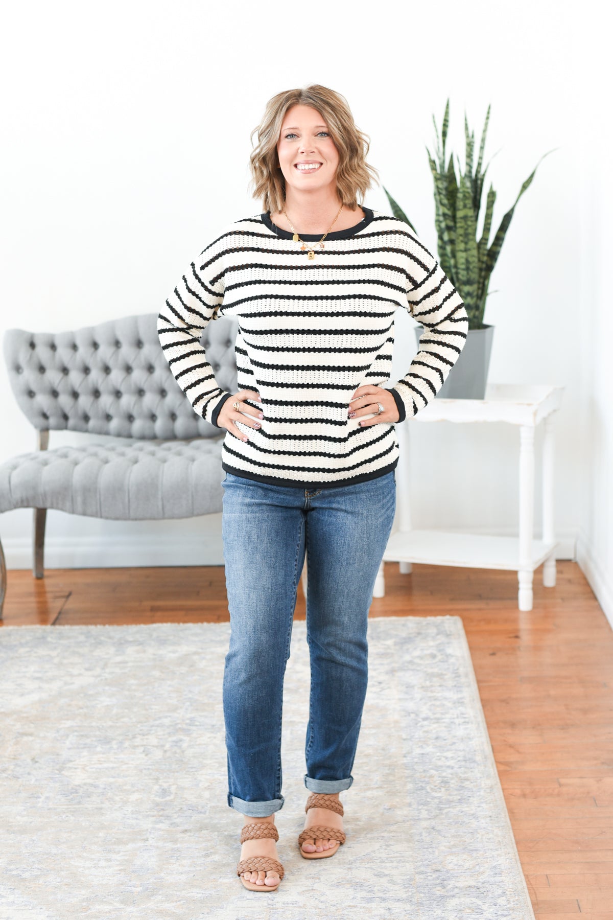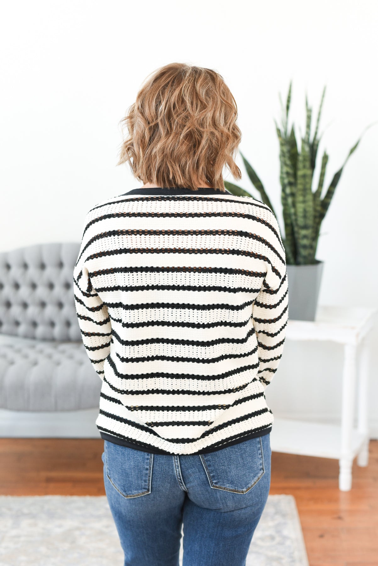The Ellery Striped Open Knit Sweater is the effortlessly cool layer your closet’s been craving. With classic black and white stripes and a soft, breathable open knit design, this sweater brings just the right mix of laid-back and chic. Perfect for transitional weather, it’s made to pair with your favorite basics—think tanks, bralettes, or camis—while adding texture and style to any outfit. Styling tip: Layer over a fitted black tank with distressed denim and loafers for an off-duty look, or wear with high-rise trousers and a sleek bun for easy elegance.