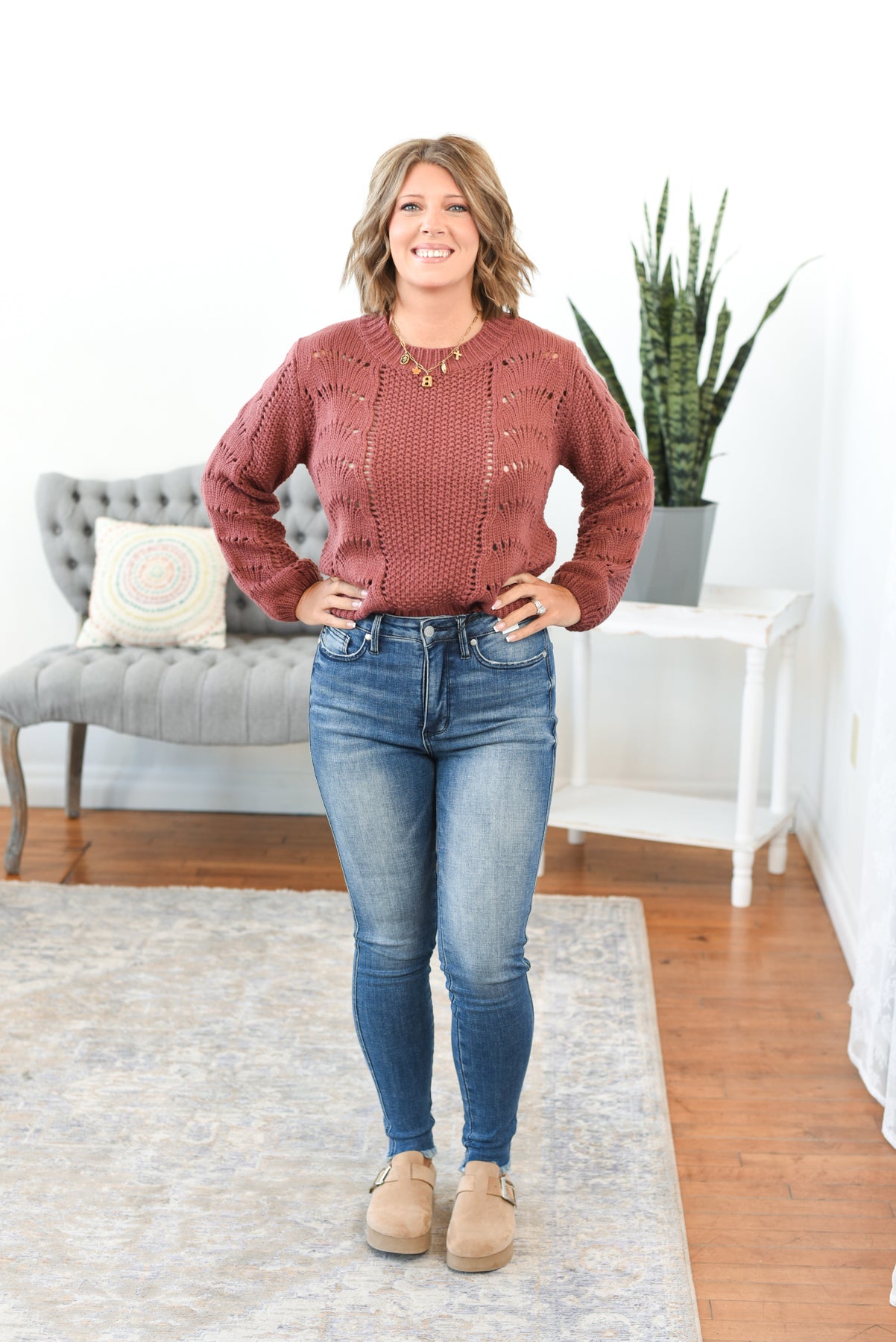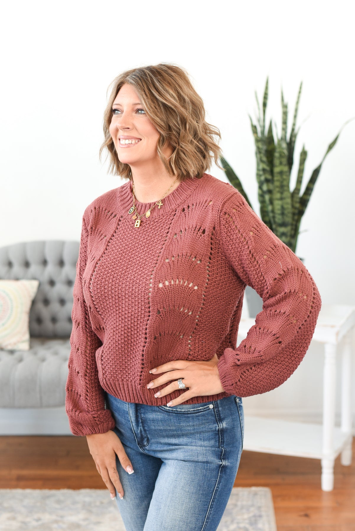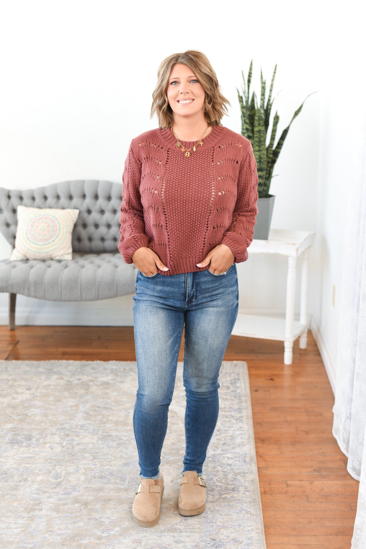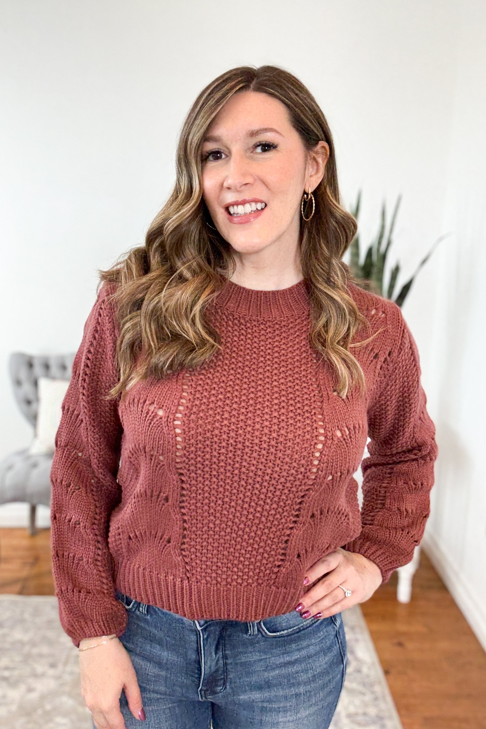 The Jennie Scallop Crochet Open Knit Sweater is a delicate blend of cozy and charm. Featuring a beautifully scalloped crochet design in an open knit pattern, this waist-length sweater adds texture and a touch of whimsy to your wardrobe. Crafted from soft, stretchy sweater knit fabric with a classic crew neckline and fit, it’s perfect for layering over tanks or bralettes as the temps shift. Styling tip: Pair with high-rise jeans and ankle boots for a cozy-chic fall look, or layer over a slip dress for an effortlessly romantic vibe.
