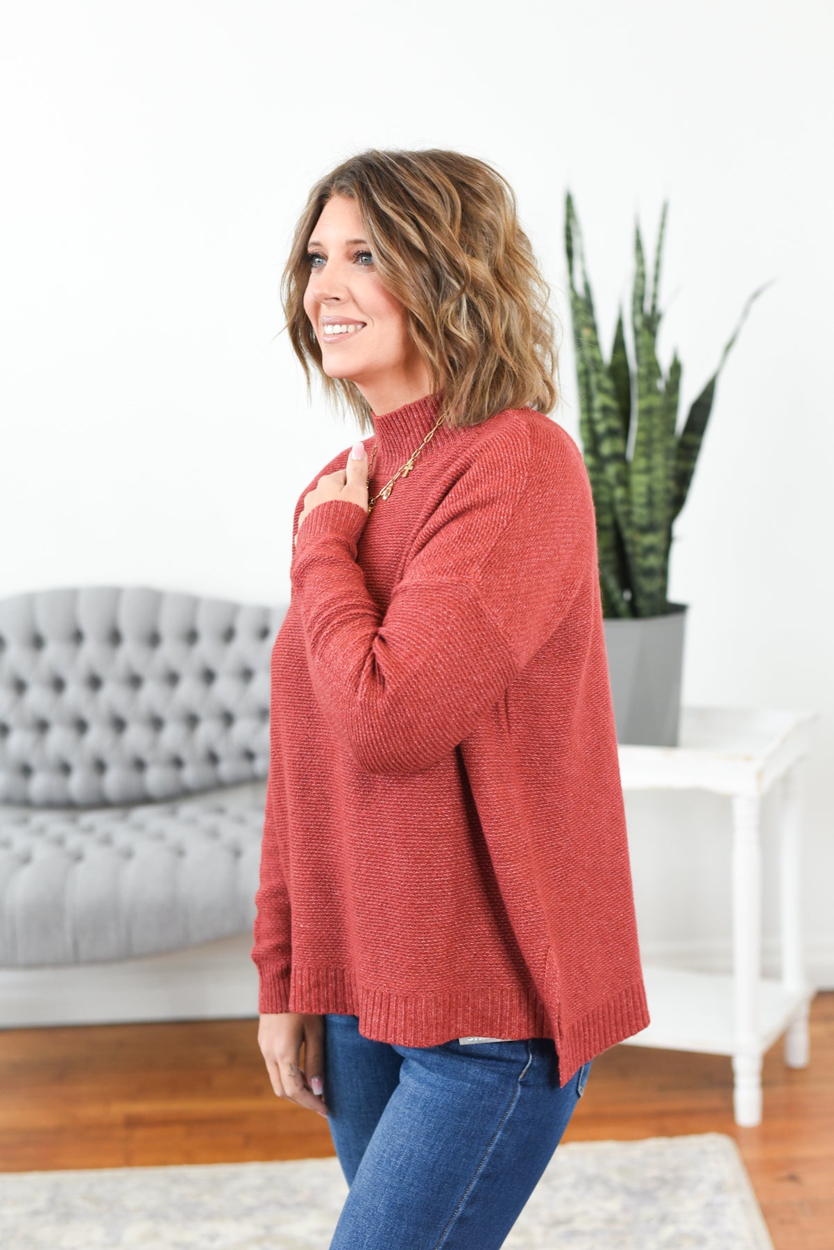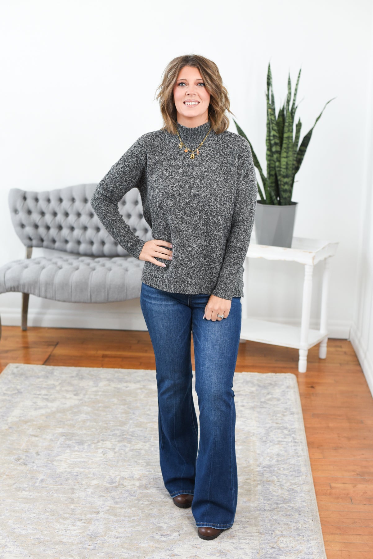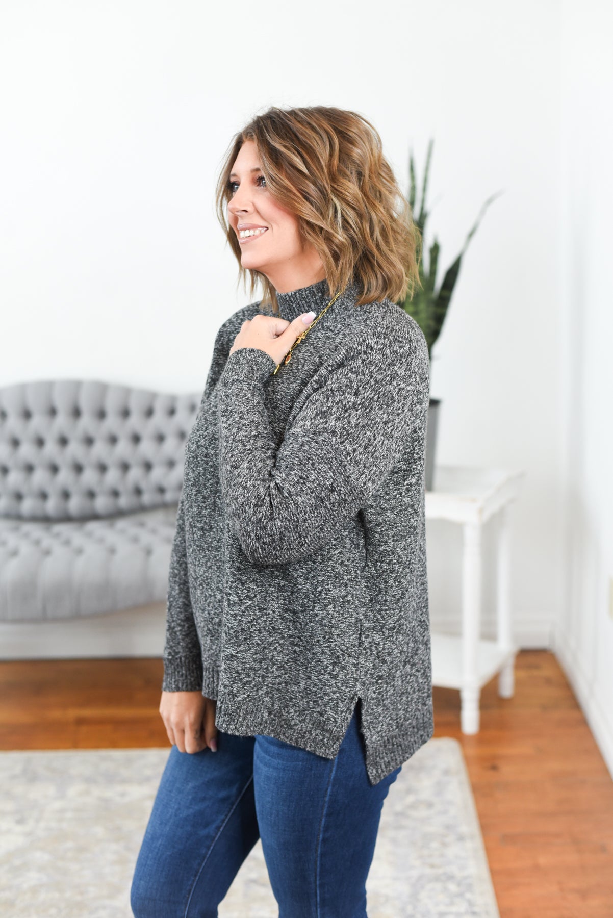 The Laura Ribbed Mock Neck Sweater is effortless, lightweight, and endlessly wearable. Crafted from soft, stretchy ribbed knit with a marled finish, it features a relaxed boxy fit, side slits, and a classic mock neck for a polished touch. Perfect for layering or wearing solo through every season. Styling tip: Pair the Laura Sweater with straight-leg jeans and loafers for an easy, elevated everyday look.