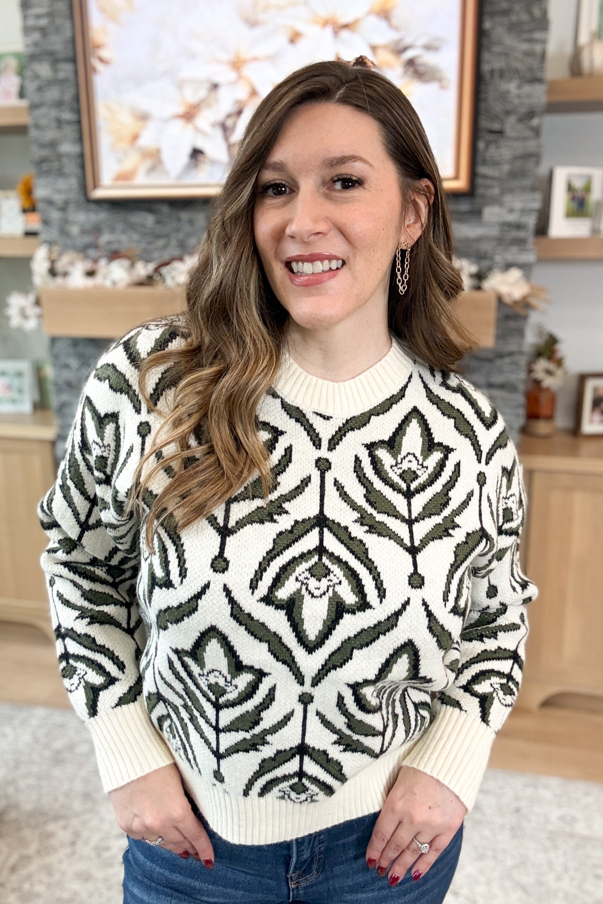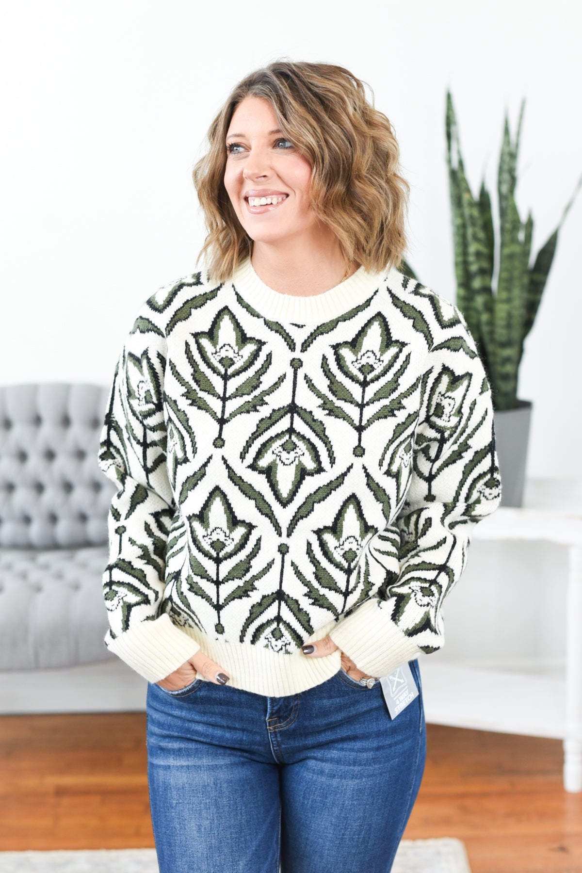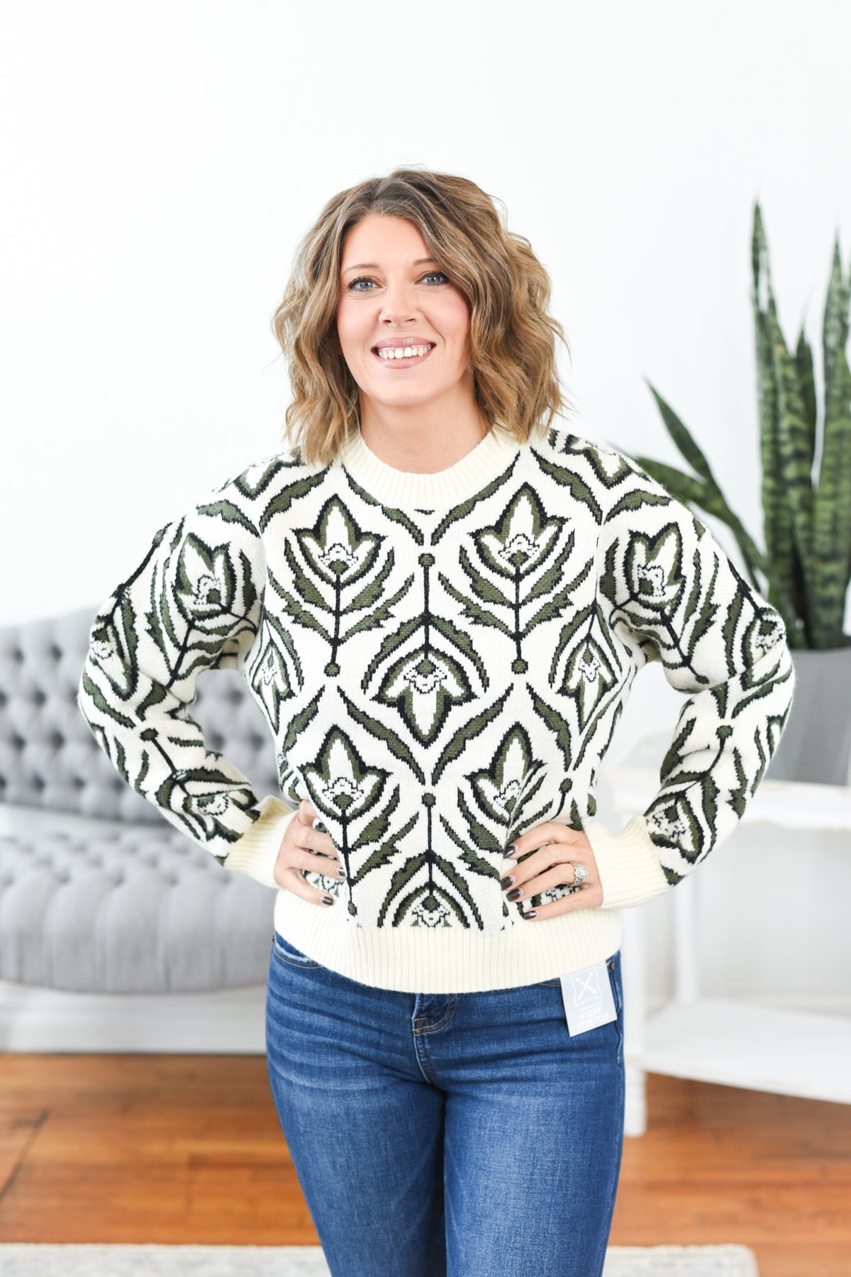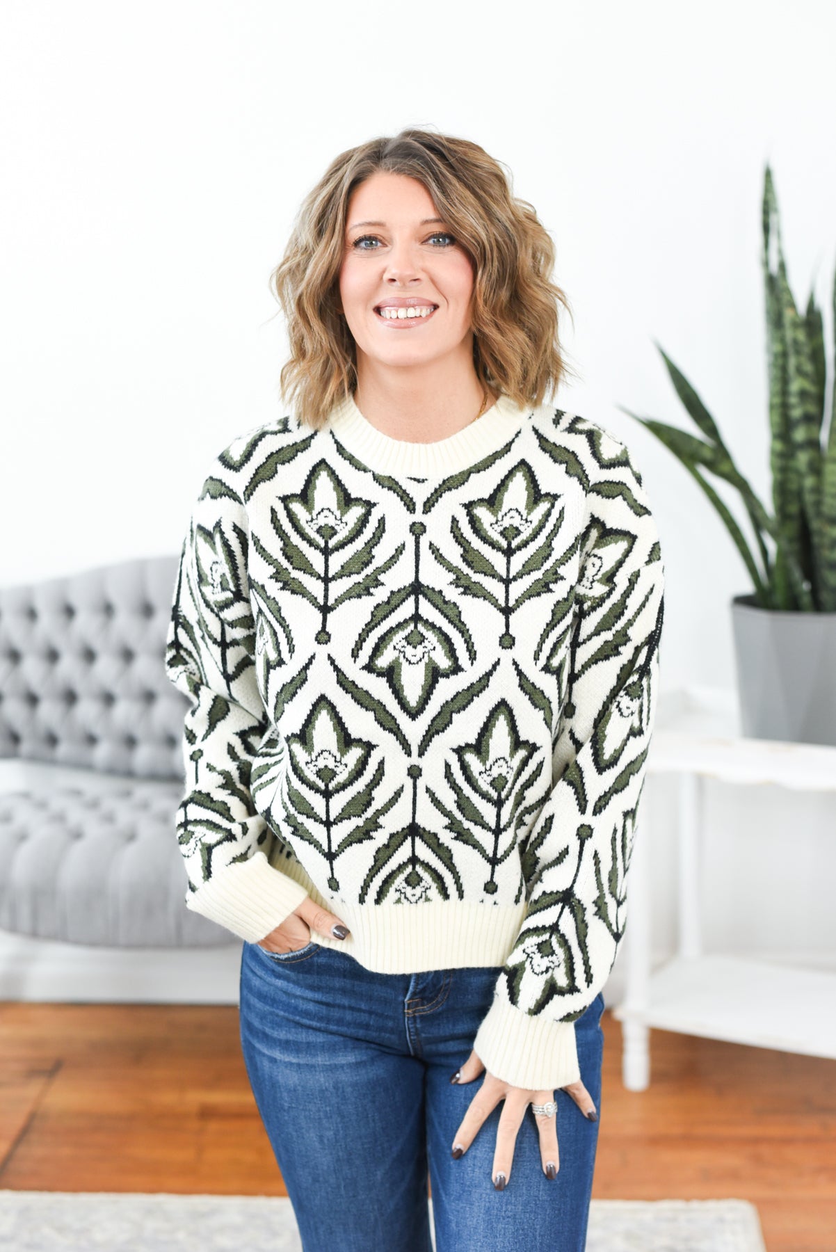 The Olivia Abstract Floral Sweater is where cozy meets modern style. Featuring an eye-catching abstract floral design in olive and black on a soft cream backdrop, this medium-weight knit is perfect for chilly days. Warm, stylish, and effortlessly wearable—it’s the sweater that makes winter dressing feel easy. Styling tip: Pair the Olivia Sweater with black denim and ankle boots for a polished, cold-weather look.
