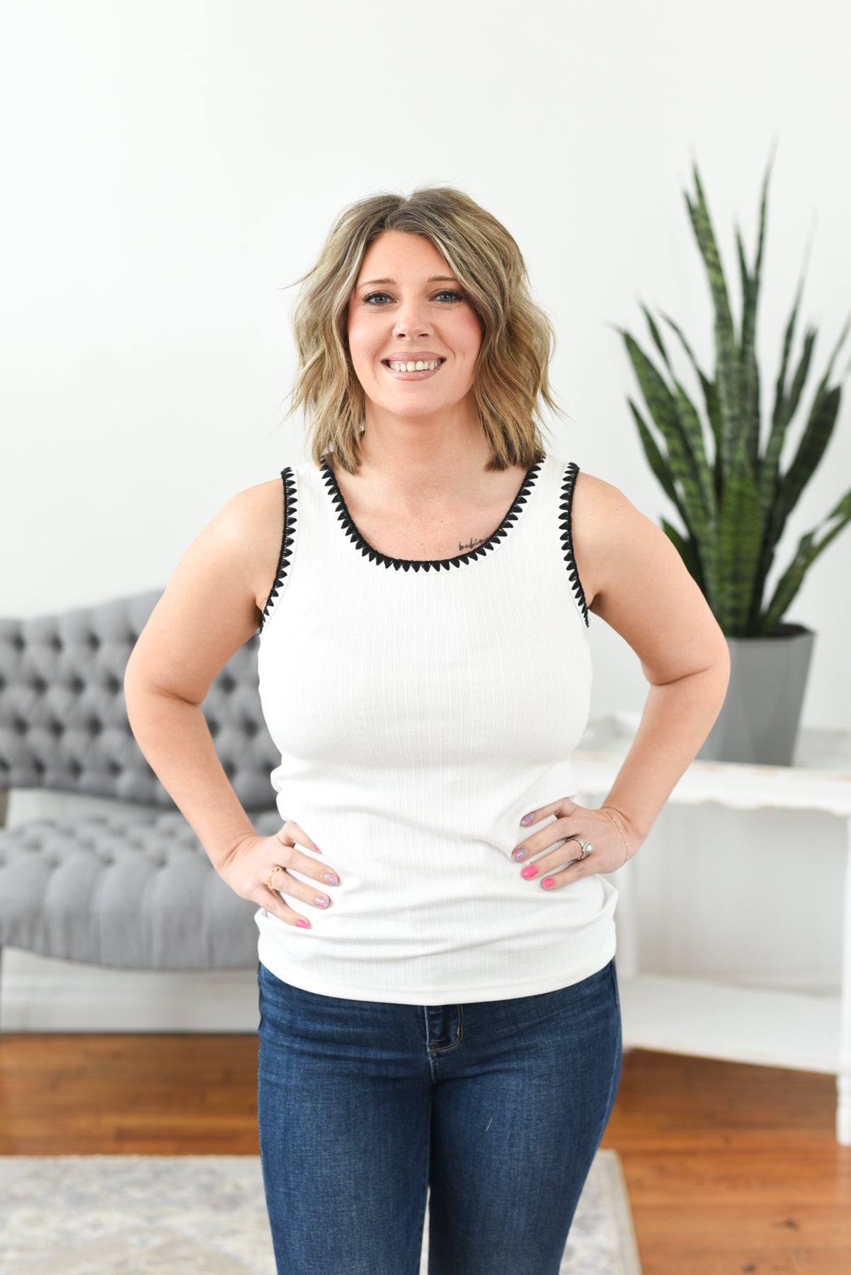 The Fenella Ribbed Stitch Trim Tank Top is a flattering basic with just the right amount of detail. Designed in a soft, stretchy ribbed knit, this lightweight tank features a scoop neckline and fitted silhouette that’s perfect for layering or wearing on its own. The pico blanket stitch trim adds a subtle, elevated touch that sets it apart from your everyday tank. Comfortable, versatile, and easy to style, it’s a must-have staple for warm-weather outfits.