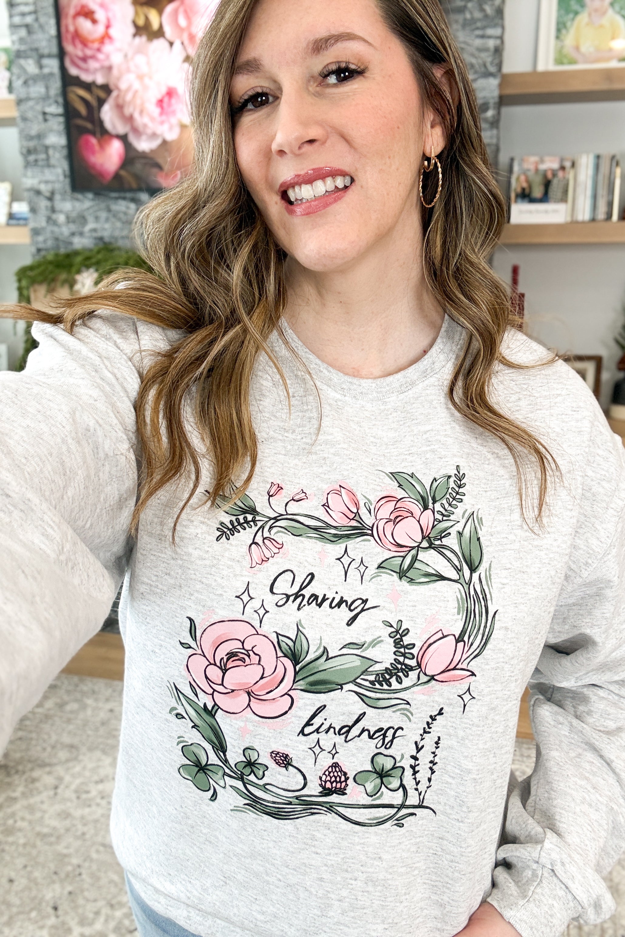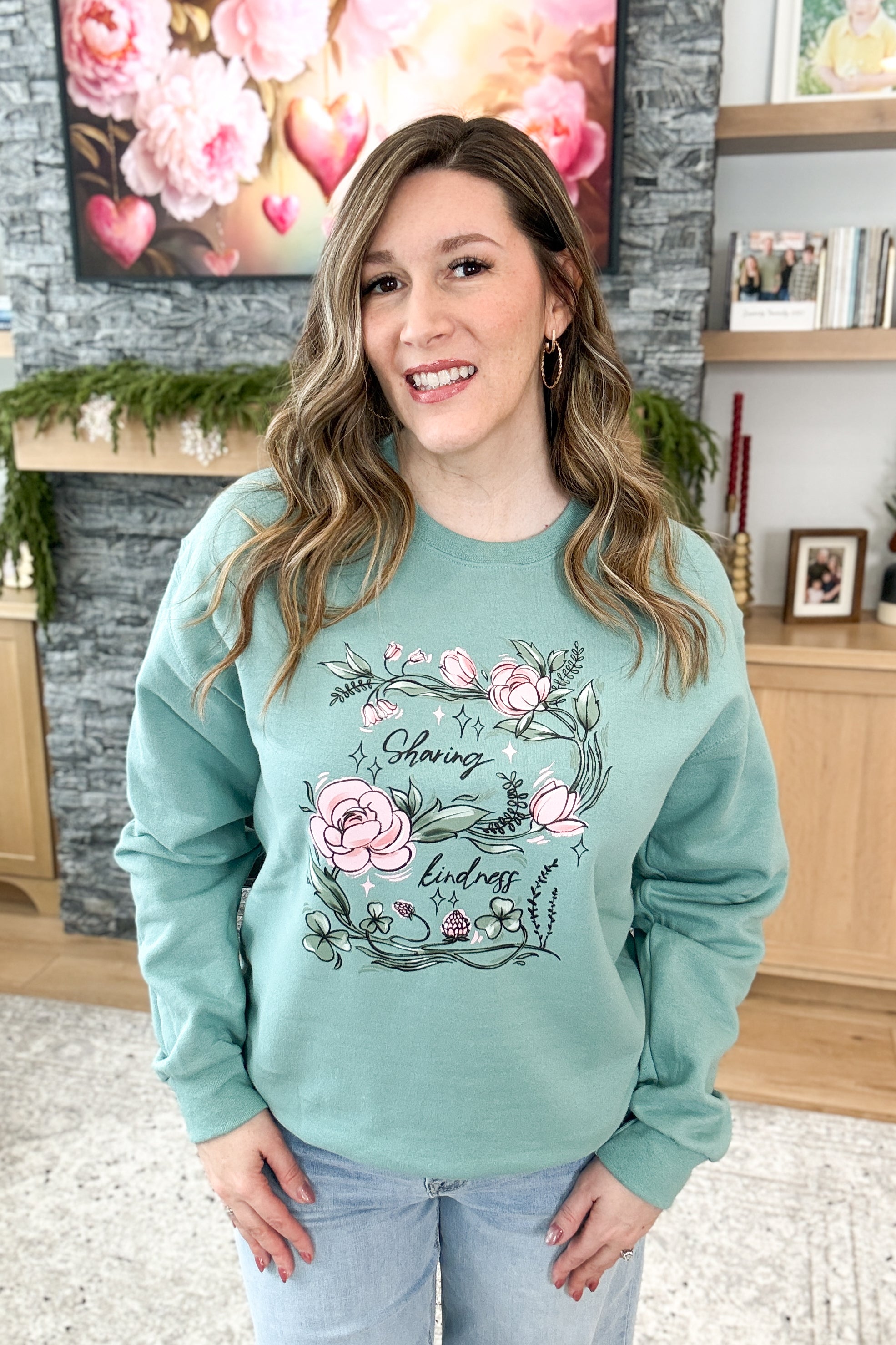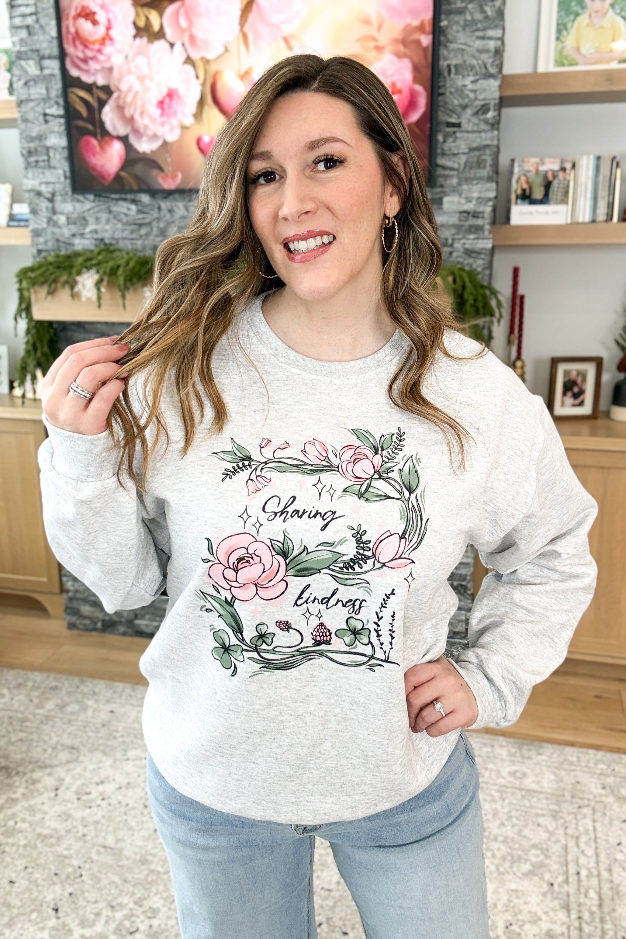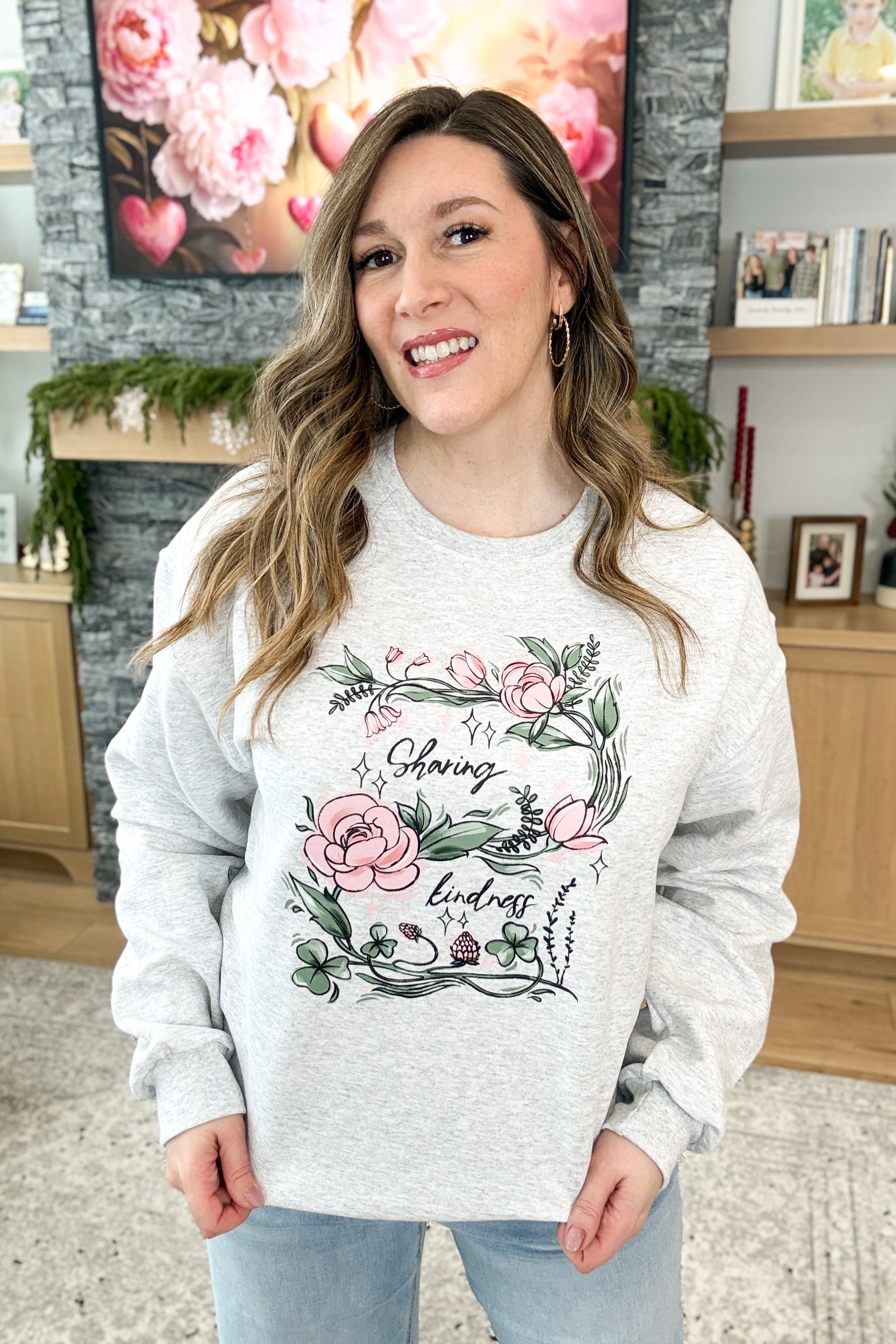The Sharing Kindness Pullover Sweatshirt is cozy, uplifting, and made to spread a little love. Designed in sage green or classic grey, this fleece-lined sweatshirt features a delicate pink and green floral graphic with the inspiring message “sharing kindness.” Soft, stretchy, and comforting—perfect for everyday wear with heart. Styling tip: Pair the Sharing Kindness Sweatshirt with leggings and sneakers for an easy, feel-good look you’ll want to wear on repeat.