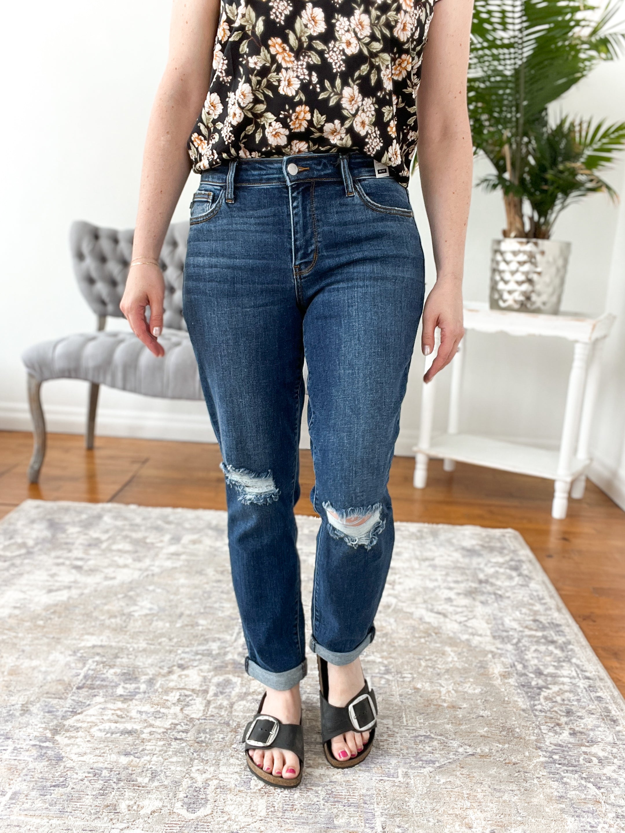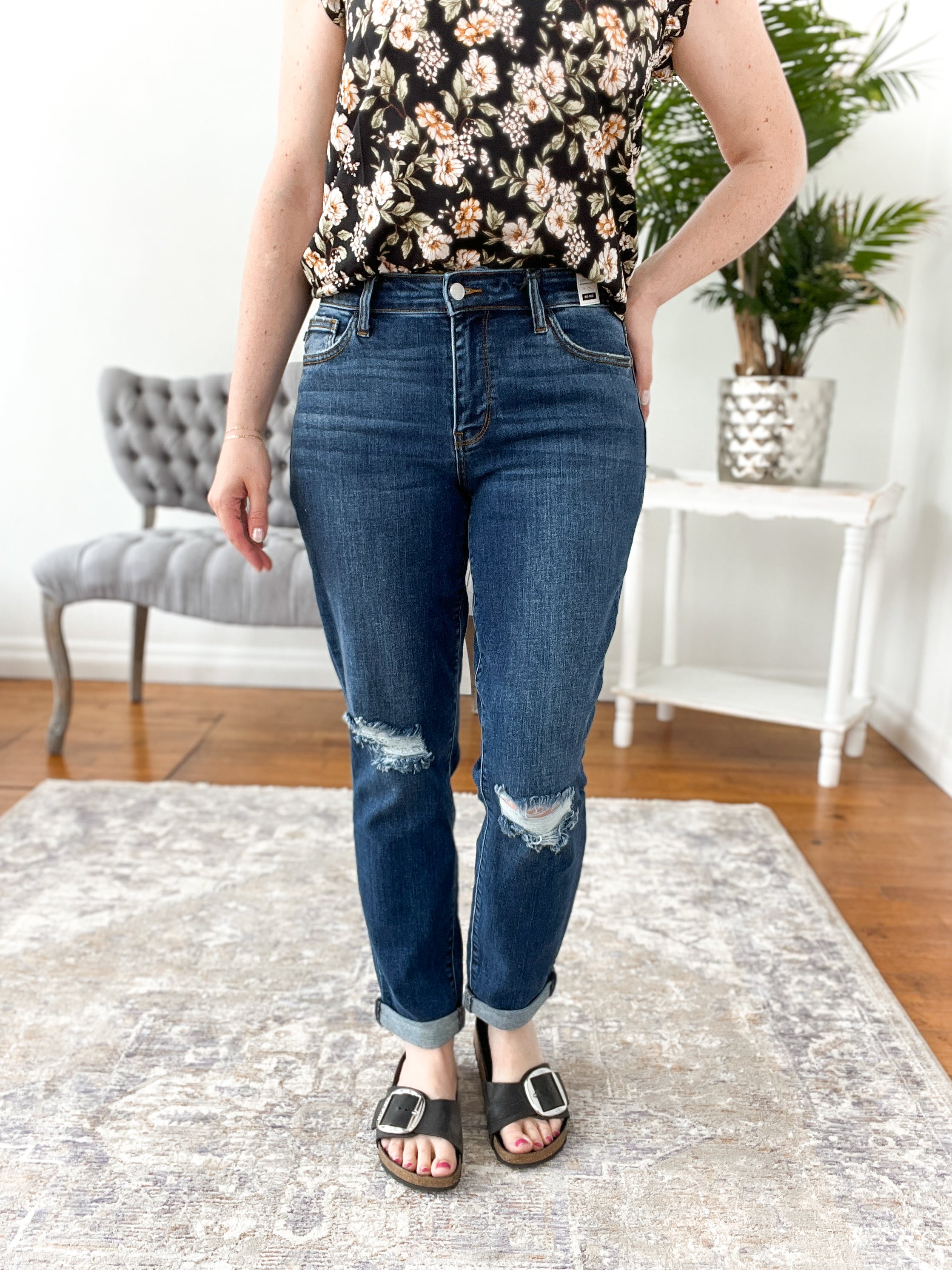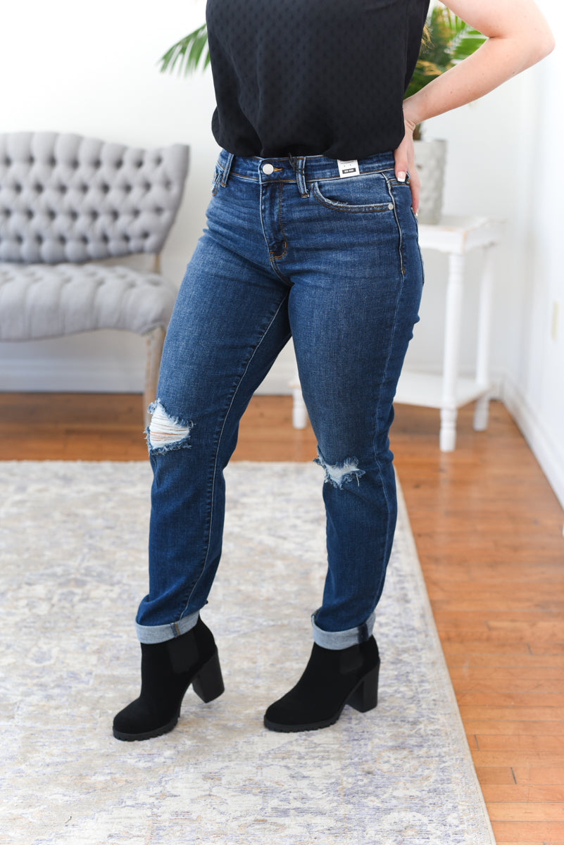 The new Candance Mid-Rise Slim Straight Judy Blue Jeans are bound to be your new fav pair. Candace features Judy Blue's typical soft and stretchy denim material, a flattering mid-rise, a gorgeous dark-wash that goes with everything, and light distressing in the knees. Style these jeans cuffed with a sandal during the warmer months and uncuffed with a bootie during the colder months.