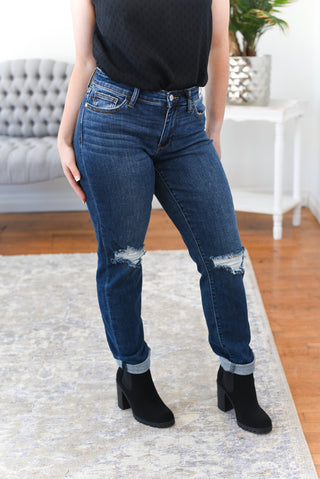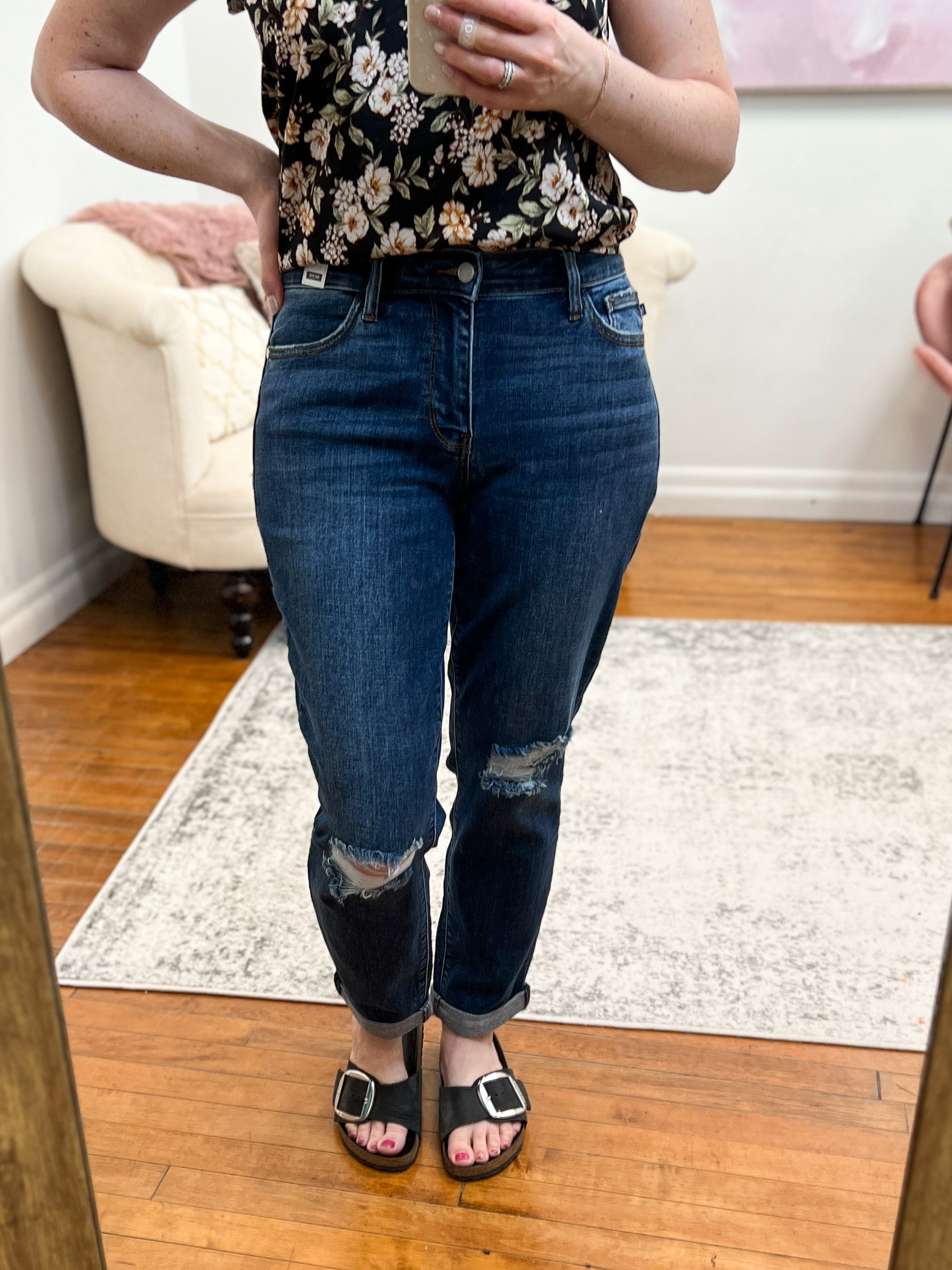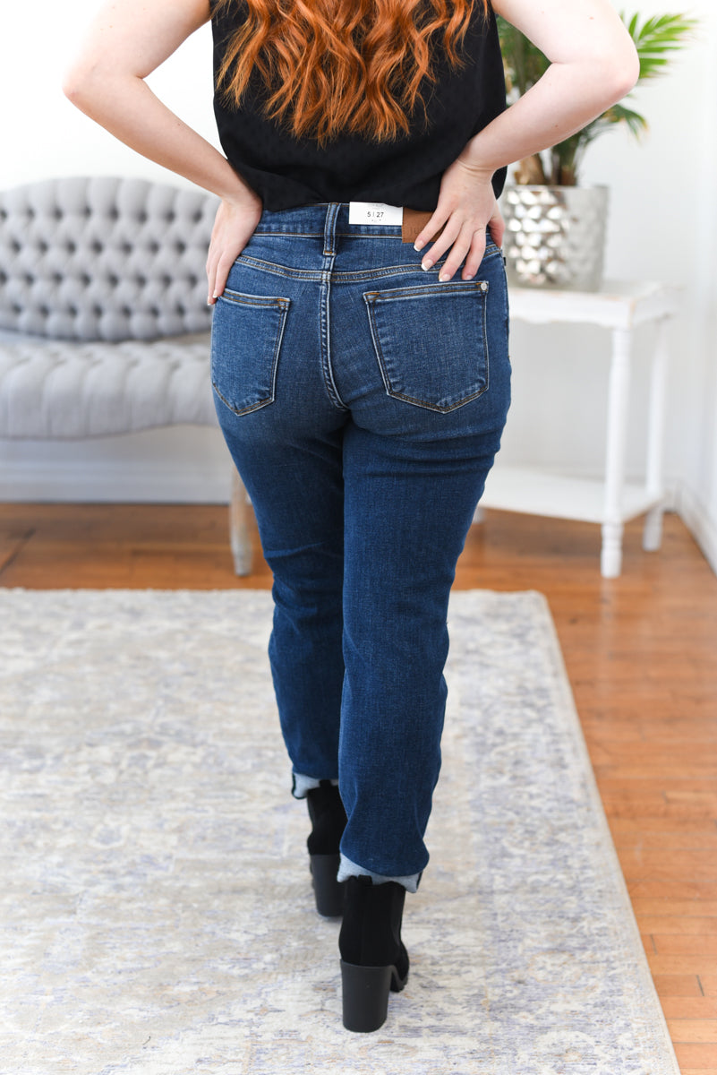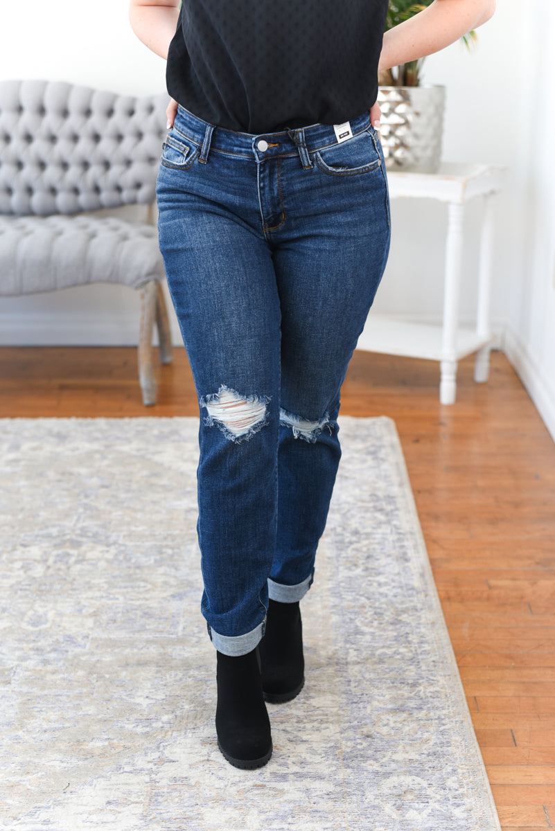 The new Candance Mid-Rise Slim Straight Judy Blue Jeans are bound to be your new fav pair. Candace features Judy Blue's typical soft and stretchy denim material, a flattering mid-rise, a gorgeous dark-wash that goes with everything, and light distressing in the knees. Style these jeans cuffed with a sandal during the warmer months and uncuffed with a bootie during the colder months.