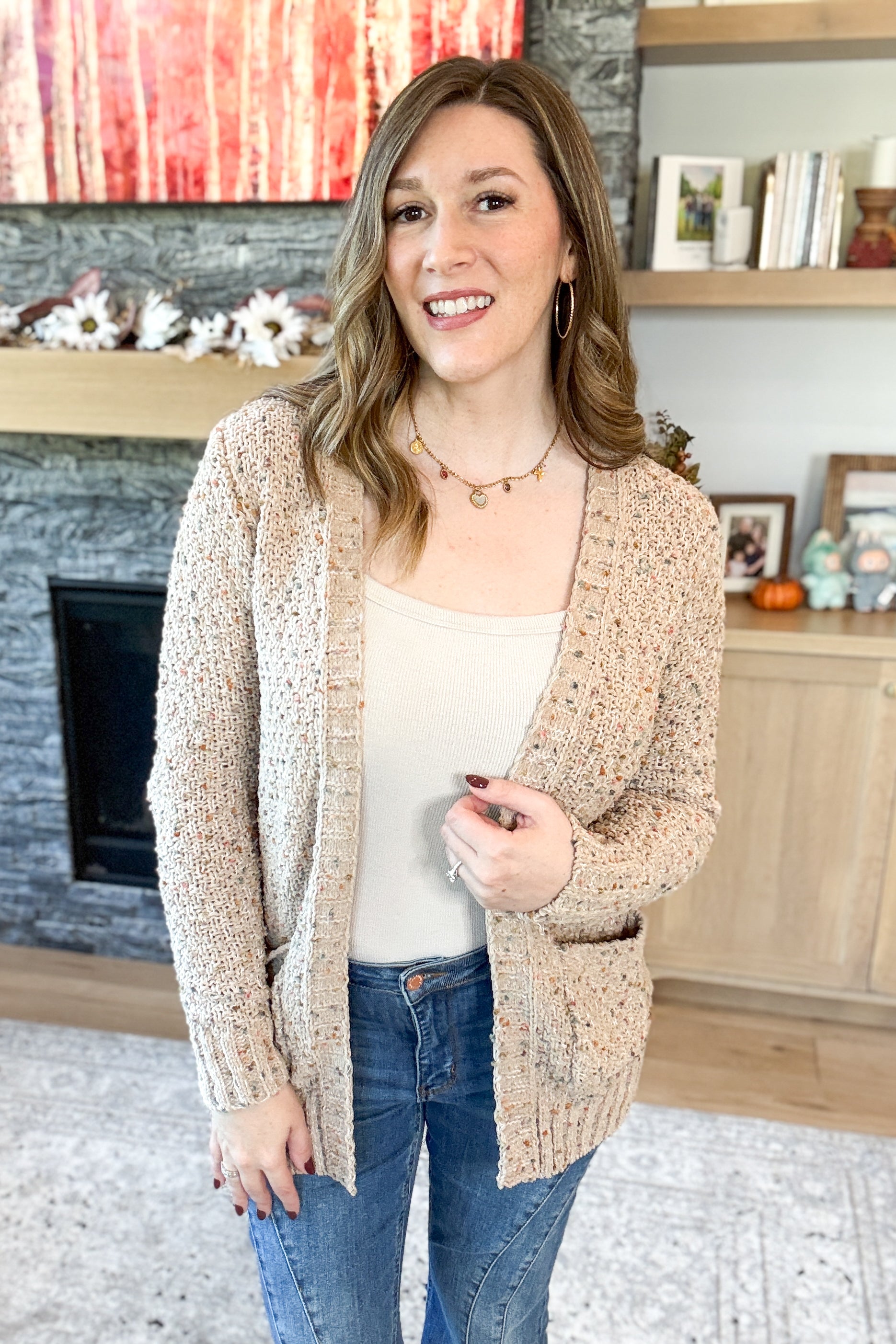 The Rosaline Multi Color Popcorn Knit Cardigan is cozy, colorful, and full of charm. Made from ultra-soft and plush popcorn knit fabric, this longer-length open cardigan features front pockets and a relaxed fit that’s perfect for layering. The ivory base is sprinkled with cheerful multicolored yarns, giving it a playful twist on a cold-weather classic. Whether you're lounging or layering up for a day out, it’s the cardigan that brings comfort and joy in every stitch. Styling tip: Throw it over a basic tee with leggings and boots for cozy weekend vibes, or pair with a fitted turtleneck and jeans for a pop of texture and color.